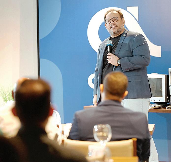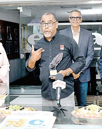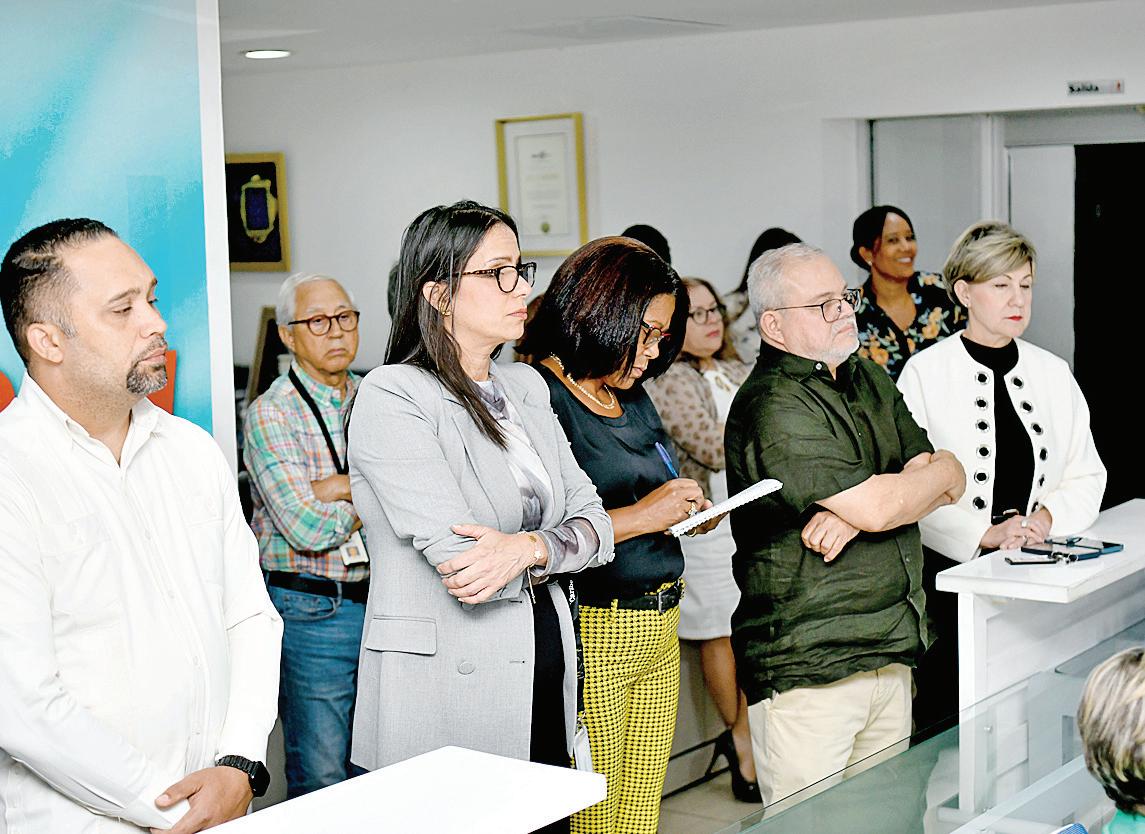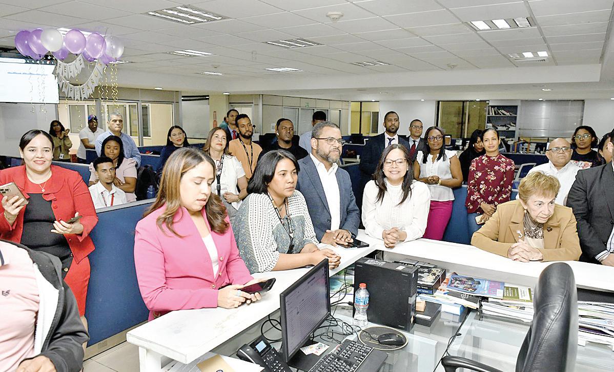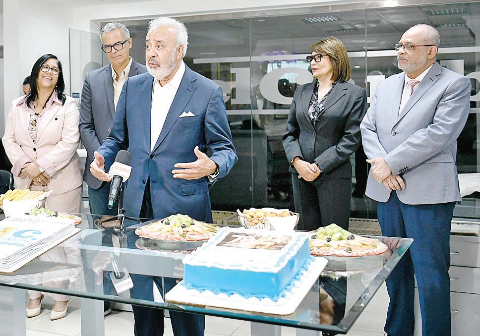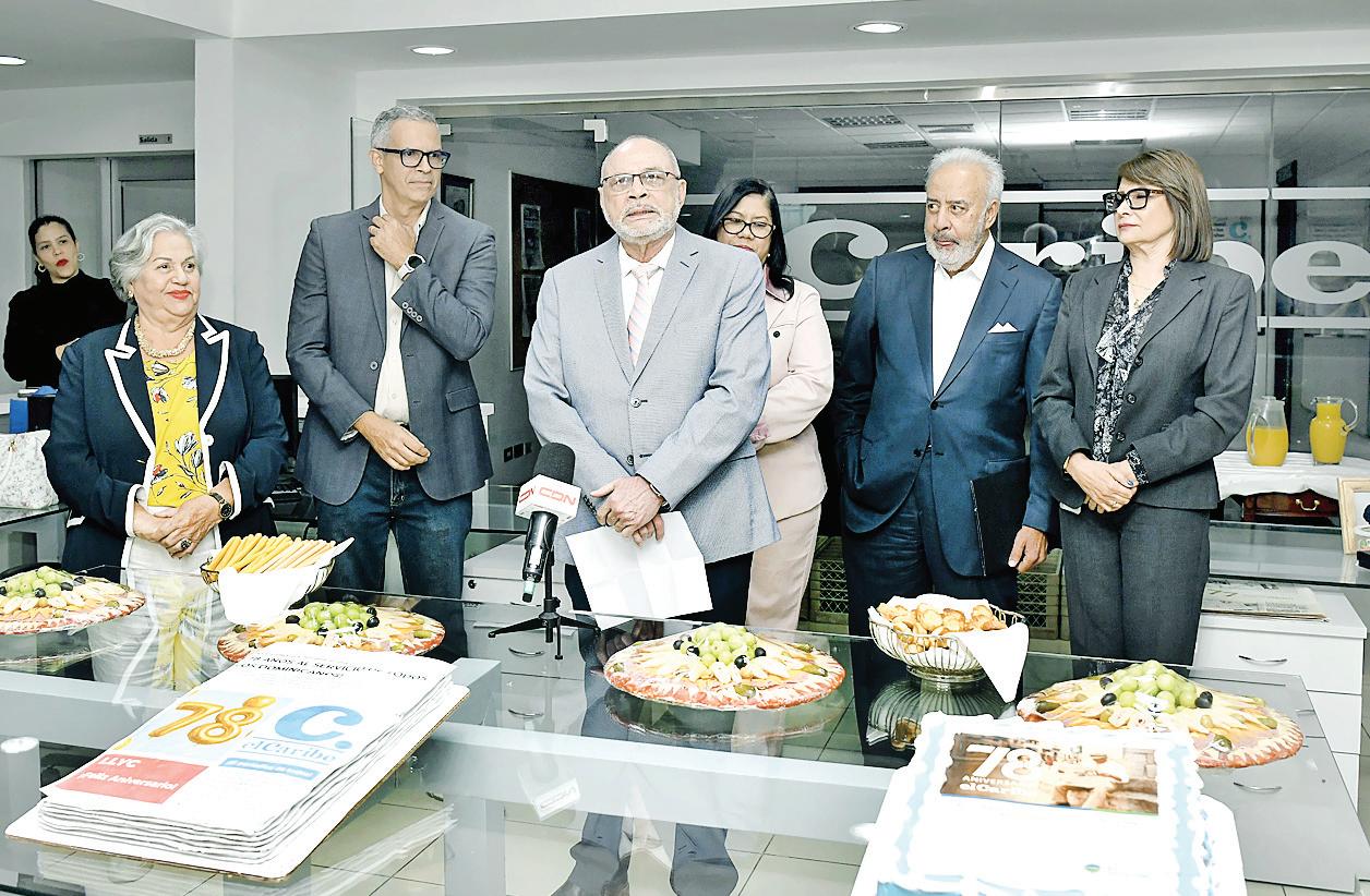 Félix García, vicepresidente de Multimedios del Caribe, junto a Nelson Rodríguez, director general de El Caribe-CDN, Carolina Cruz, administradora, Amelia Duluc, encargada de recursos humanos, y Frank Camilo, habla en el acto por el aniversario 78 del periódico. P.30-31