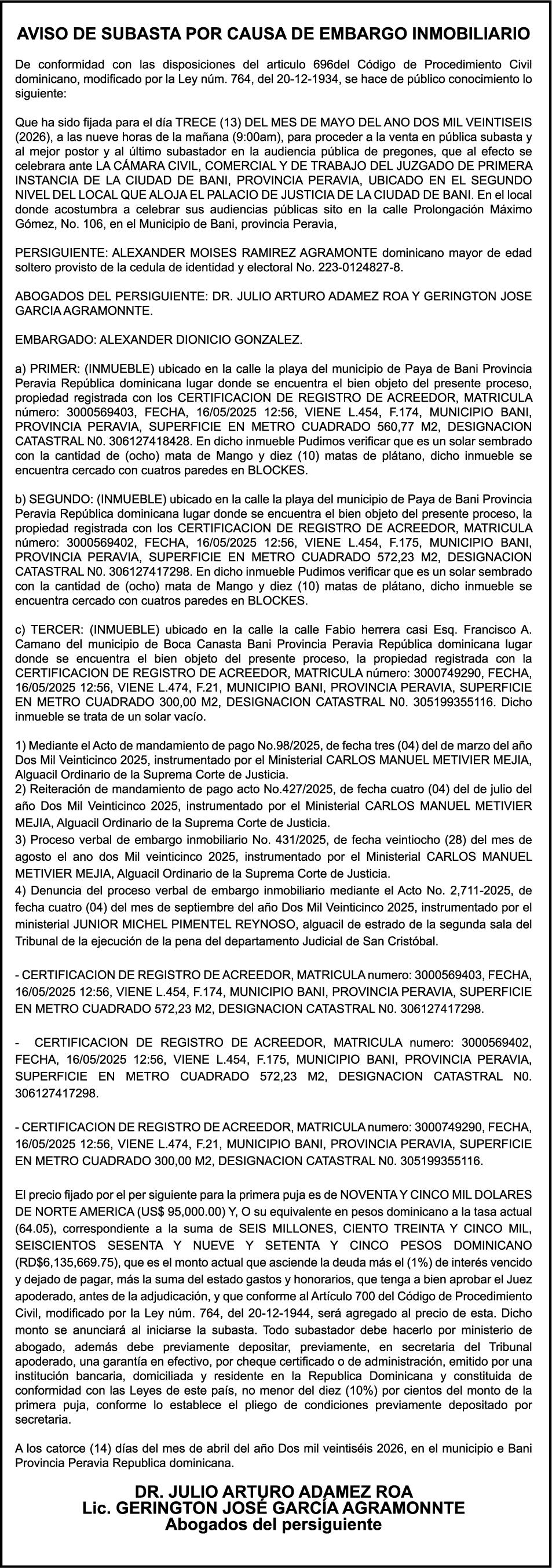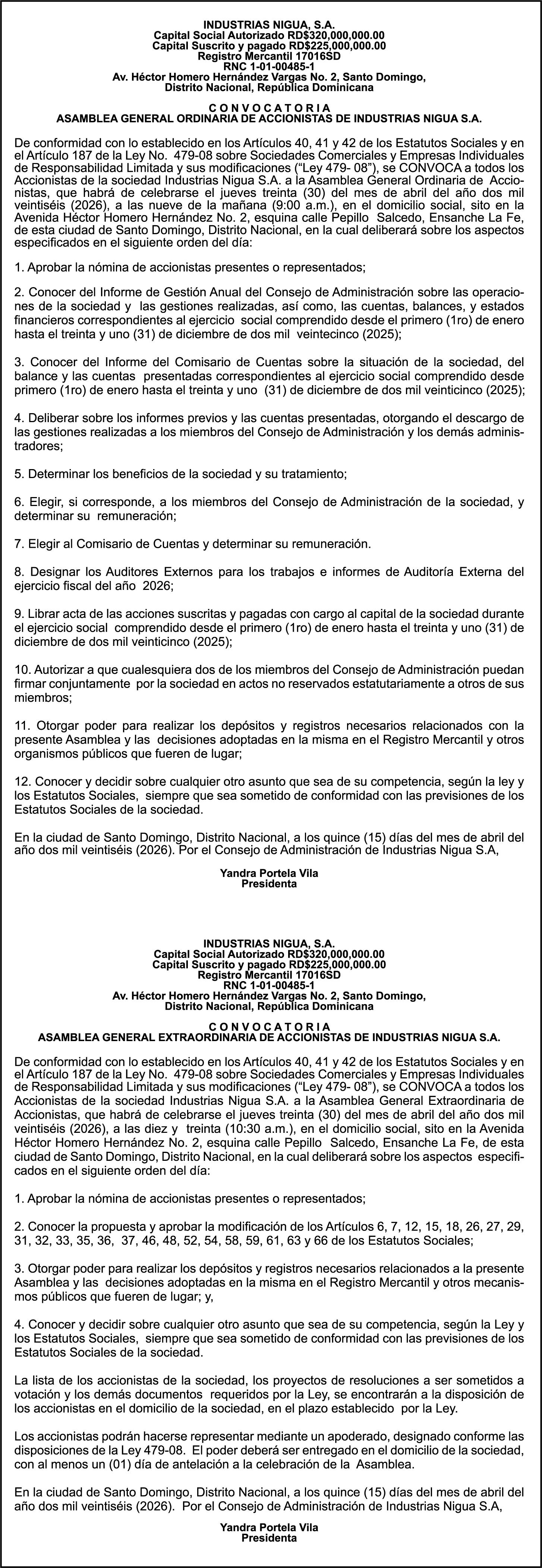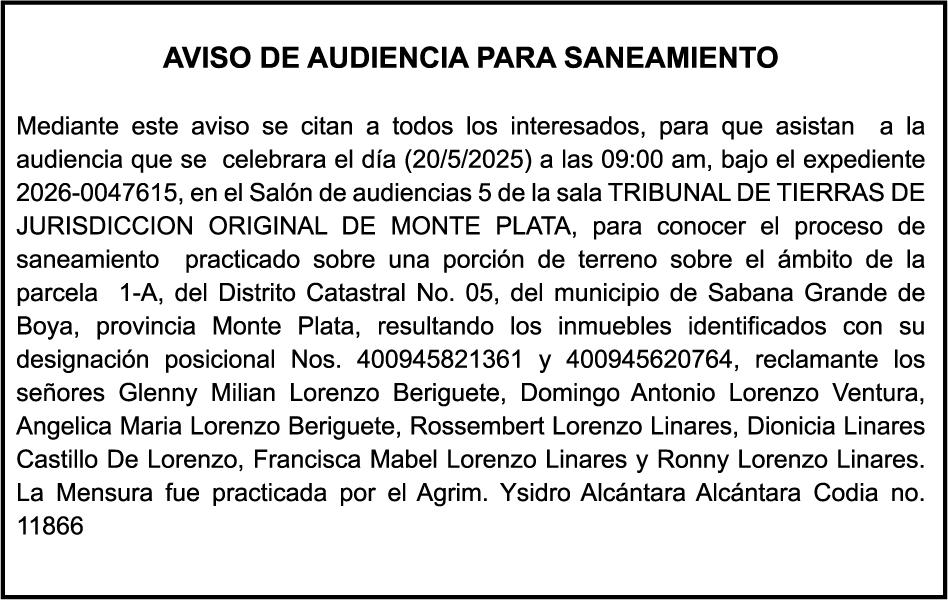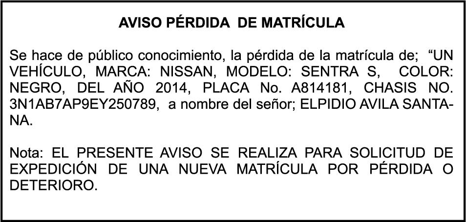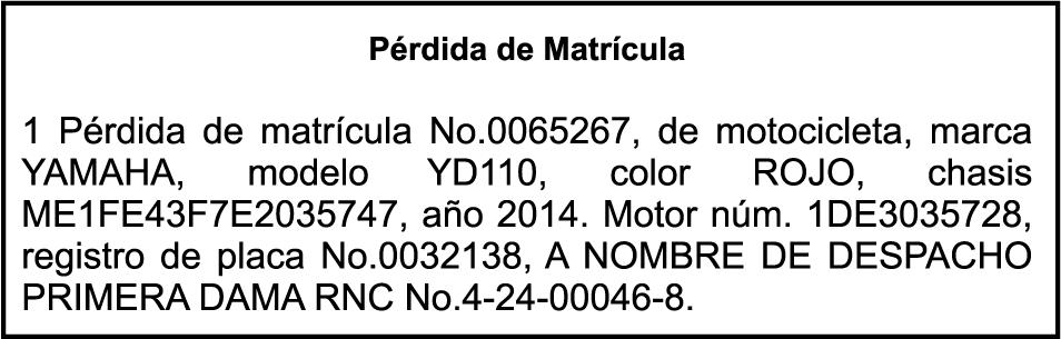 PERDIDA DE PLACA NO.K0491222 DE LA MOTOCICLETA HONDA COLOR VERDE AÑO 1986 CHASIS C500643680 A NOMBRE DE WARLLYN HIPOLITO ENCARNACION PEREZ AVISO CAMBIO DE NOMBRE DE EMBARCACION Se hace de público conocimiento, que se le está cambiando el nombre al catamarán de recreo de nombre “MERENGUE”, de 44.4 pies de eslora, matricula No. CT-M302-2997SDG, propiedad del Sr. RICHARD GONZALEZ CHAVE, para que en lo adelante se haga figurar con el nombre de “RICHARD-058”, en vez del primero.