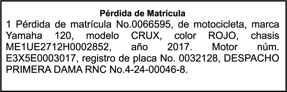 PERDIDA DE MATRICULA: De La Motocicleta, Placa K2497157, Chasis CF46A5846617, Marca SUZUKI. Modelo ADDRESS 125,Color GRIS, AñO 1994, a nombre de YASMIN DEL CARMEN MARTE LORA, Ced. 09500126967