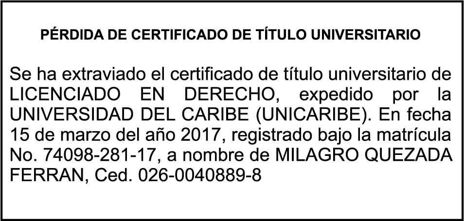 SE hace de público conocimiento la pérdida del Certificado Financiero número 800135618 emitido por Banco Popular Dominicano, S. A. Banco Múltiple, a nombre de YENIFER ADON, portadora de la Cédula de Identidad y Electoral número 225-0032425-0, certificado número 800135618 expedido en fecha 20 de diciembre de 2016 por el monto de (RD$62,411.22) más intereses generados a la fecha.