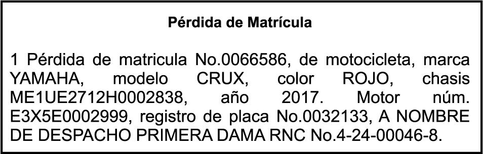 PERDIDA DE PLACA No. K2348942, Motocicleta X-1000, modelo CG150R6, color negro, año 2022, chasis TBLPCK4J0N2001168a nombre de ENMANUEL MARTINEZ DIAZ, Ced. 001-1943227-6