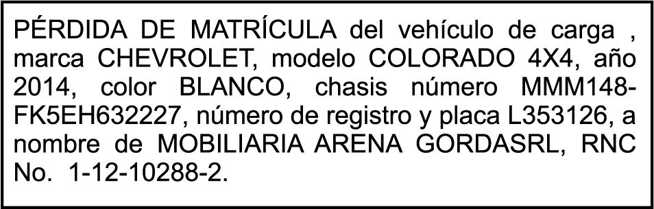 PERDIDA DE MATRICULA:DEL VEHICULO,Placa: NCX635,Chasis: MH3 3HB008XK230608,Marca: YAMAHA,Modelo: RX-S,Año: 2000,Color: NEGRO,Nombre: JOSE BELLO,RNC: 10100053171