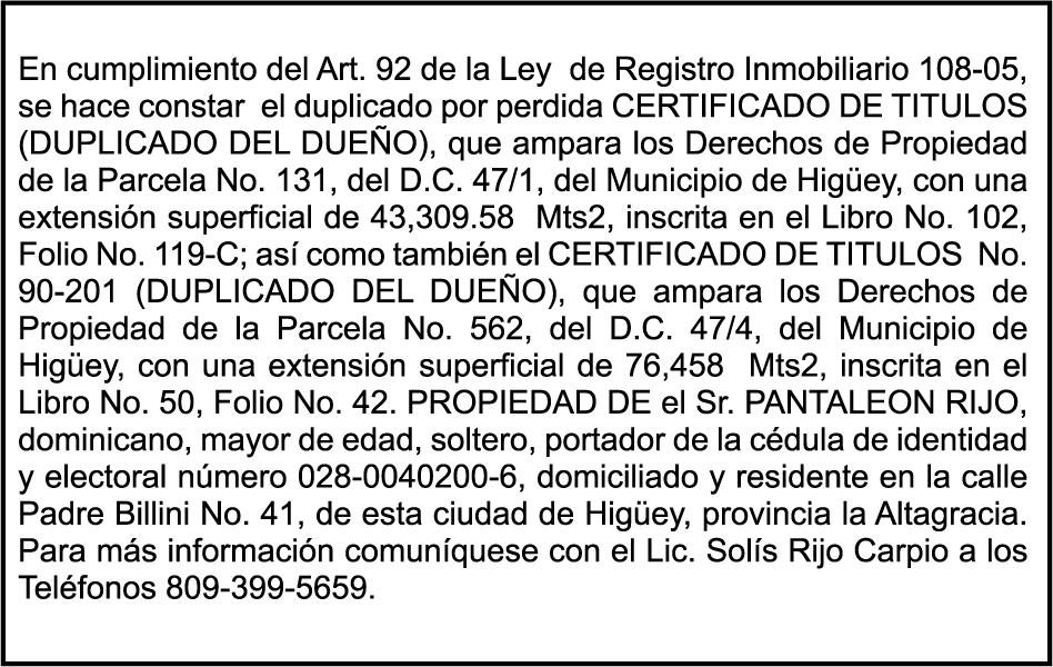 PERDIDA DE MATRICULA: De La Motocicleta, Placa K1112842, Chasis TBL20P102GHB54276, Marca X-1000,Modelo CG-200 (SP), AñO 2016, Color NEGRO, a nombre de LENNI PORFIRIO COLON LORA, Ced. 03400347849