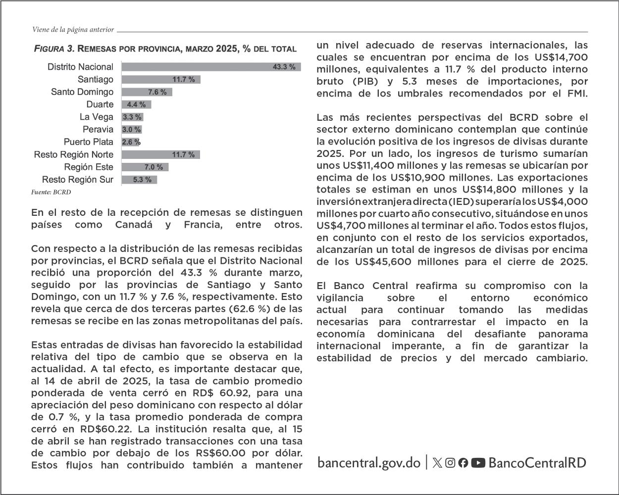 Divisas. Banco Central informa que las remesas recibidas durante marzo de 2025 sumaron US$1,110.3 millones, para un crecimiento de 20.0% respecto al mismo mes de 2024. P.21