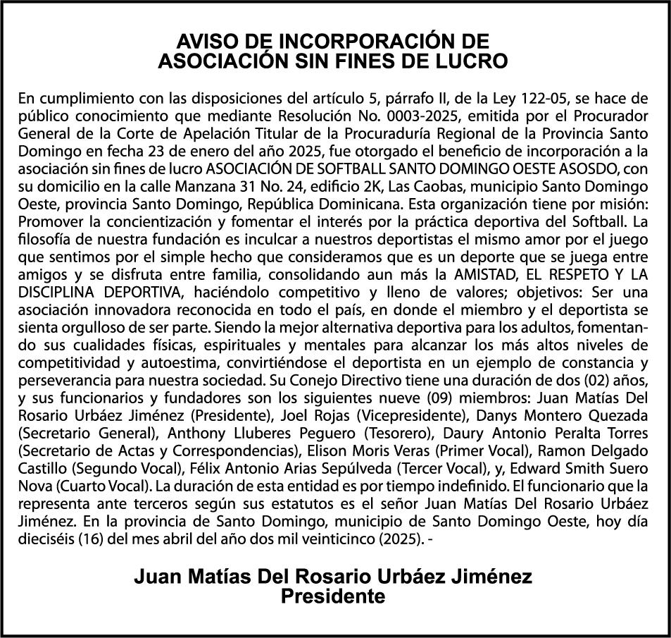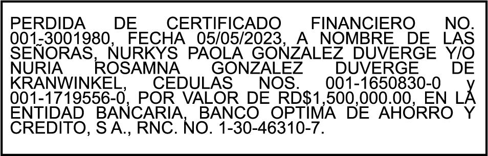 SE HACE de público conocimiento la pérdida del Certificado Financiero número 839527249emitido por Banco Popular Dominicano, S. A. Banco Múltiple, ANGELA MARIA DE LOURDES DE LEON CANO DE UREÑA, portadora de la Cédula de Identidad y Electoral número 001-0924127-3 y ZAIRA AMANCIA DE LEON MARTINEZ, portadora de la Cédula de Identidad y Electoral número 001-0188798-2, certificado número 839527249, expedido en fecha 26 de febrero de 2024 por el monto de (RD$1,230,017.14) más intereses generados a la fecha.