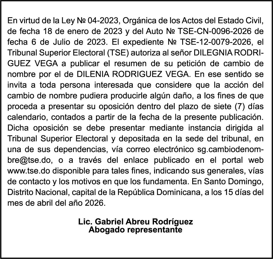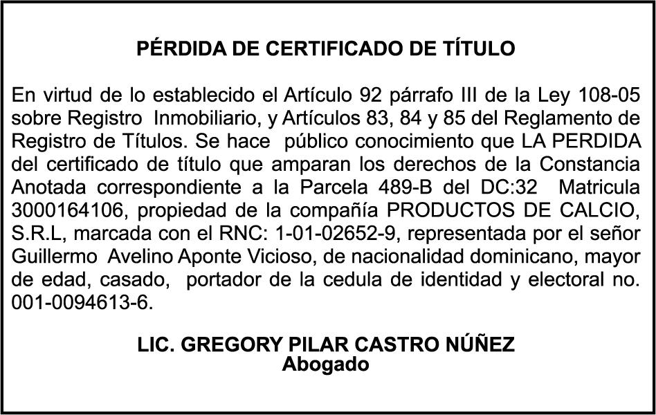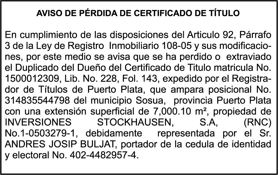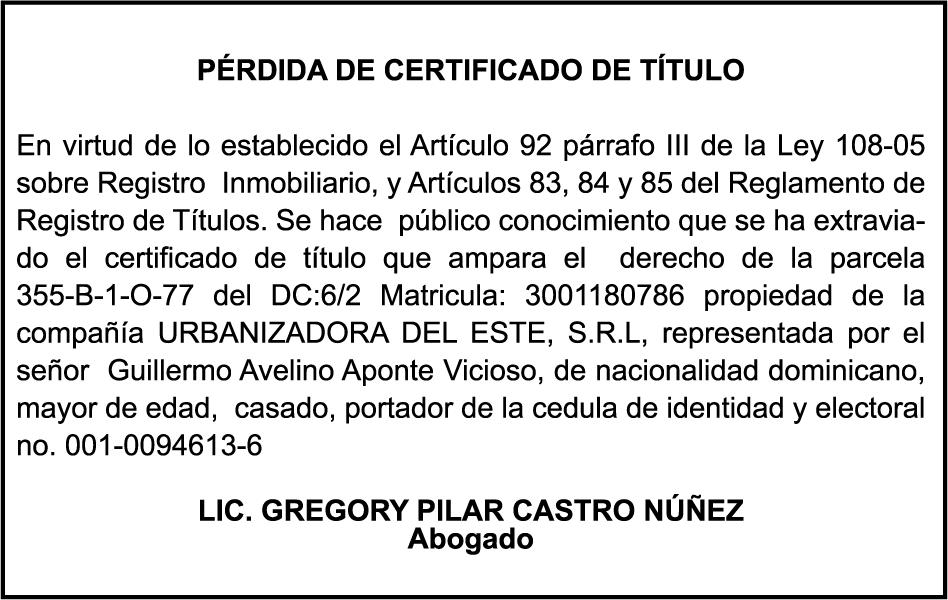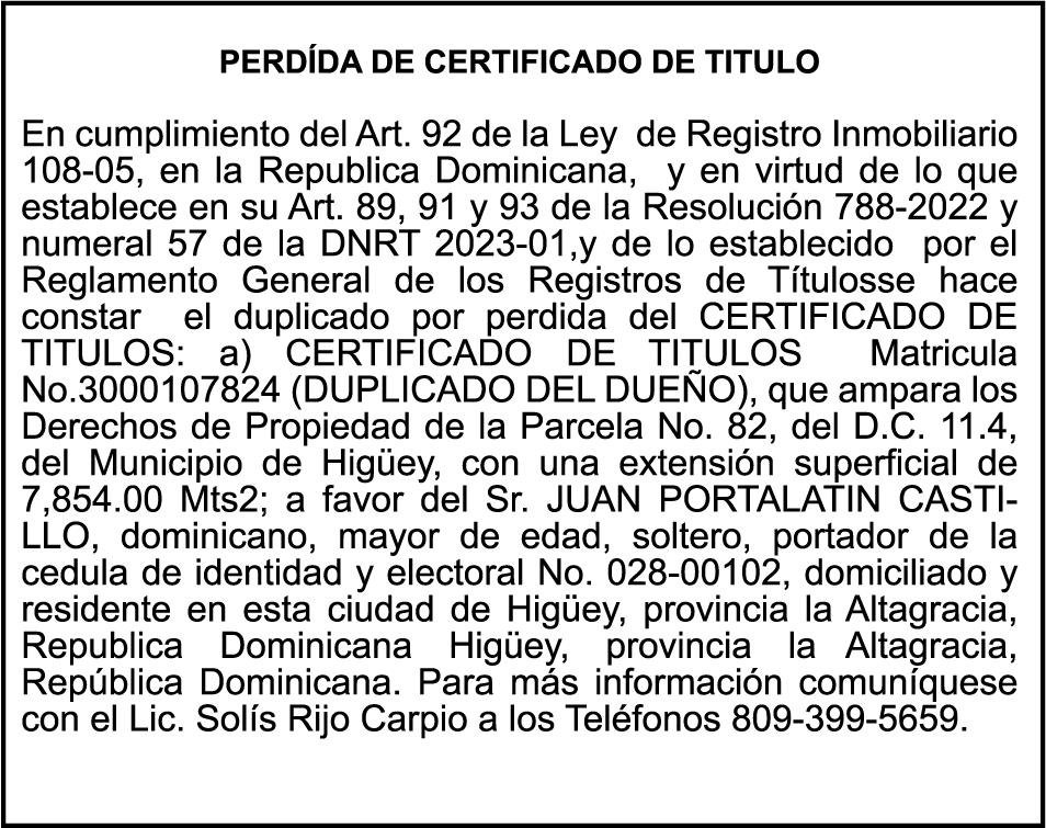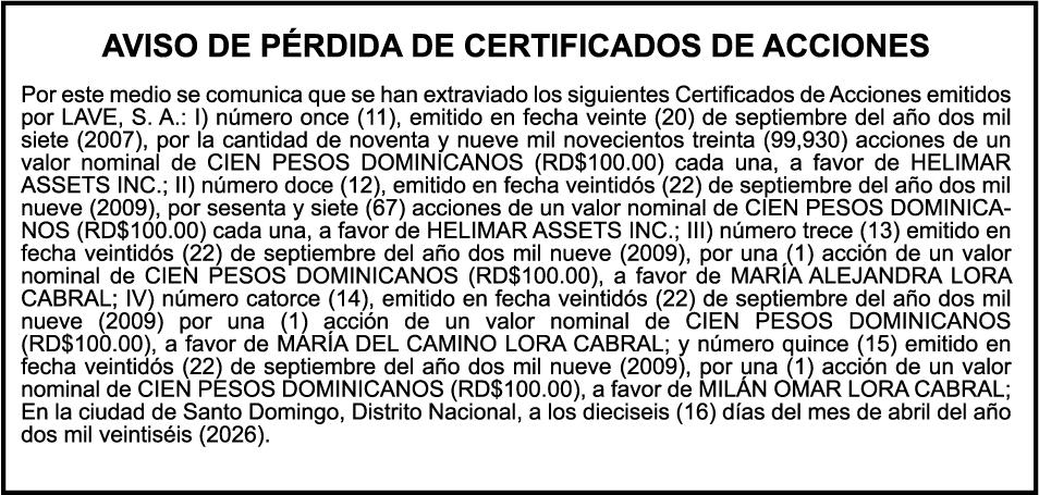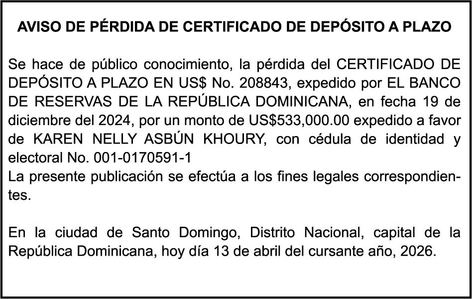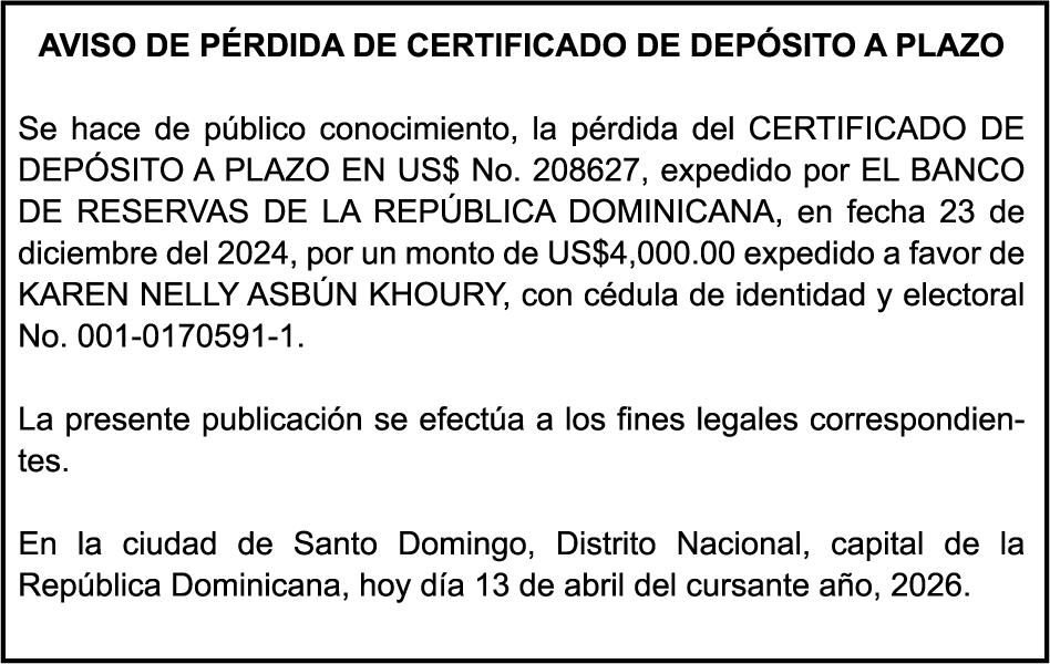 SE HACE de público conocimiento la pérdida del Certificado Financiero número 850227810 emitido por Banco Popular Dominicano, S. A. Banco Múltiple, a nombre de ALBIERIS MIGUEL GRULLON VALERIO, portador de la Cédula de Identidad y Electoral número 402-3855170-5, certificado número 850227810 expedido el 1 de julio de 2025 por el monto de (RD$52,157.22) más intereses generados a la fecha.
