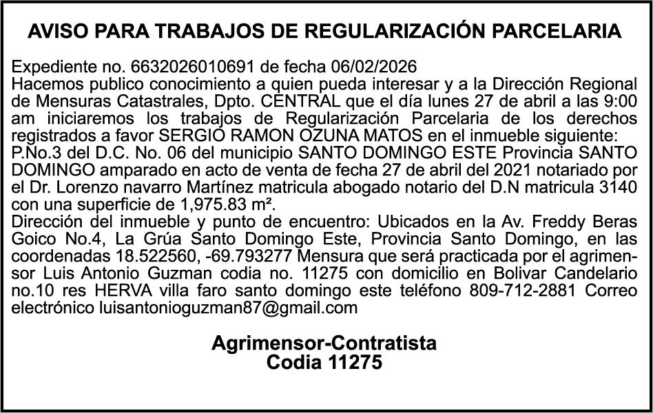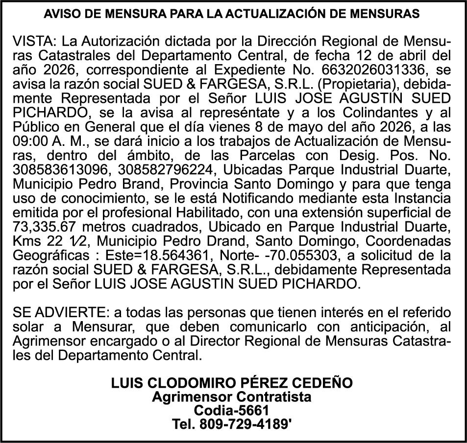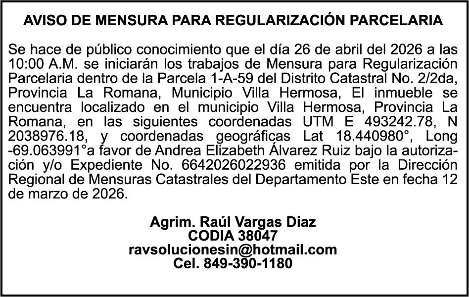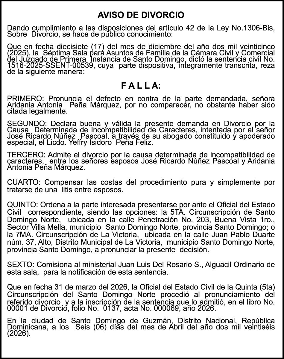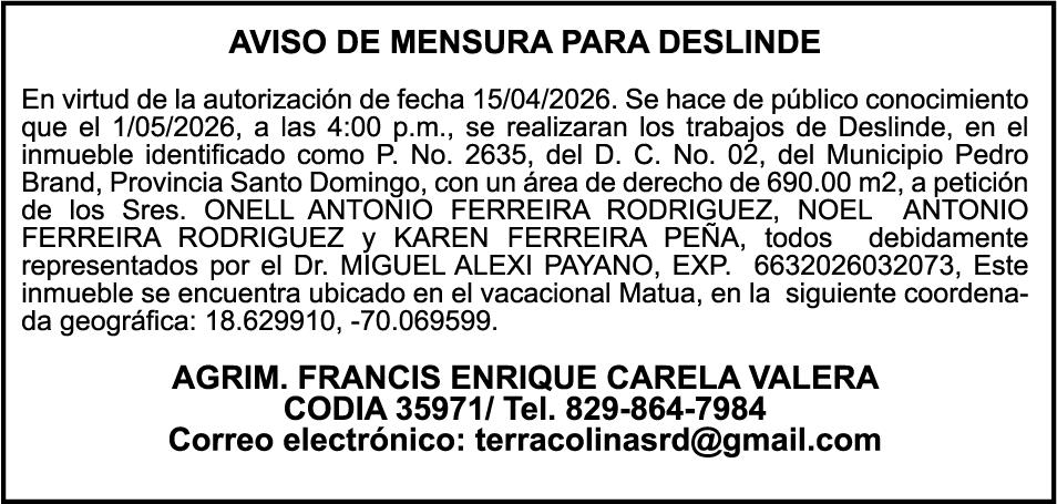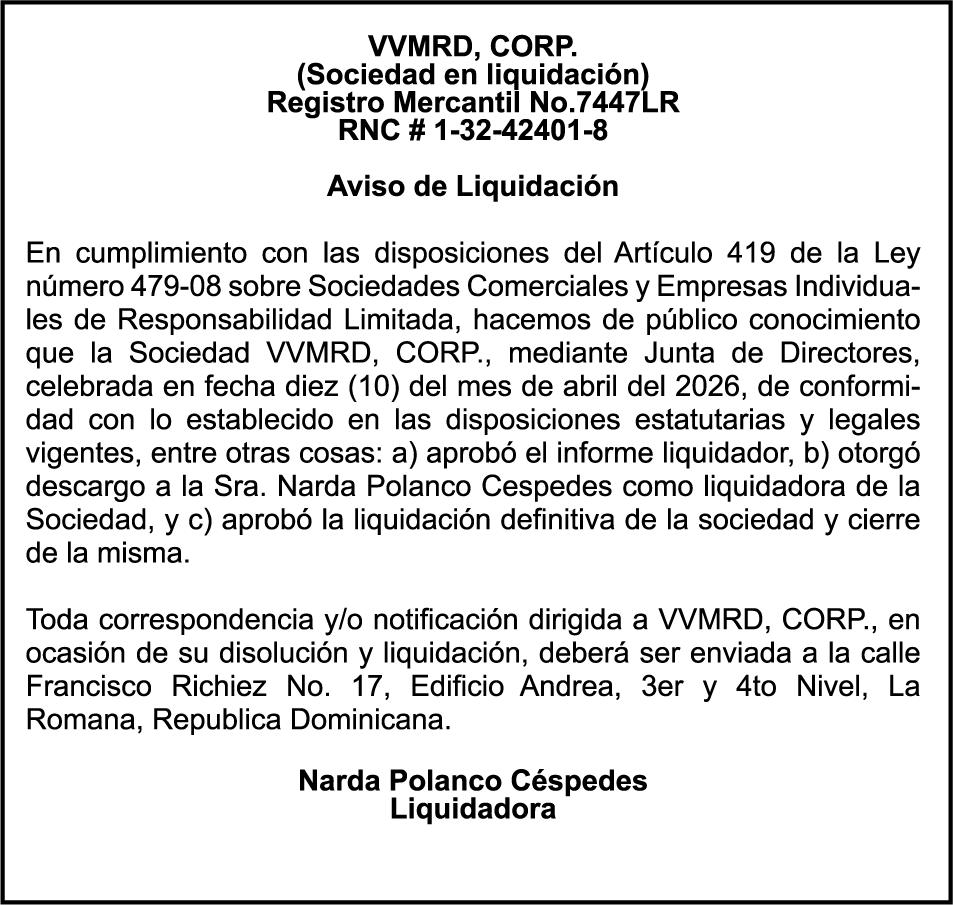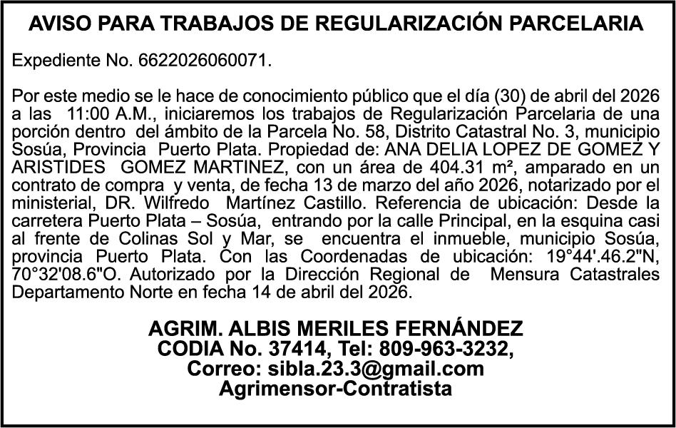 SE HACE de público conocimiento la pérdida del Certificado Financiero número 850227810 emitido por Banco Popular Dominicano, S. A. Banco Múltiple, a nombre de ALBIERIS MIGUEL GRULLON VALERIO, portador de la Cédula de Identidad y Electoral número 402-3855170-5, certificado número 850227810 expedido el 1 de julio de 2025 por el monto de (RD$52,157.22) más intereses generados a la fecha.