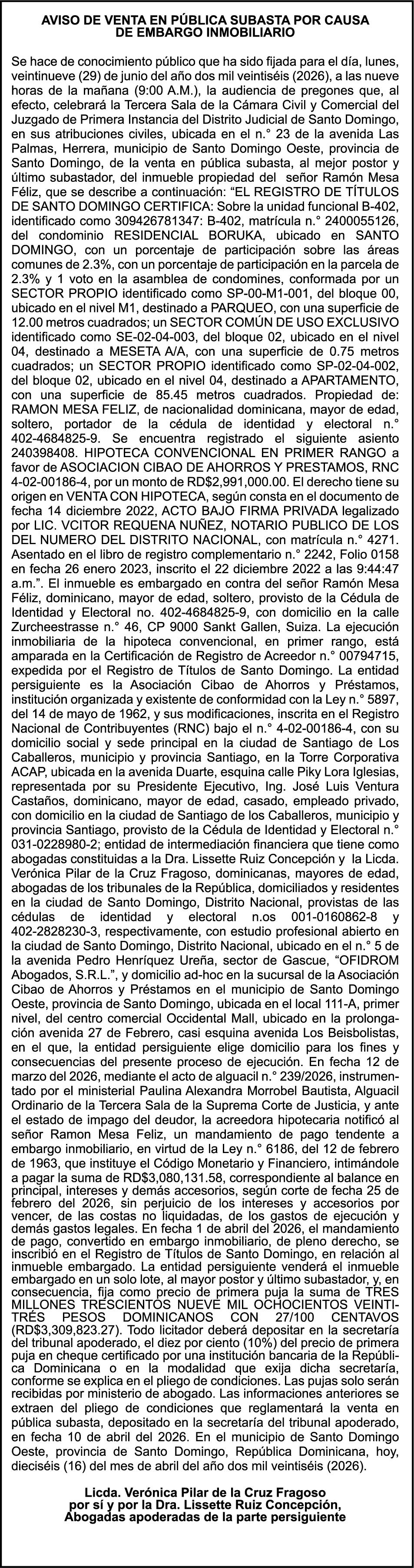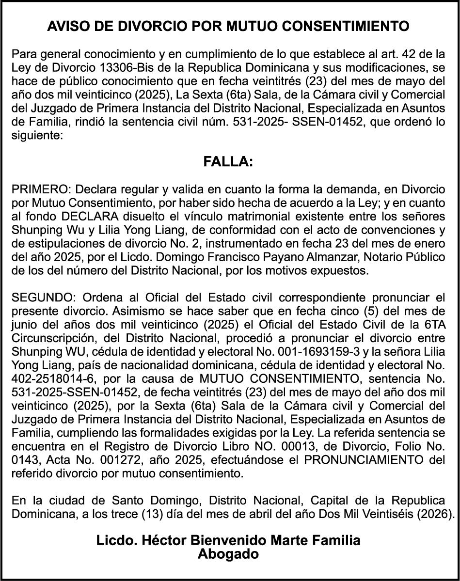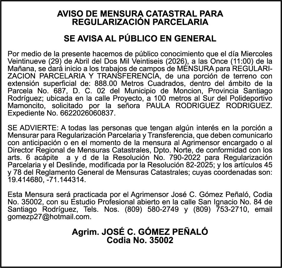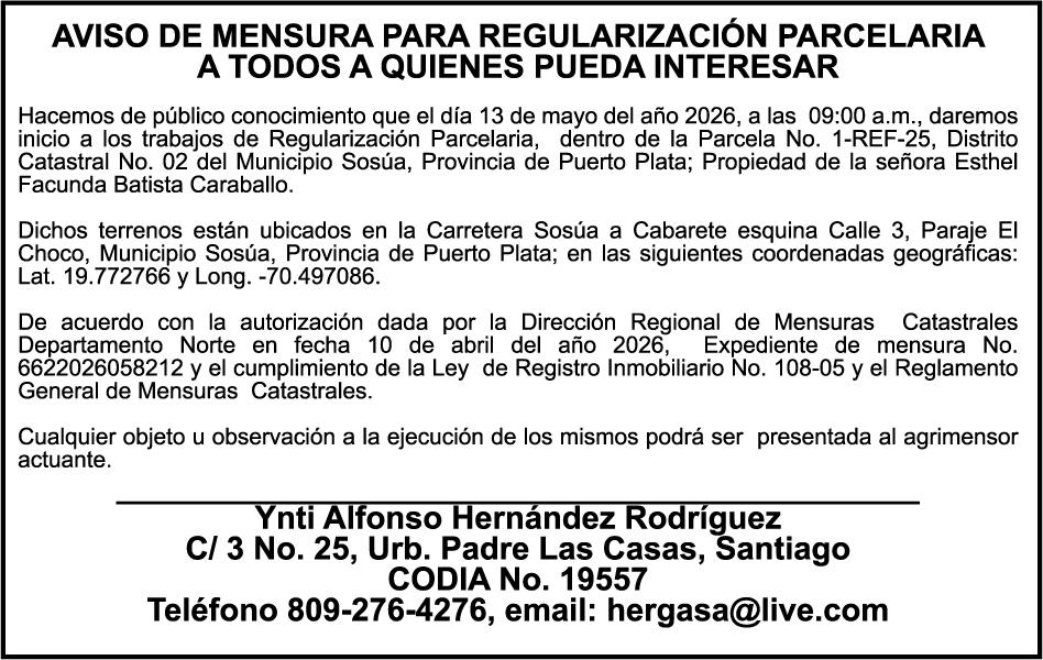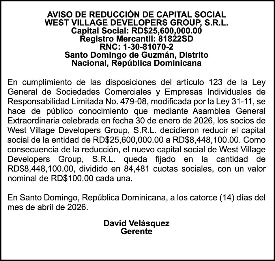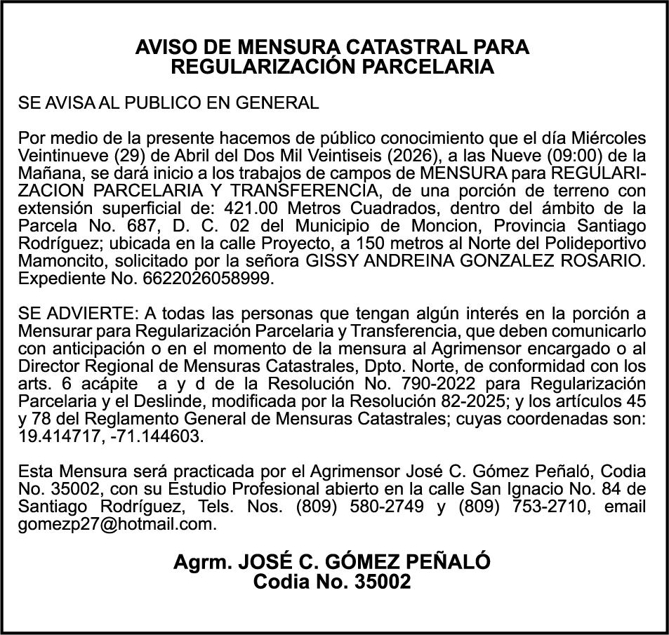 SE HACE de público conocimiento la pérdida del Certificado Financiero número 850227810 emitido por Banco Popular Dominicano, S. A. Banco Múltiple, a nombre de ALBIERIS MIGUEL GRULLON VALERIO, portador de la Cédula de Identidad y Electoral número 402-3855170-5, certificado número 850227810 expedido el 1 de julio de 2025 por el monto de (RD$52,157.22) más intereses generados a la fecha.