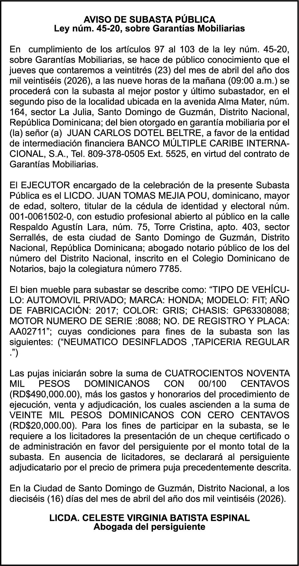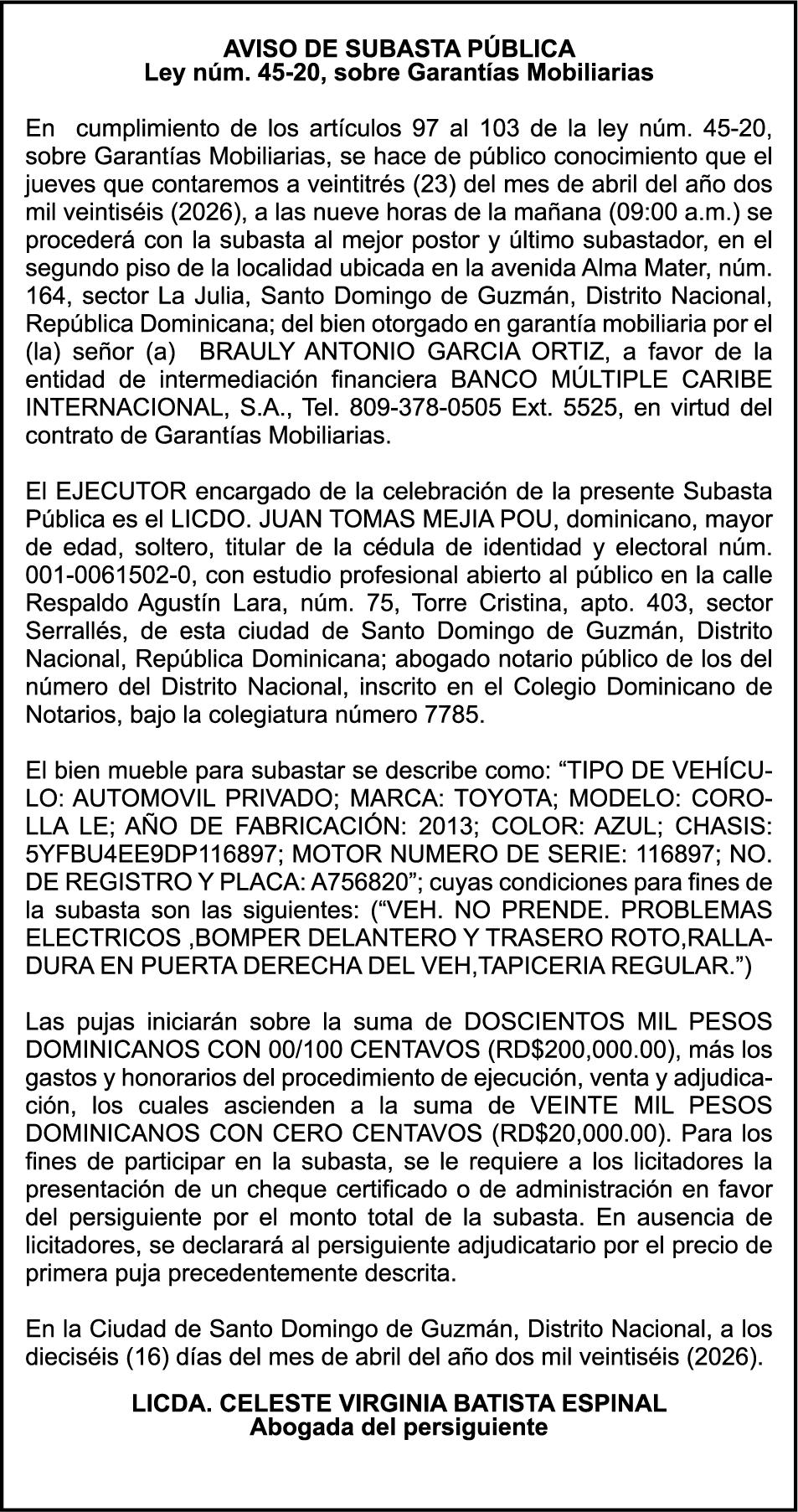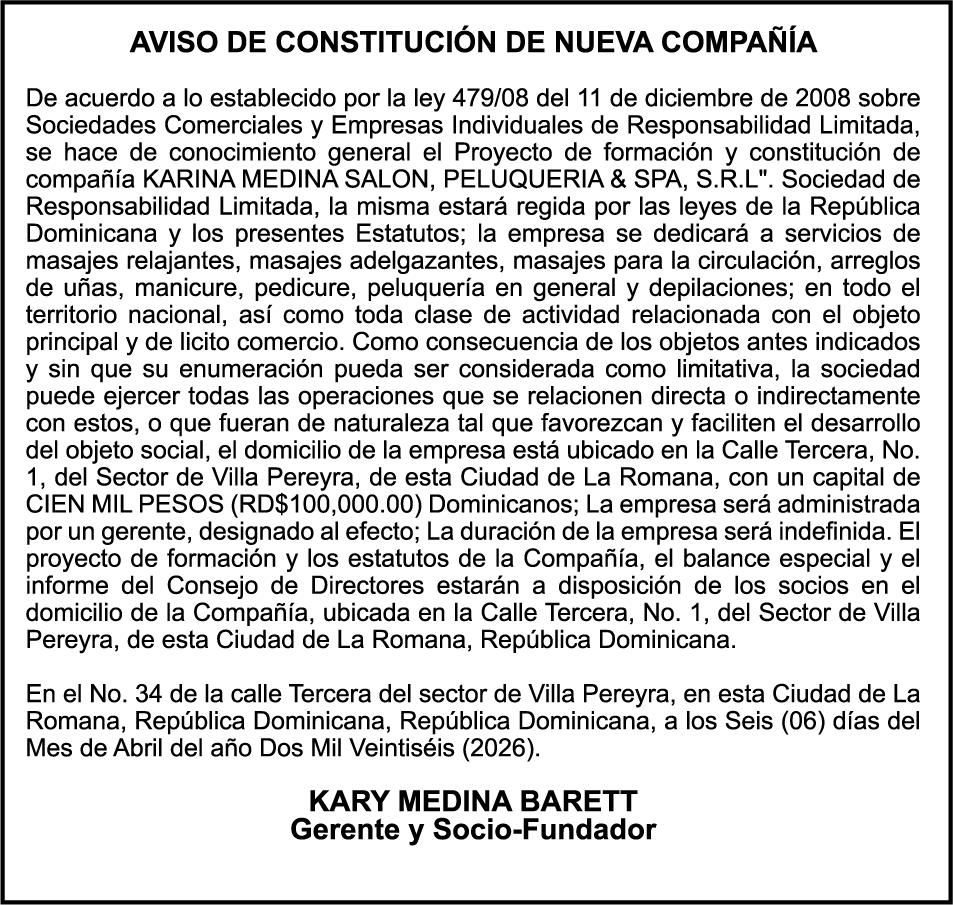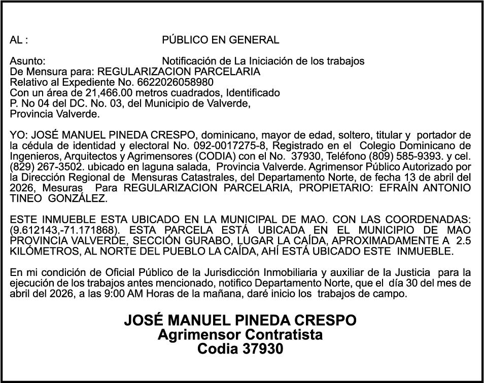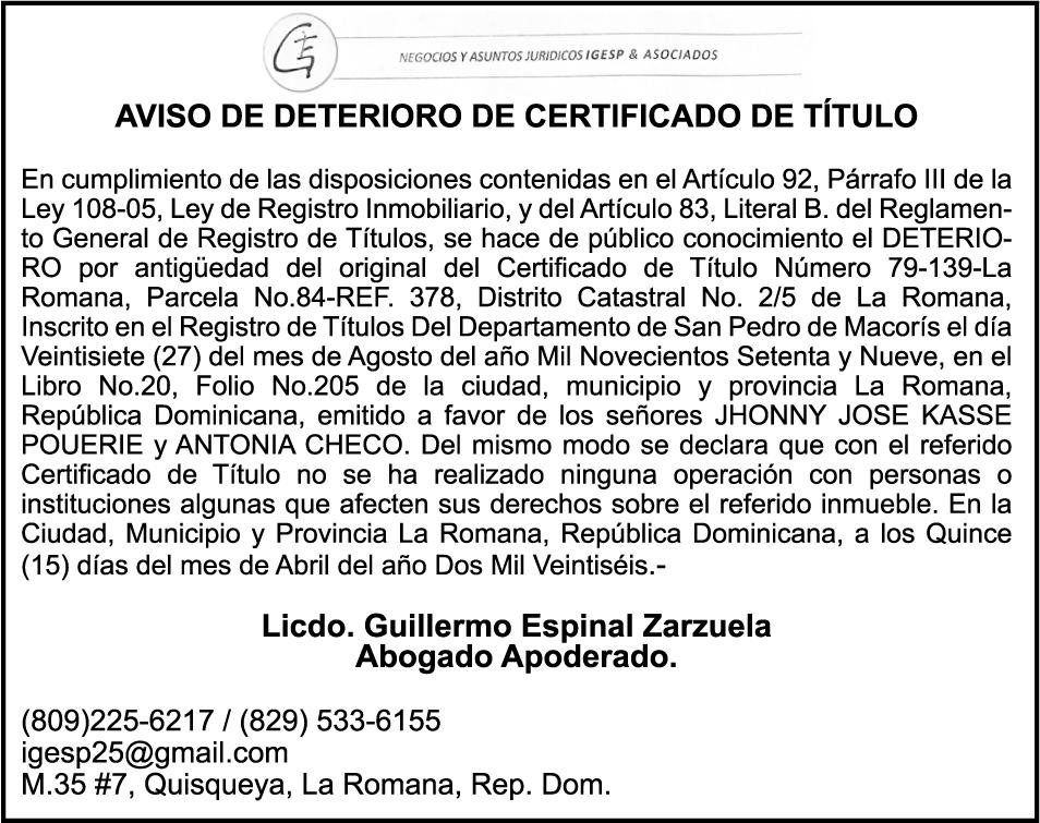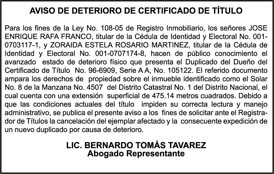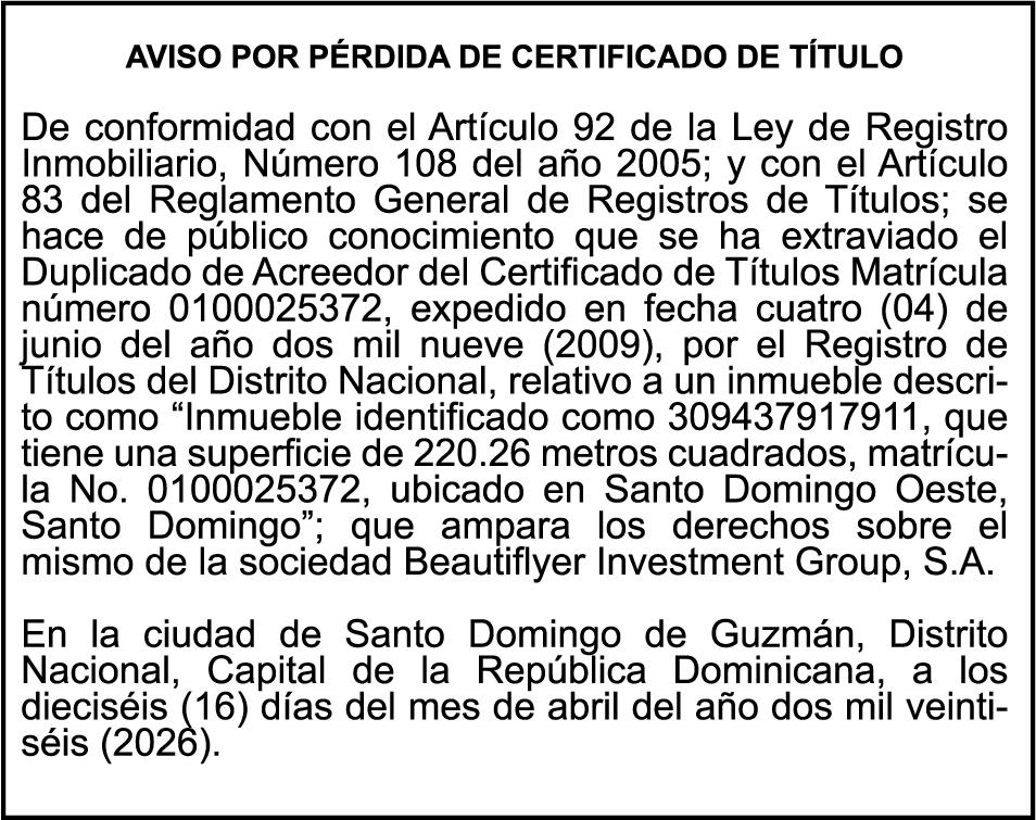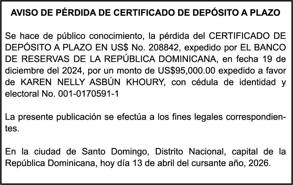 SE hace de público conocimiento la pérdida del Certificado Financiero número 851379784 emitido por Banco Popular Dominicano, S. A. Banco Múltiple, a nombre de JOSE TOMAS BETANCES CASTRO, portador de la Cédula de Identidad y Electoral número 001-1227605-0, certificado número 851379784 expedido el 26 de agosto de 2025 por el monto de (USD$57,000.00) más intereses generados a la fecha.