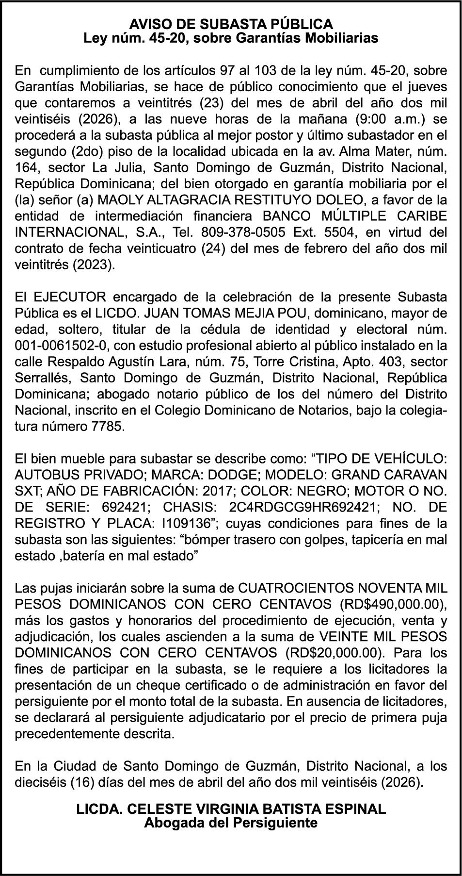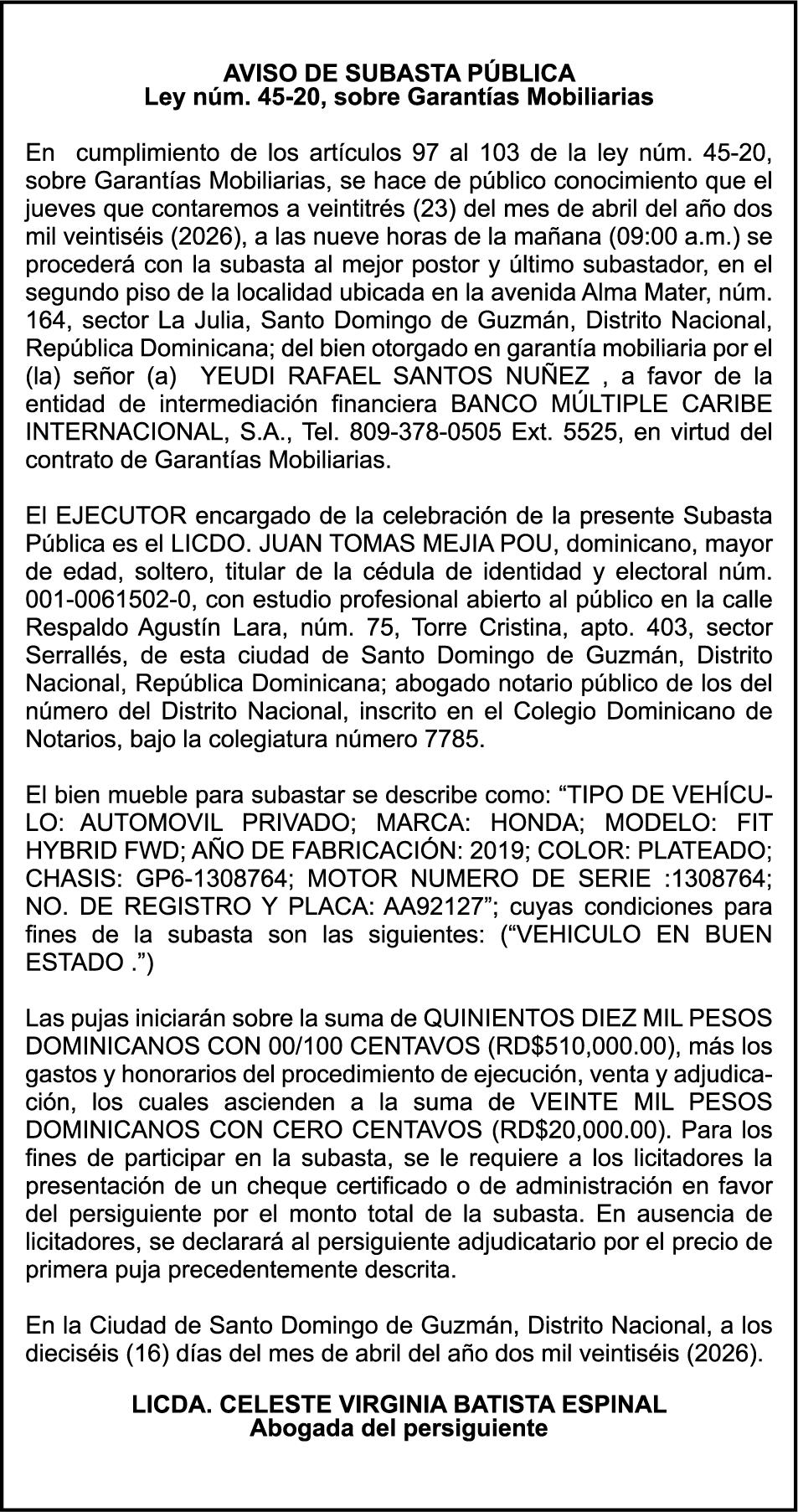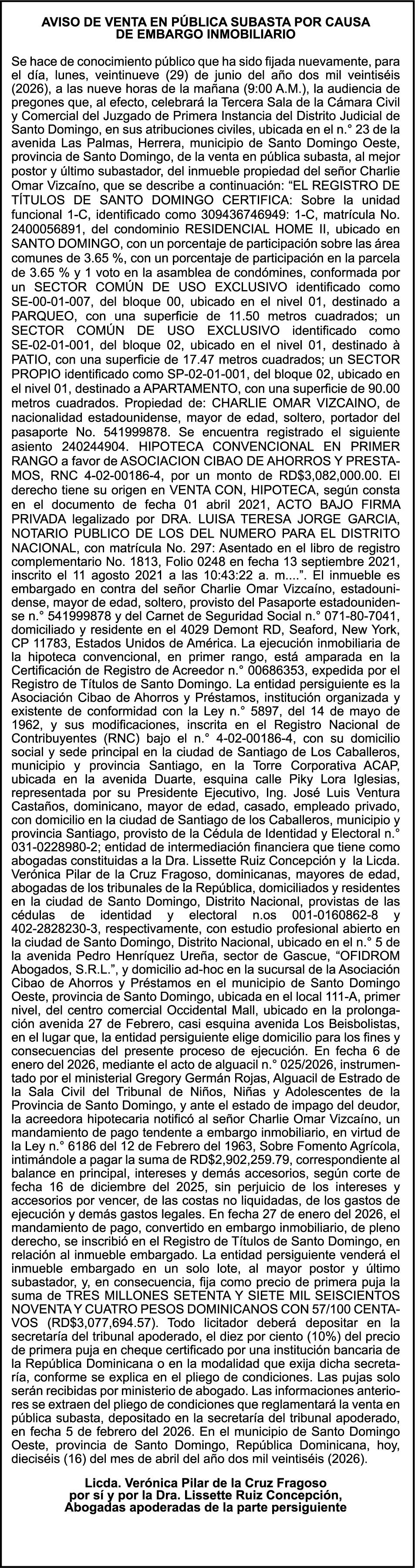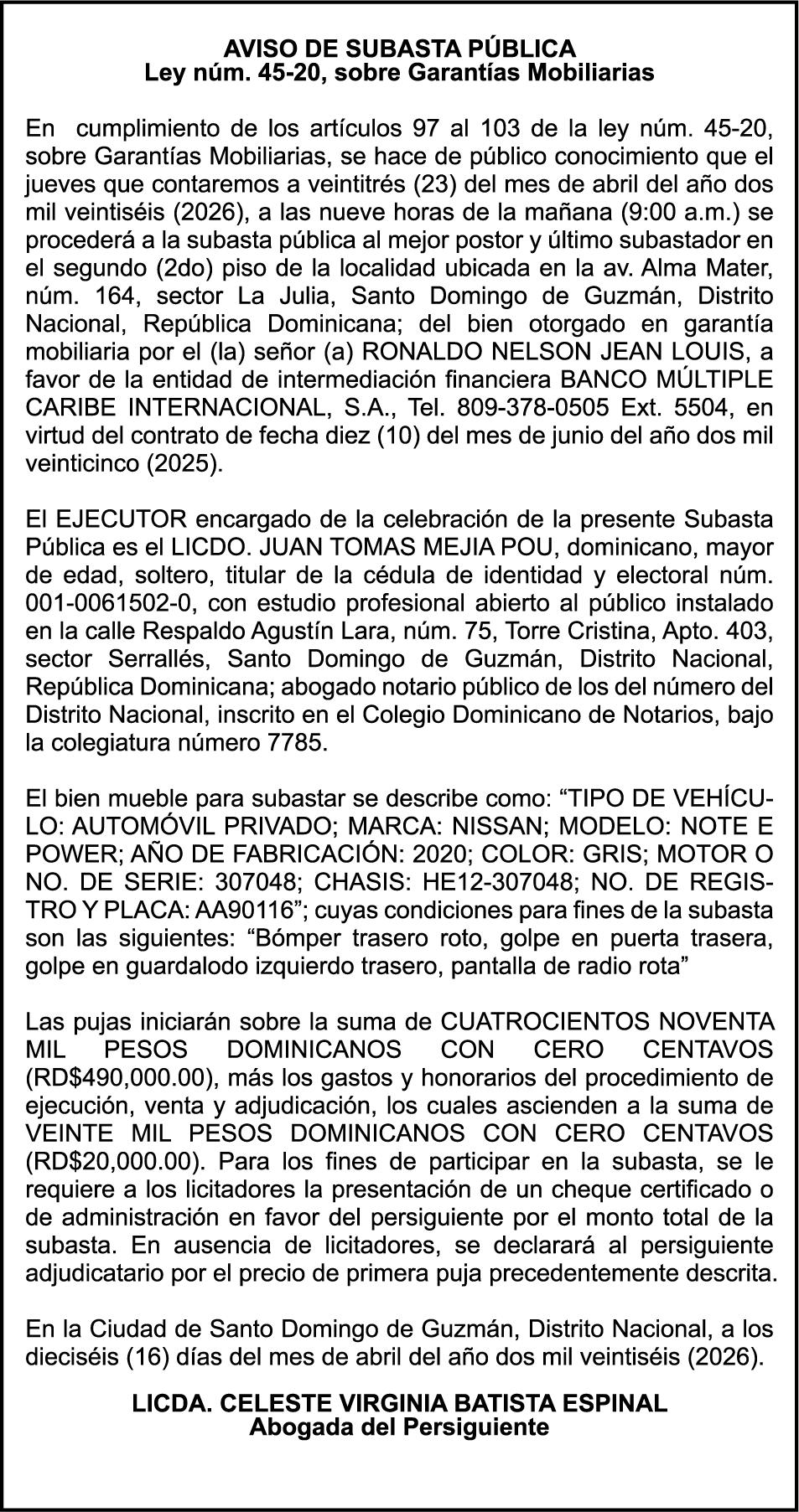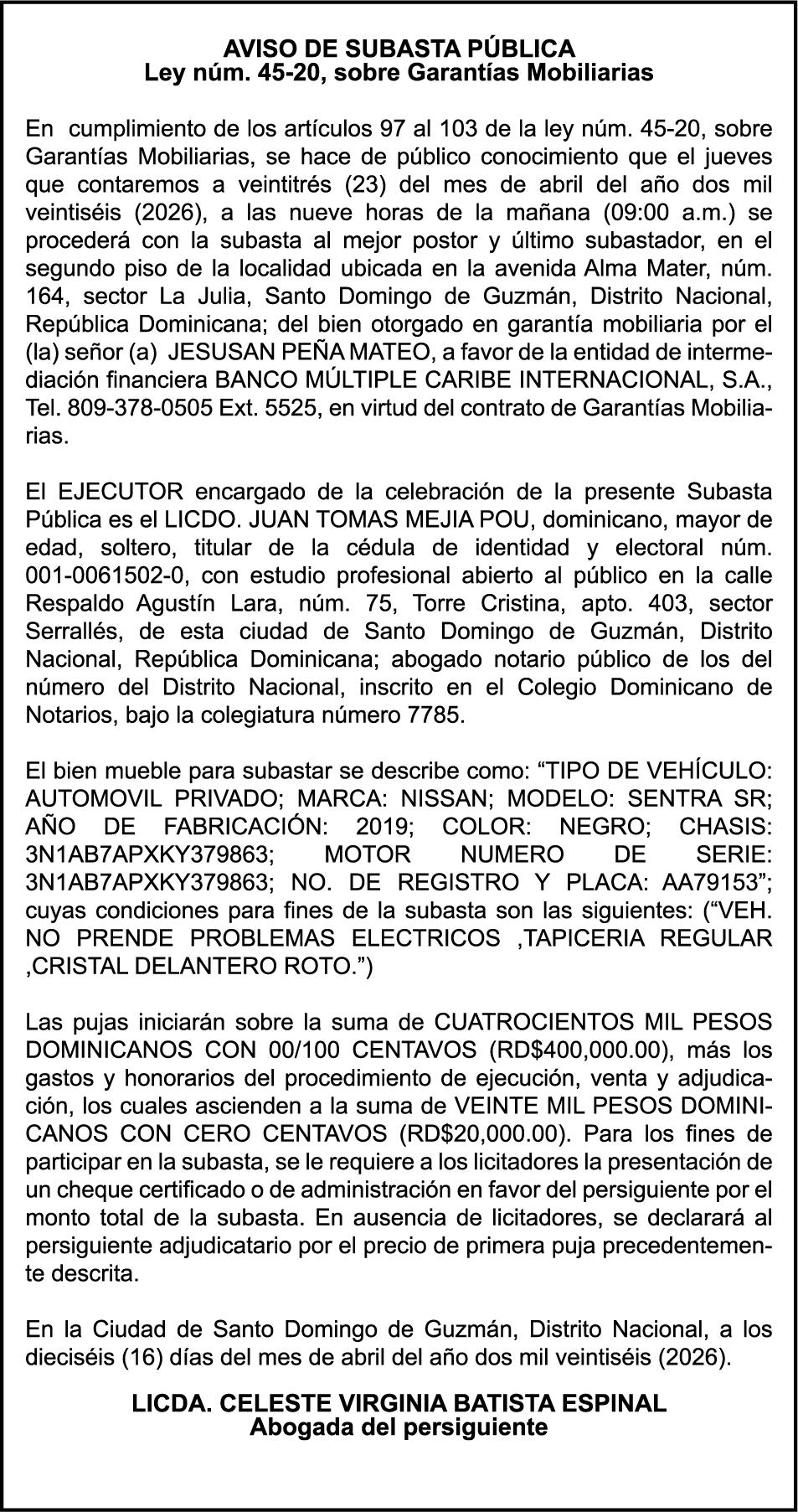 SE hace de público conocimiento la pérdida del Certificado Financiero número 851379784 emitido por Banco Popular Dominicano, S. A. Banco Múltiple, a nombre de JOSE TOMAS BETANCES CASTRO, portador de la Cédula de Identidad y Electoral número 001-1227605-0, certificado número 851379784 expedido el 26 de agosto de 2025 por el monto de (USD$57,000.00) más intereses generados a la fecha.