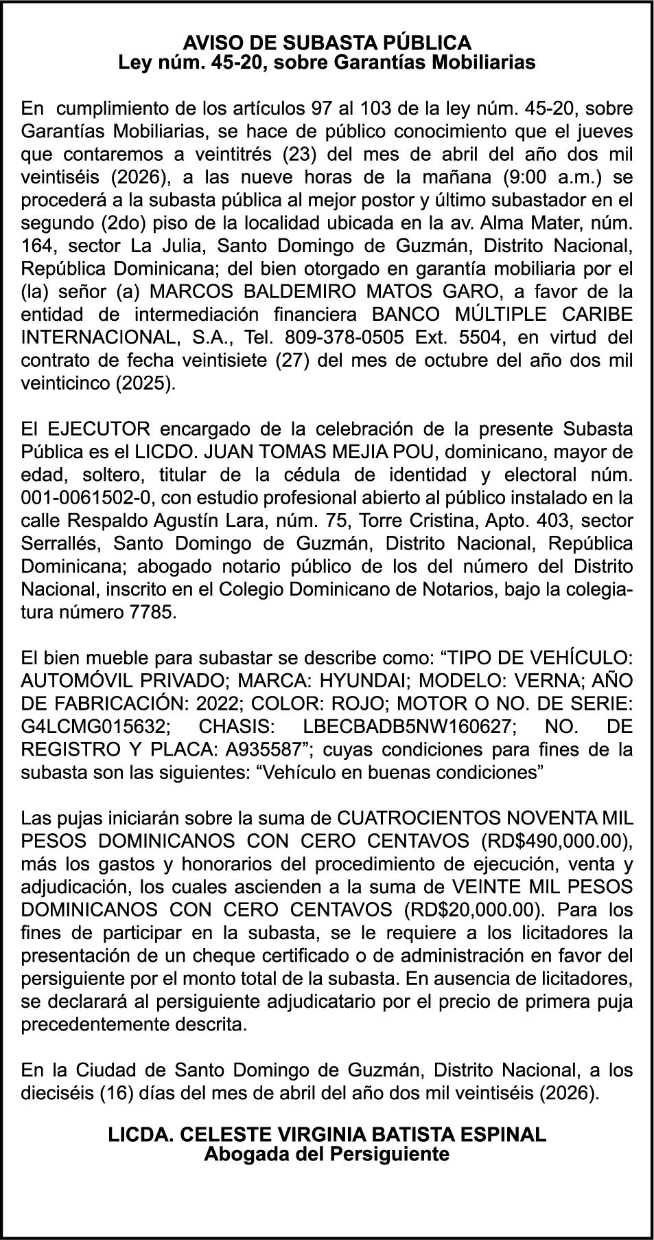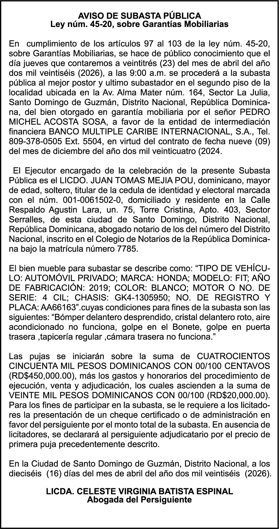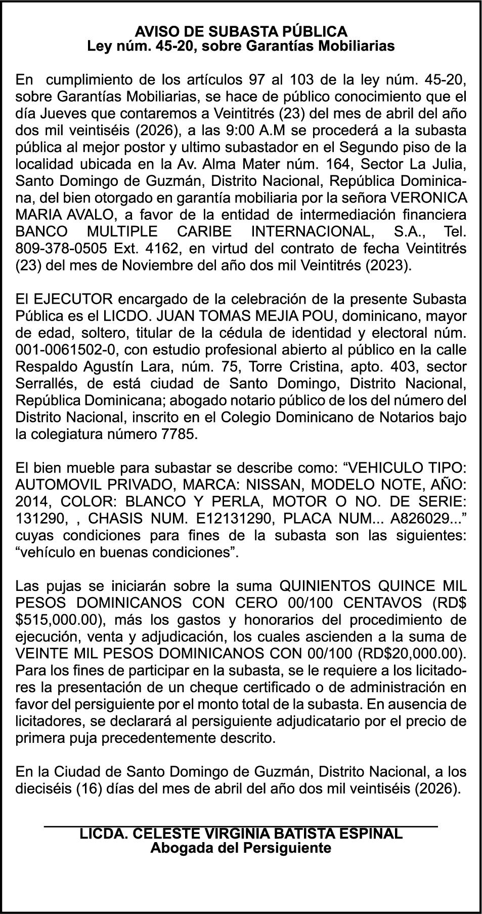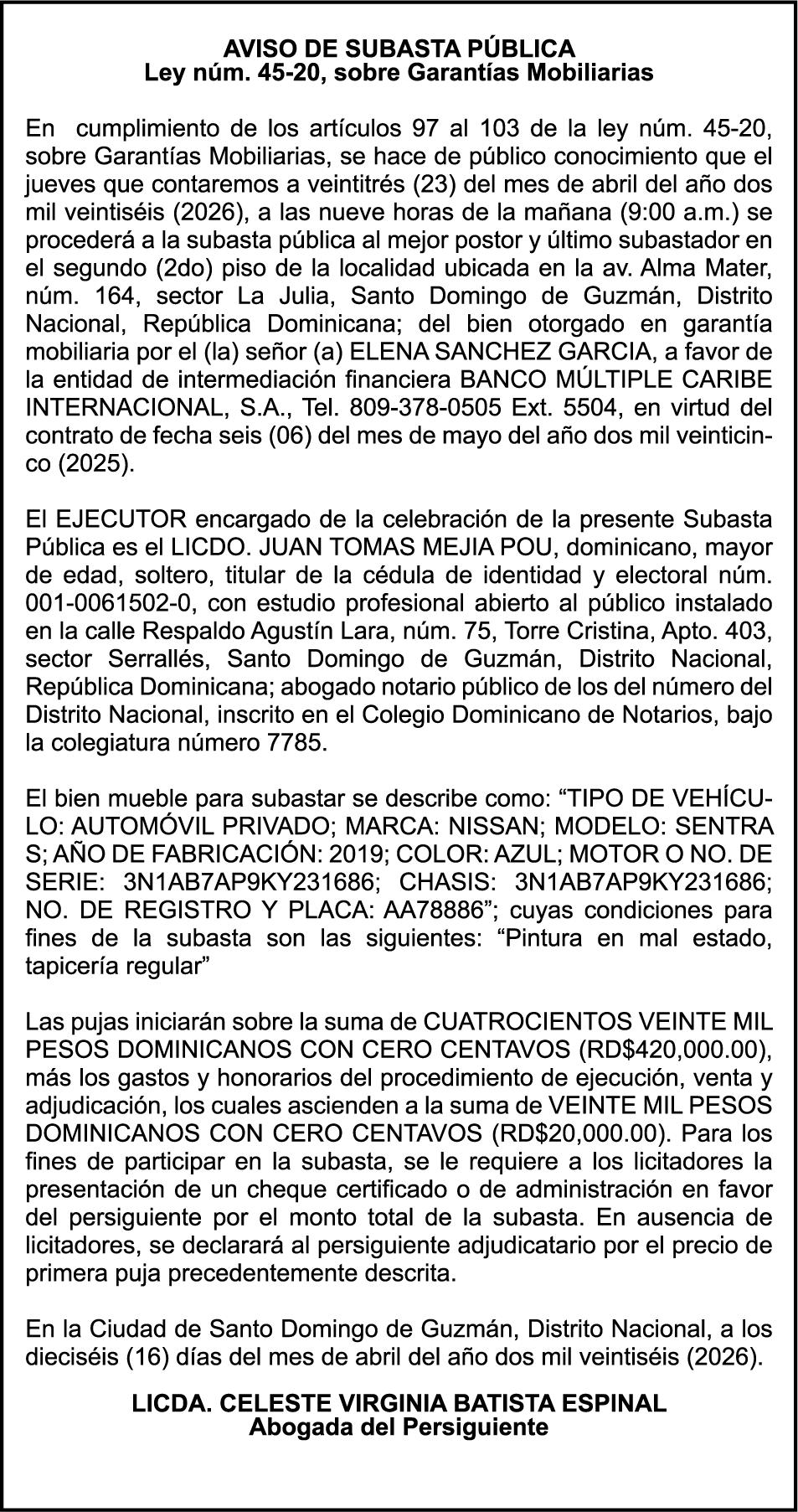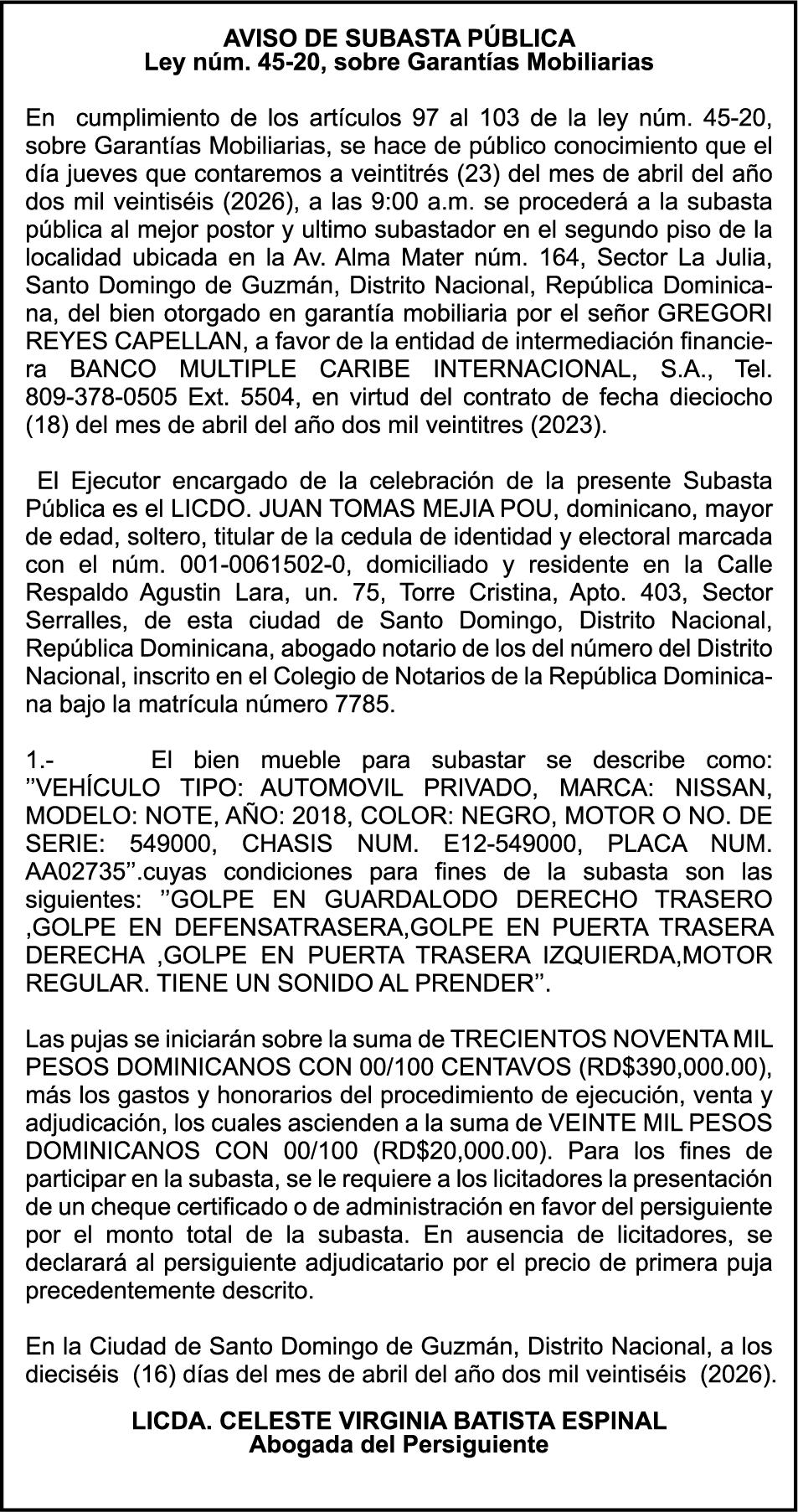 SE hace de público conocimiento la pérdida del Certificado Financiero número 851379784 emitido por Banco Popular Dominicano, S. A. Banco Múltiple, a nombre de JOSE TOMAS BETANCES CASTRO, portador de la Cédula de Identidad y Electoral número 001-1227605-0, certificado número 851379784 expedido el 26 de agosto de 2025 por el monto de (USD$57,000.00) más intereses generados a la fecha.