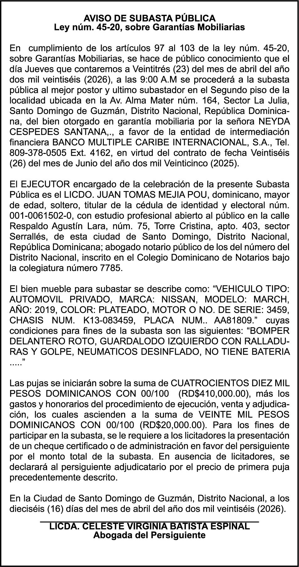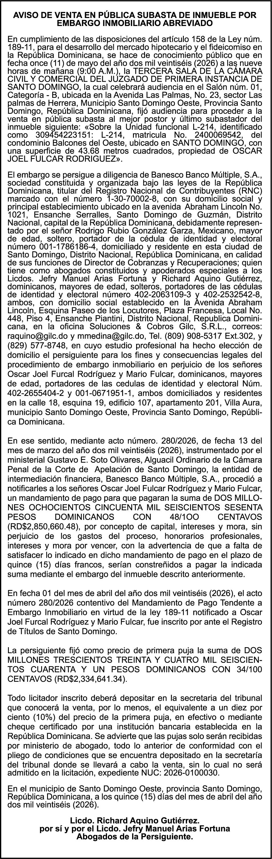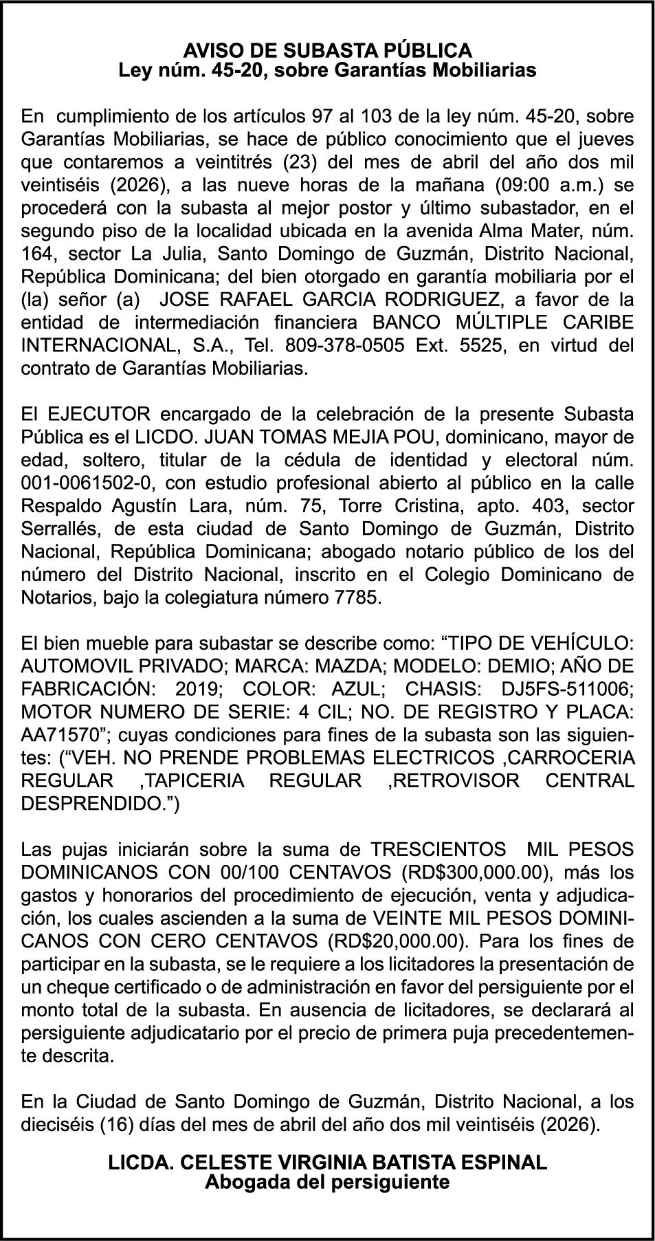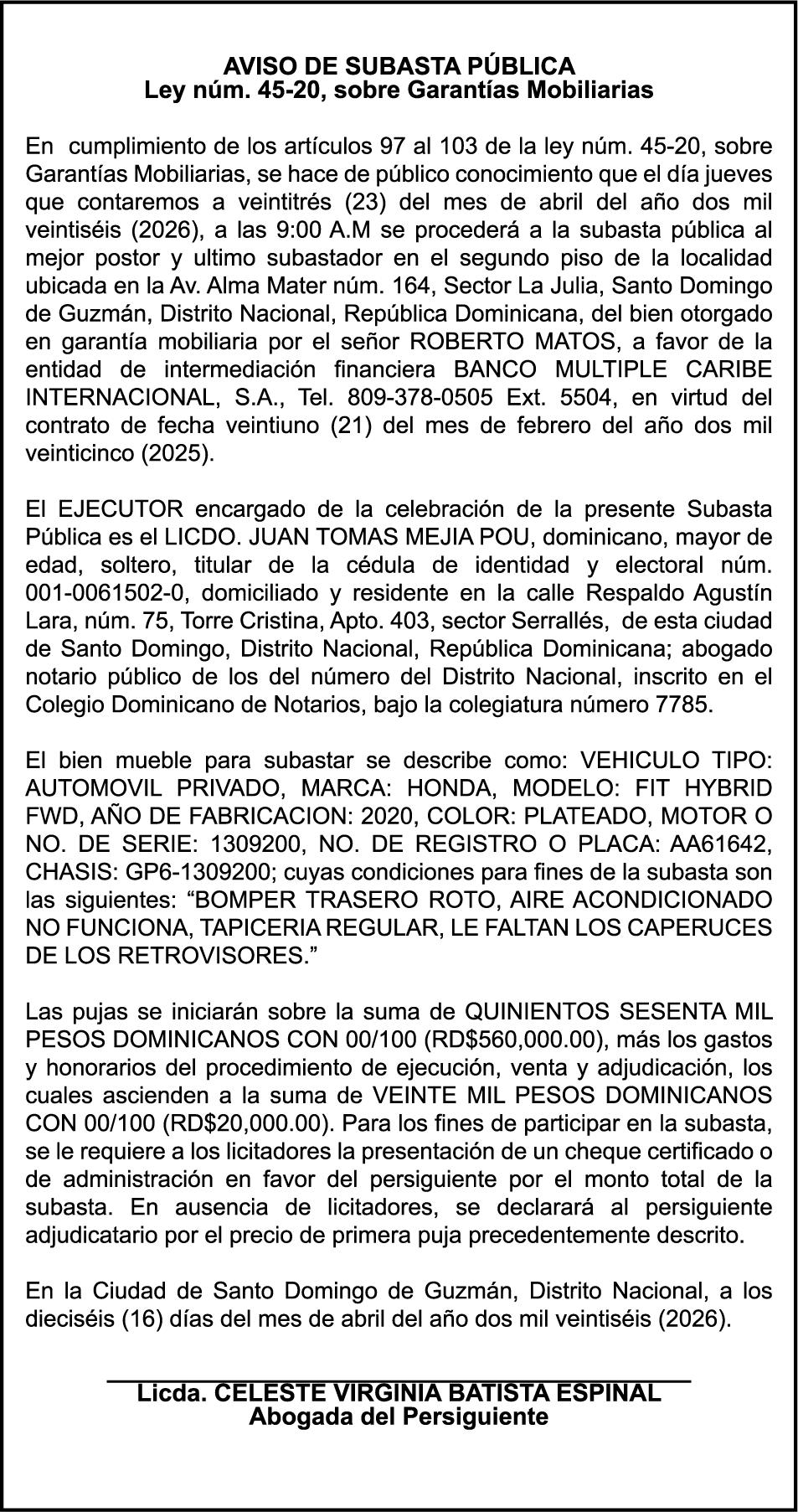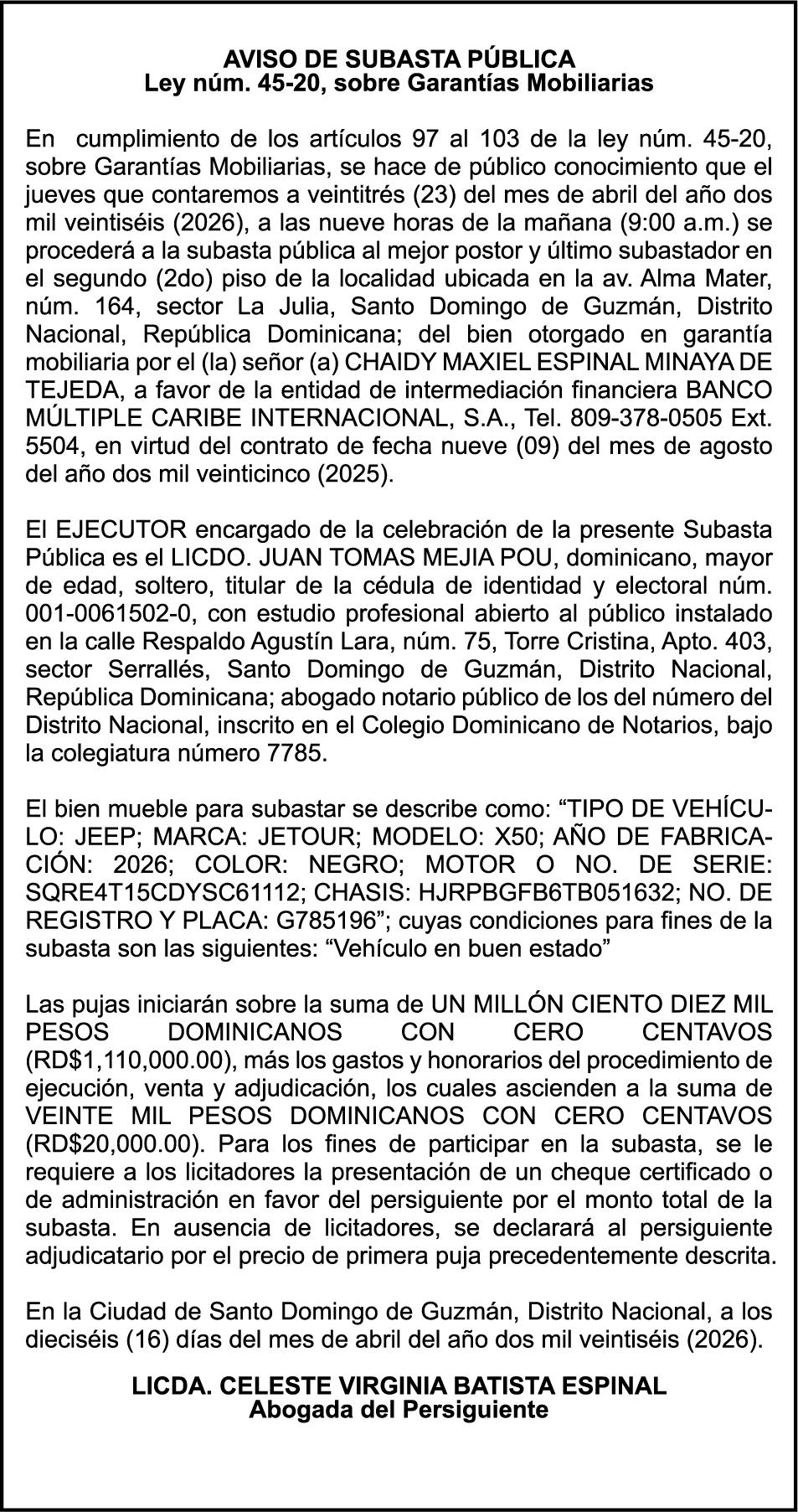 SE hace de público conocimiento la pérdida del Certificado Financiero número 851379784 emitido por Banco Popular Dominicano, S. A. Banco Múltiple, a nombre de JOSE TOMAS BETANCES CASTRO, portador de la Cédula de Identidad y Electoral número 001-1227605-0, certificado número 851379784 expedido el 26 de agosto de 2025 por el monto de (USD$57,000.00) más intereses generados a la fecha.