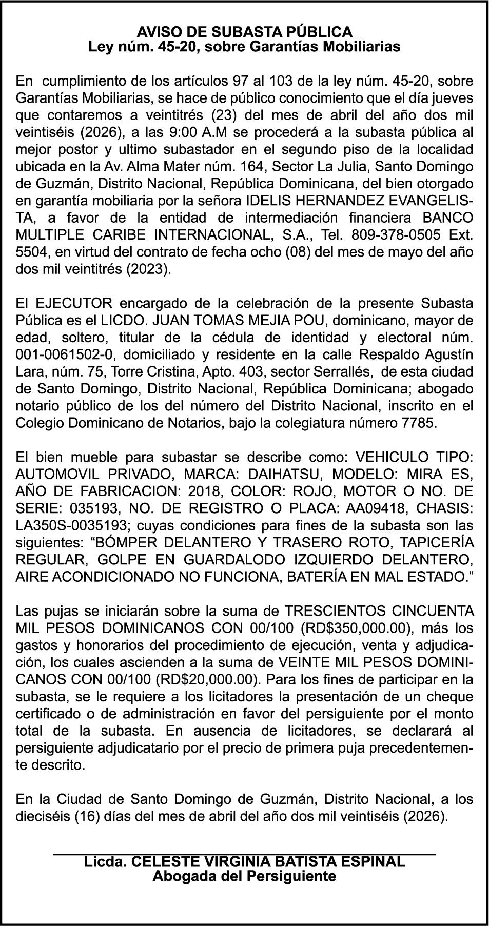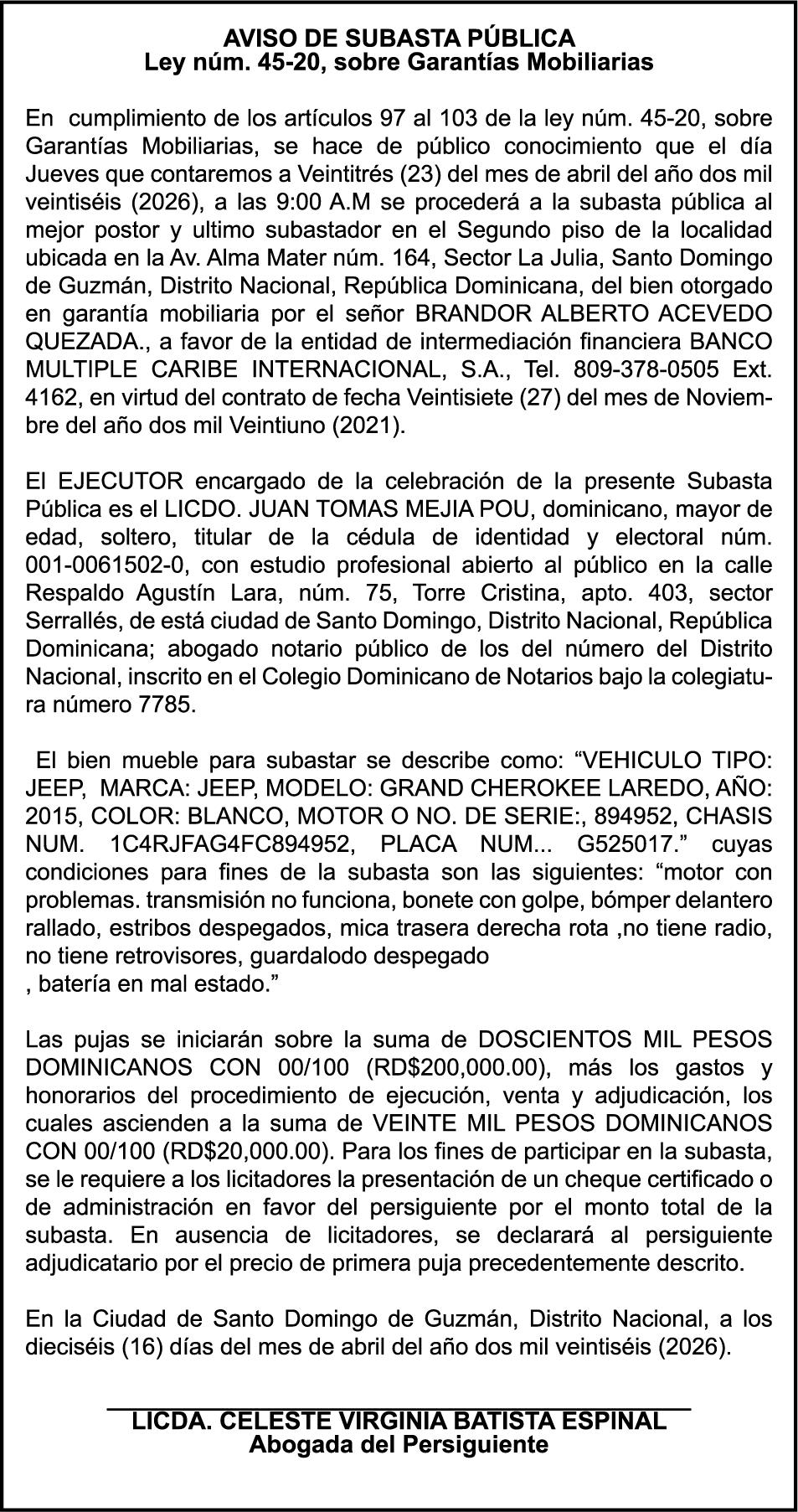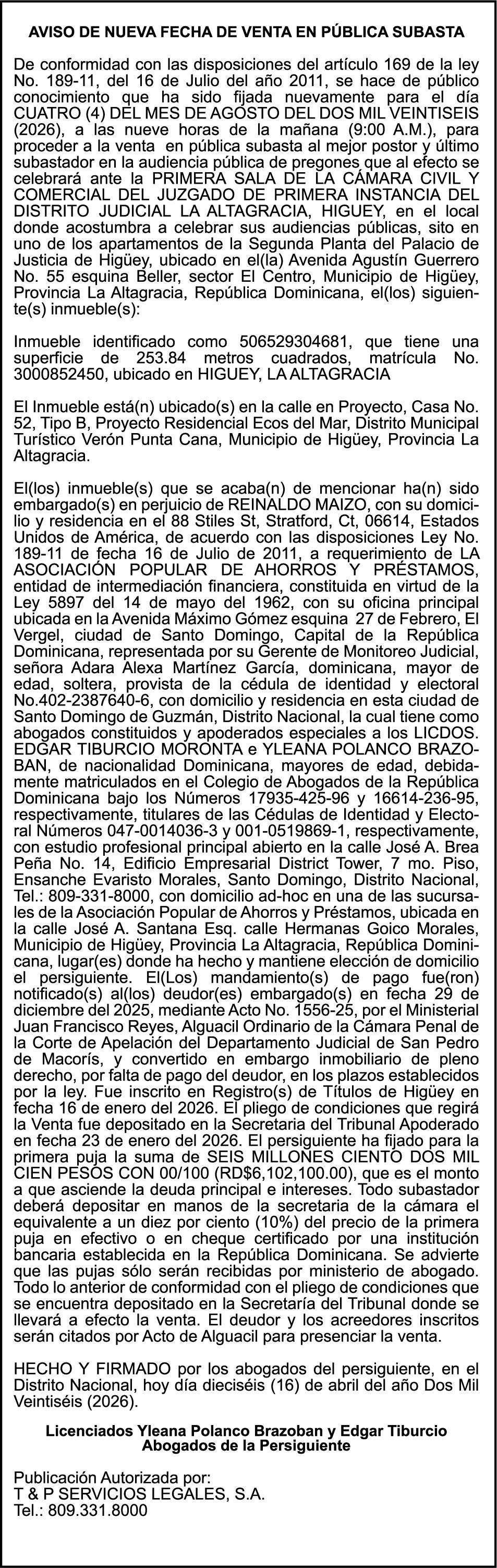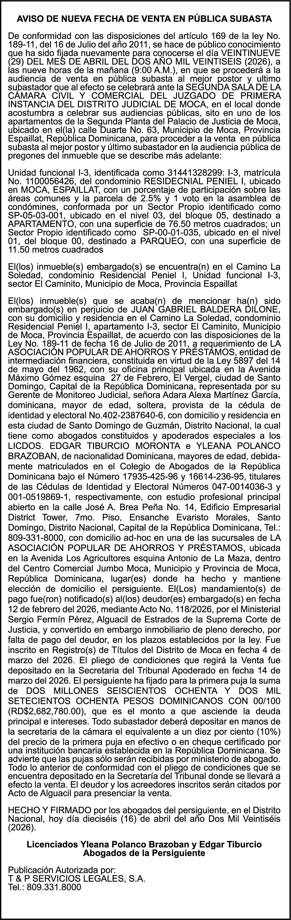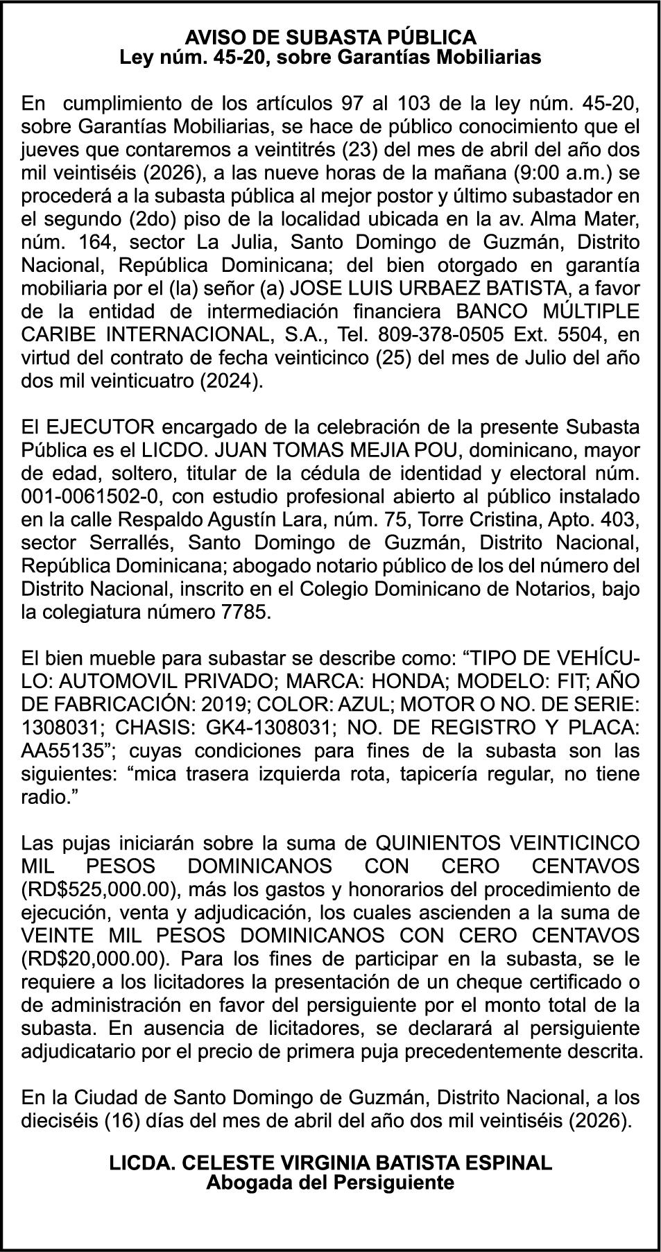 SE hace de público conocimiento la pérdida del Certificado Financiero número 851379784 emitido por Banco Popular Dominicano, S. A. Banco Múltiple, a nombre de JOSE TOMAS BETANCES CASTRO, portador de la Cédula de Identidad y Electoral número 001-1227605-0, certificado número 851379784 expedido el 26 de agosto de 2025 por el monto de (USD$57,000.00) más intereses generados a la fecha.