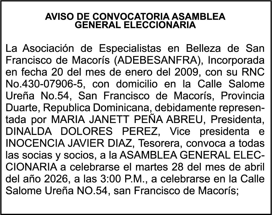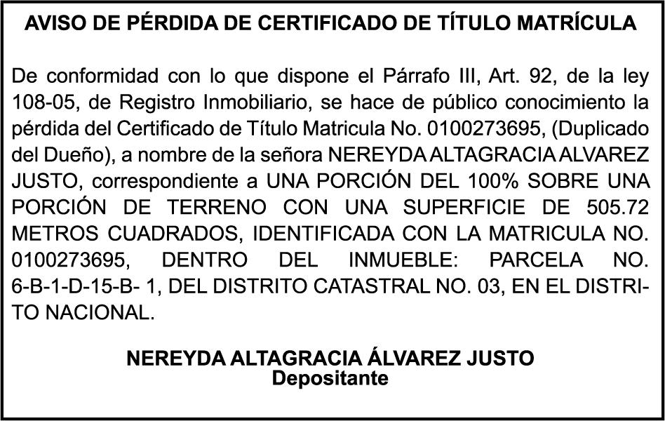 SE HACE de público conocimiento la pérdida del Certificado Financiero número 843424342 emitido por Banco Popular Dominicano, S. A. Banco Múltiple, a nombre de ELIZABETH DIOMERIS DE AZA SANTOS DE DE LA CRUZ, portadora de la Cédula de Identidad y Electoral número 026-0135000-8, certificado número 843424342 expedido en fecha 13 de agosto de 2024 por el monto de (RD$100,000.00) más intereses generados a la fecha.