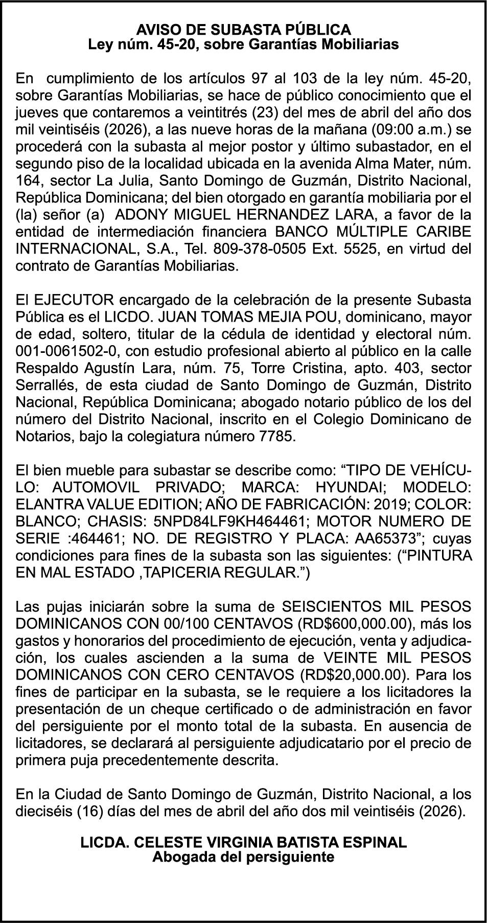 PERDIDA DE MATRICULA Automóvil privado HYUNDAI, modelo SONATA Y20, color plateado, año 2013, placa A904792, chasis kmhec41lbda528463, a nombre de SILVIO MARTE GONZALEZ.