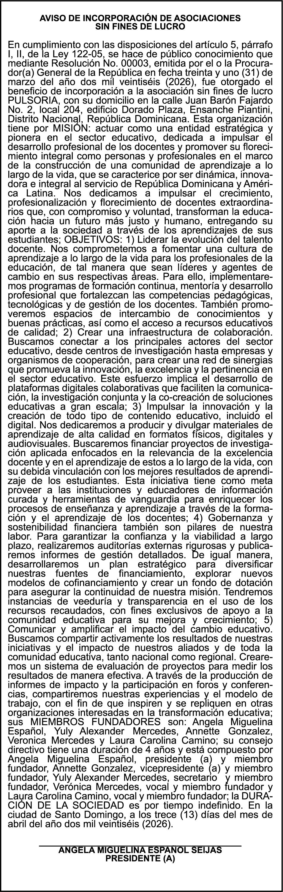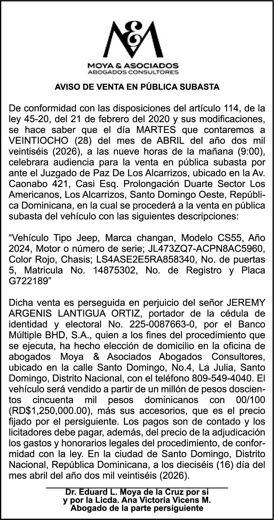 AVISO TRASPASO DE EMBARCACION.La compañía ALPHABOATS, S.R.L., debidamente representada por el señorVICTOR RAFAEL GONZALEZ PAZ, traspasa la lancha de recreo de nombre;GOAT 280” matricula No. LR-G44-3237LR, de 28.0 pies de eslora, para que en loadelante figure a nombre del señor ANGEL JESUS PEREIRA PORRUA, como nuevo propietario.