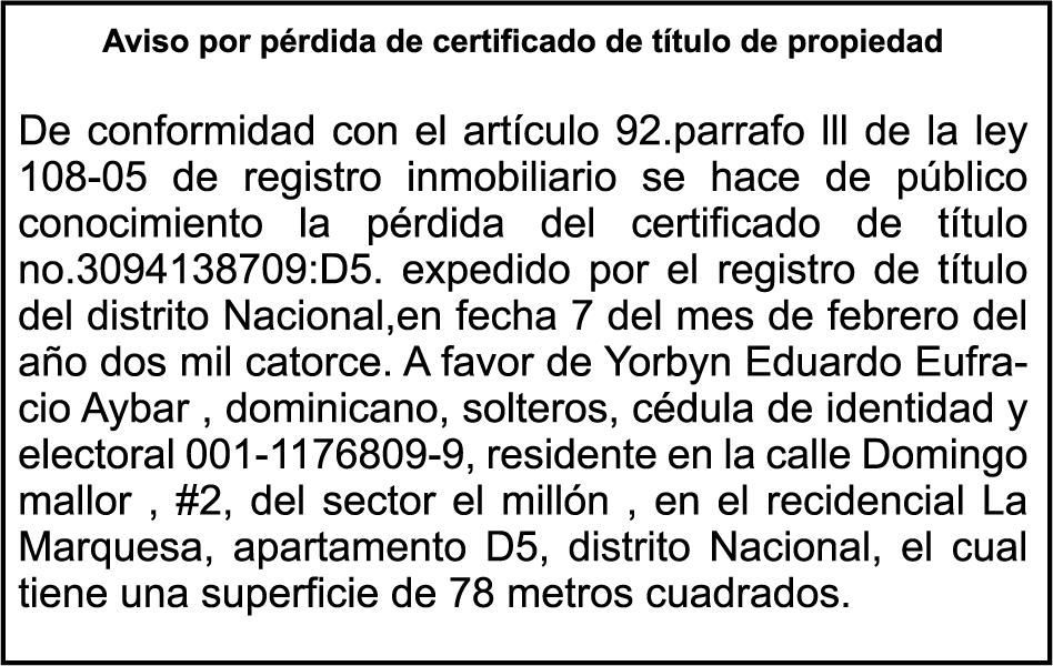 SE hace de público conocimiento la pérdida del Certificado Financiero número 800135618 emitido por Banco Popular Dominicano, S. A. Banco Múltiple, a nombre de YENIFER ADON, portadora de la Cédula de Identidad y Electoral número 225-0032425-0, certificado número 800135618 expedido en fecha 20 de diciembre de 2016 por el monto de (RD$62,411.22) más intereses generados a la fecha.