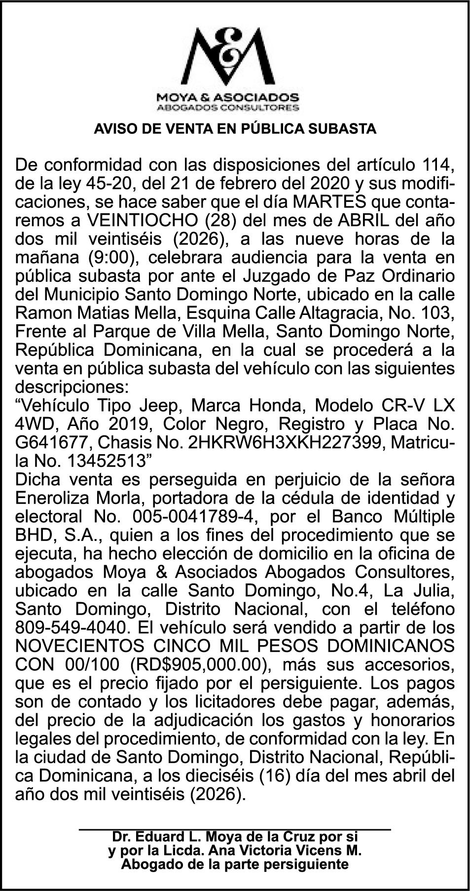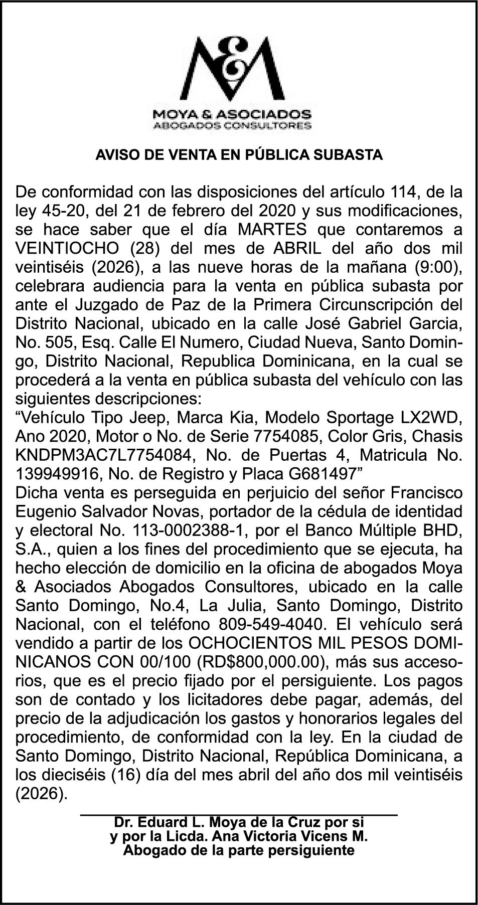 PERDIDA DE MATRICULA: Del Automovil, Placa AA40341, Chasis KNAGU416BKA291638, Marca KIA, Modelo k5, Color BLANCO, AÑO 2019,a nombre de MELVIN MORA PAULINO, Ced. 00115696247