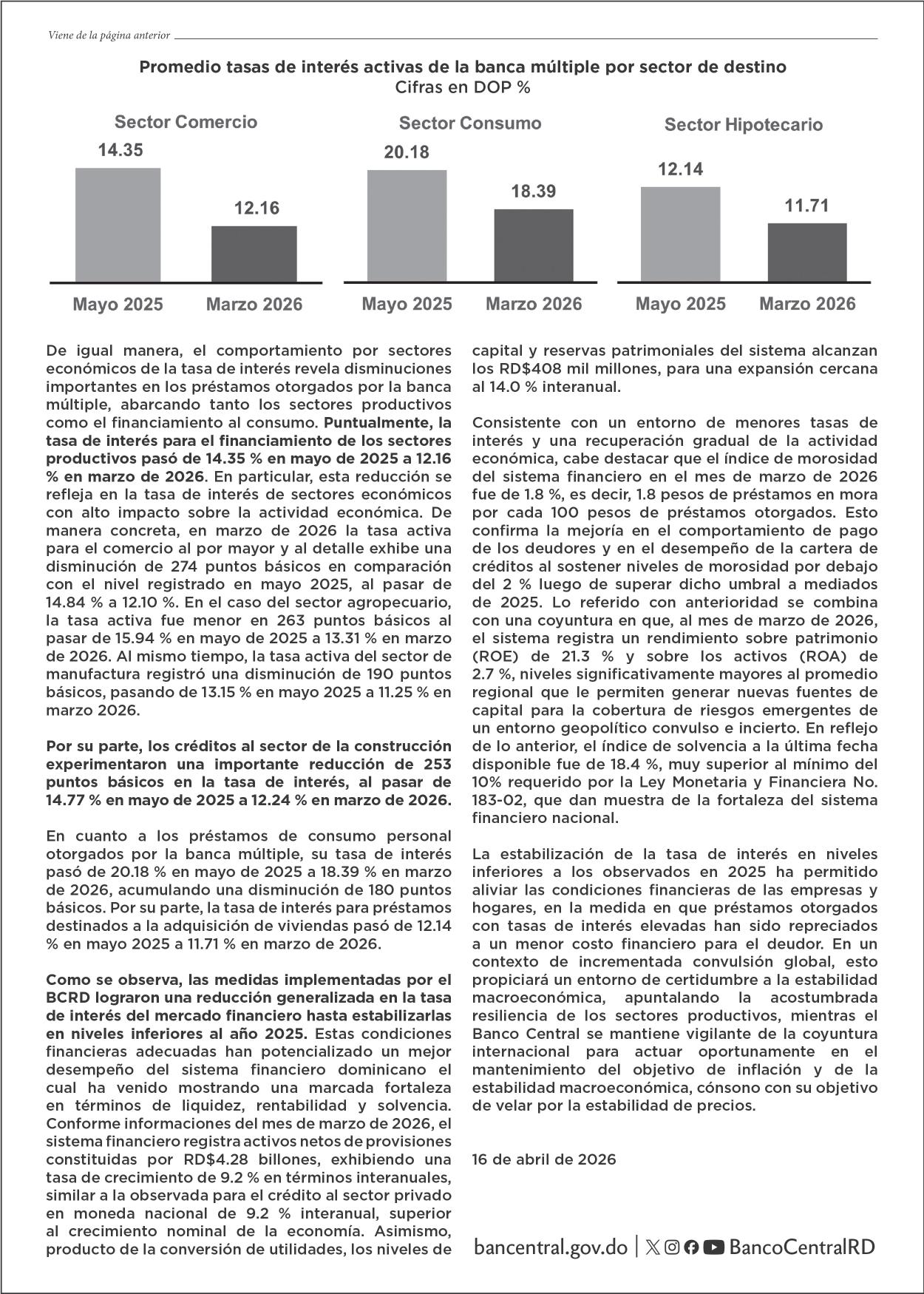BALANCE. Banco Central destaca que las reducciones se reflejan en los sectores comercio, manufactura, agro y construcción y en los préstamos personales. P.24