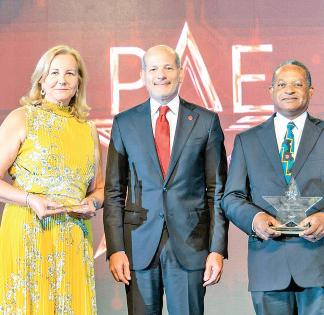 El presidente Abinader y miembros del Consejo de Desarrollo Económico y Social de Santo Domingo (Codessd) como organizadores del evento, entregaron la placa de reconocimiento.