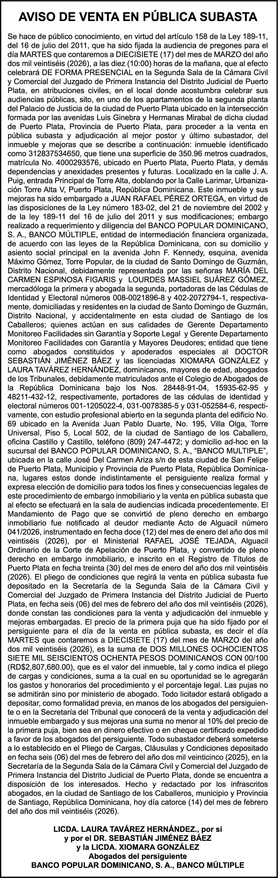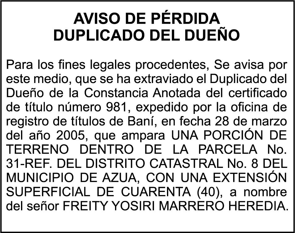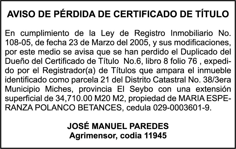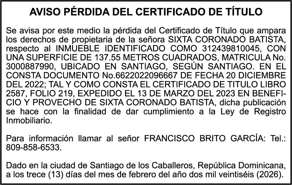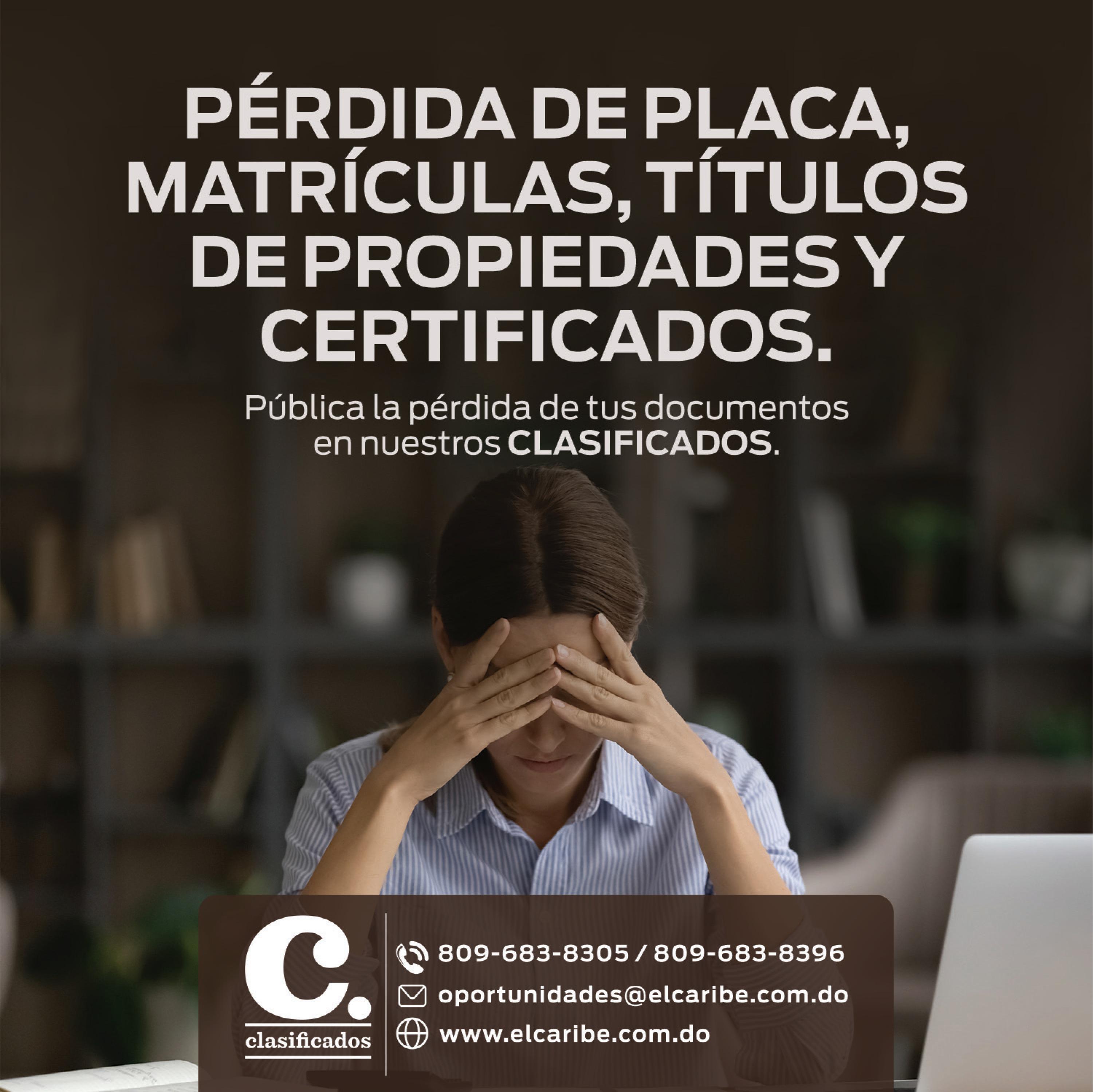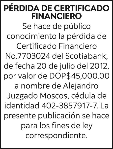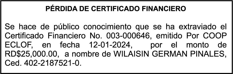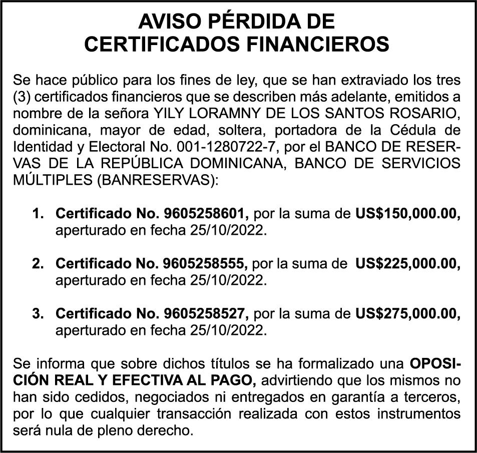 SE hace de público conocimiento la pérdida del Certificado Financiero número 830631198 emitido por Banco Popular Dominicano, S. A. Banco Múltiple, a nombre de BELKI MARIA RIVERA ALMONTE, portadora de la Cédula de Identidad y Electoral número 001-0359413-1, certificado número 830631198 expedido en fecha 10 de noviembre de 2022 por el monto de (RD$574,541.01) más intereses generados a la fecha.