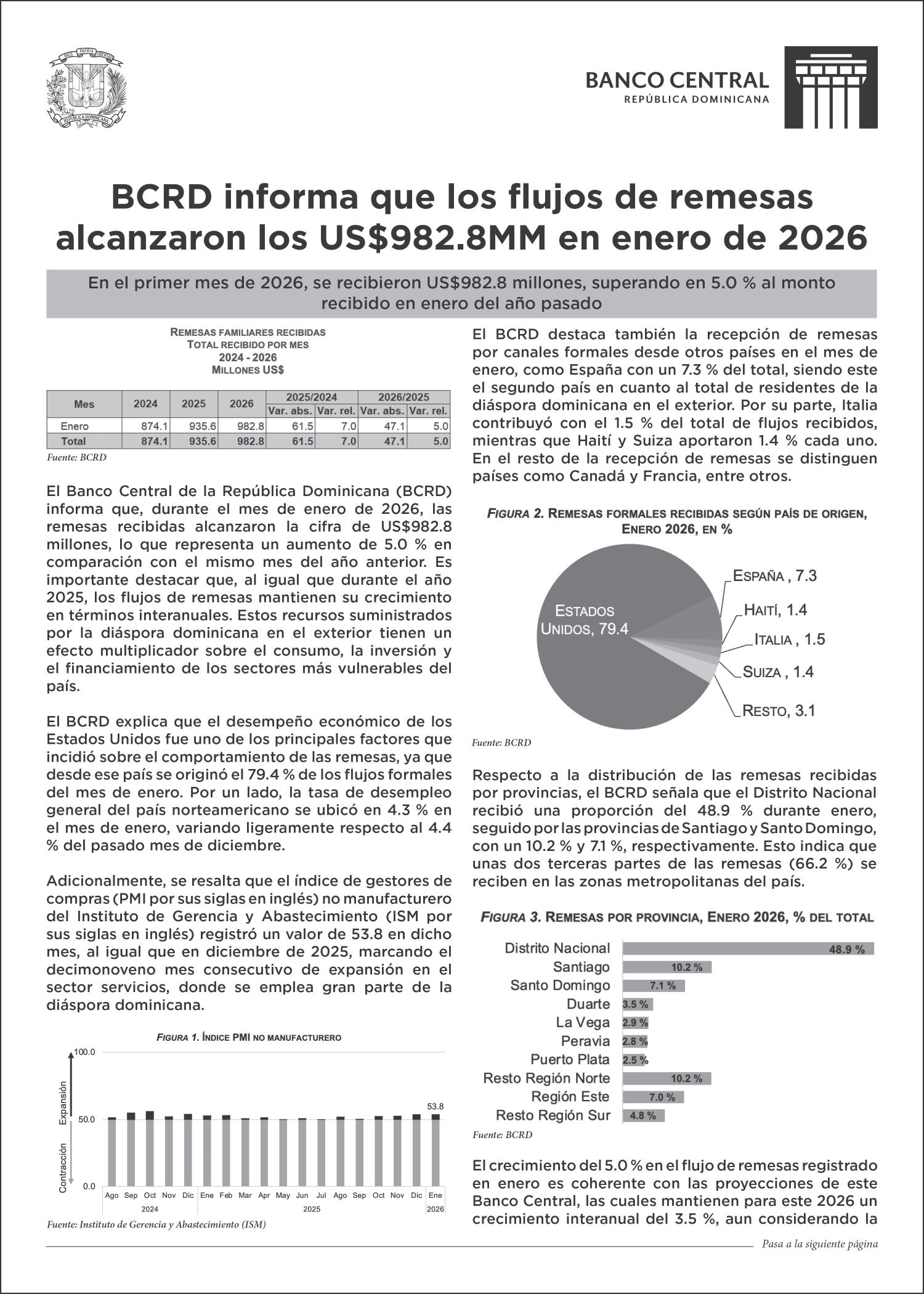 BC precisa que la cifra representa un aumento de 5.0 % en comparación con el mismo mes del año anterior. Desde EE. UU. se originó el 79.4 % de los envíos de la diáspora. P.21
