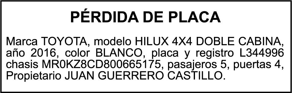 PERDIDA DE CHAPA No. L316990,CHASIS MPATFR54JDT000228, CARGA,Modelo D-MAX 2.5 MEC 2CAB., Color BLANCO, Año 2013, A NOMBRE DE GRUPO ALONZO S A