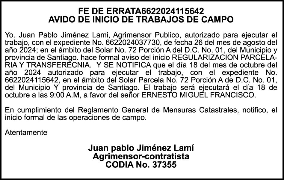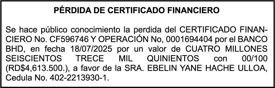 SE HACE de público conocimiento la pérdida del Certificado Financiero número 714429131 emitido por Banco Popular Dominicano, S. A. Banco Múltiple, a nombre de FRANCISCO ISAAC PIMENTEL LIRIANO, portador de la Cédula de Identidad y Electoral número 023-0092328-7, certificado número 714429131 expedido en fecha en fecha 31 de diciembre de 2003 por el monto de (RD$54,000.33) más intereses generados a la fecha.