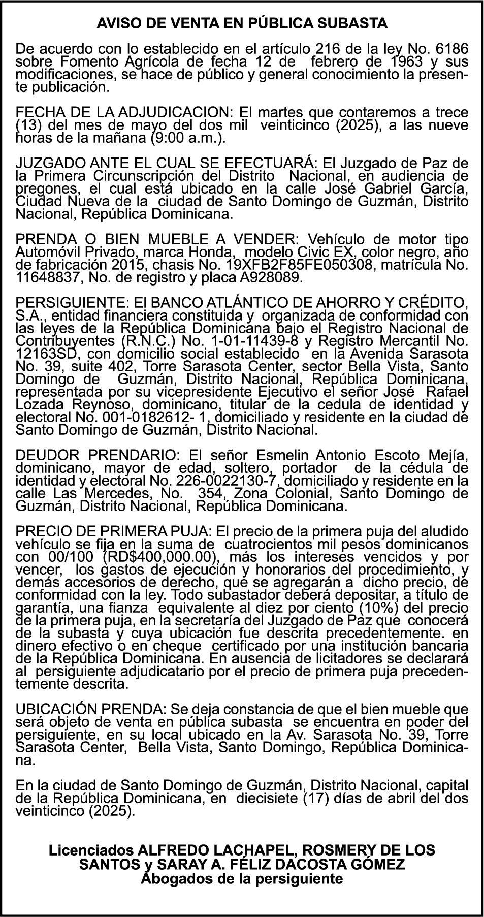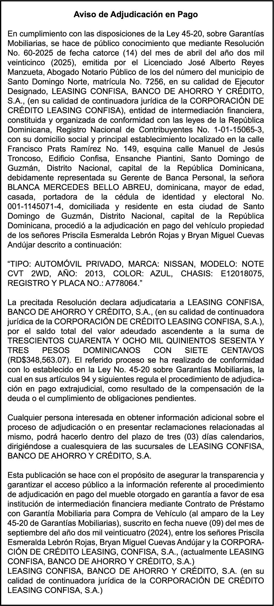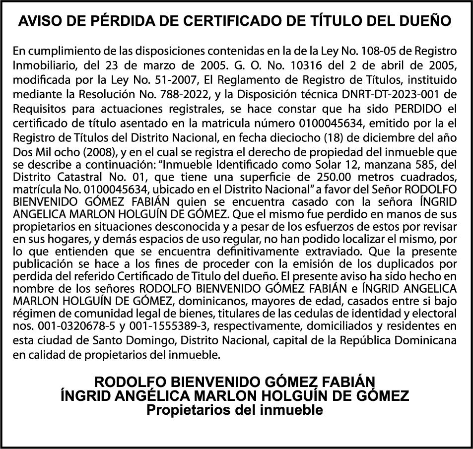 SE hace de público conocimiento la pérdida del Certificado Financiero número 839527249emitido por Banco Popular Dominicano, S. A. Banco Múltiple, ANGELA MARIA DE LOURDES DE LEON CANO DE UREÑA, portadora de la Cédula de Identidad y Electoral número 001-0924127-3 y ZAIRA AMANCIA DE LEON MARTINEZ, portadora de la Cédula de Identidad y Electoral número 001-0188798-2, certificado número 839527249, expedido en fecha 26 de febrero de 2024 por el monto de (RD$1,230,017.14) más intereses generados a la fecha.