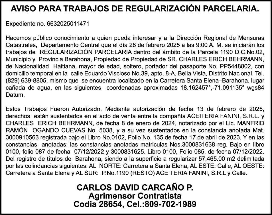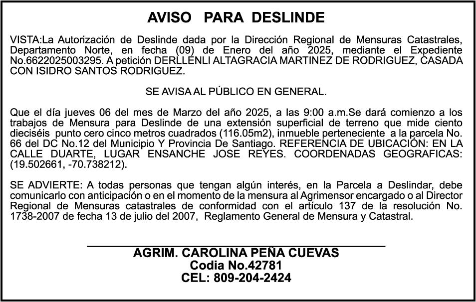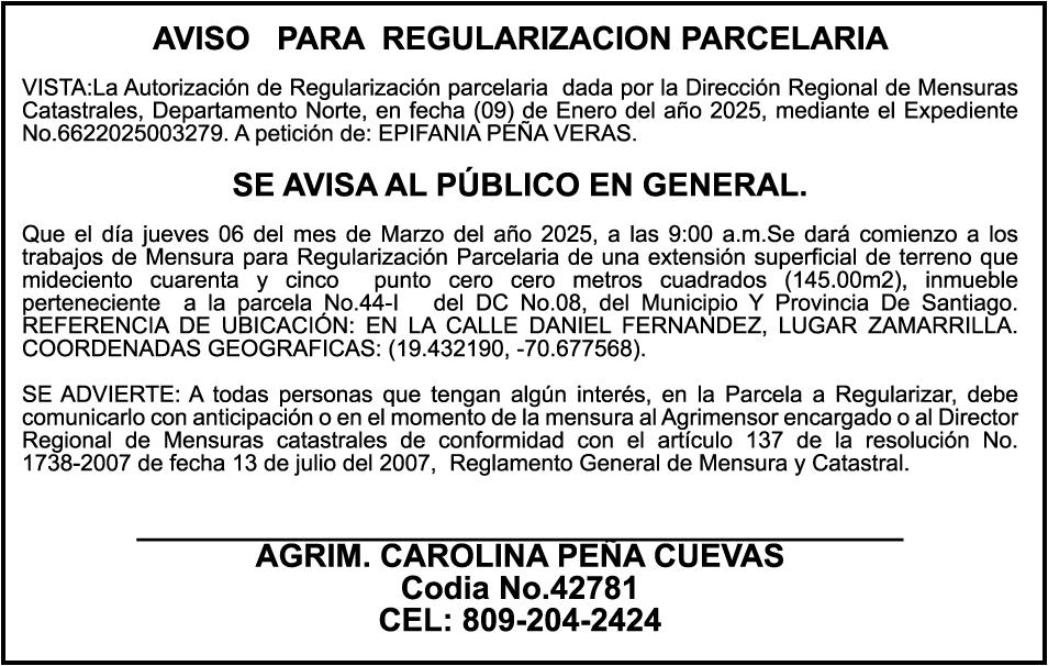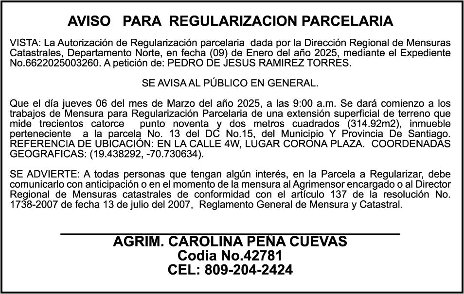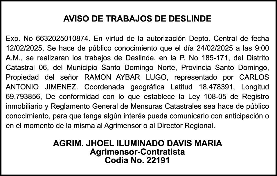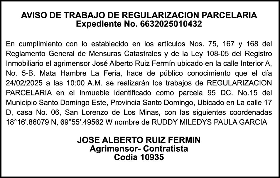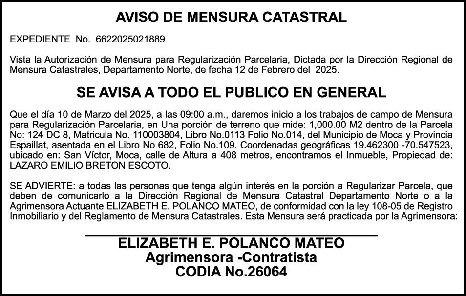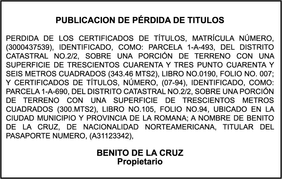 PERDIDA DE MATRICULA: Placa: L125259, Chasis: JAABL14S5H0713187, Marca: Isuzu, Color: Blanco, Año de fabricación: 1987, Nombre: Vicente Burdier Sánchez, Cédula: 048-0045349-2