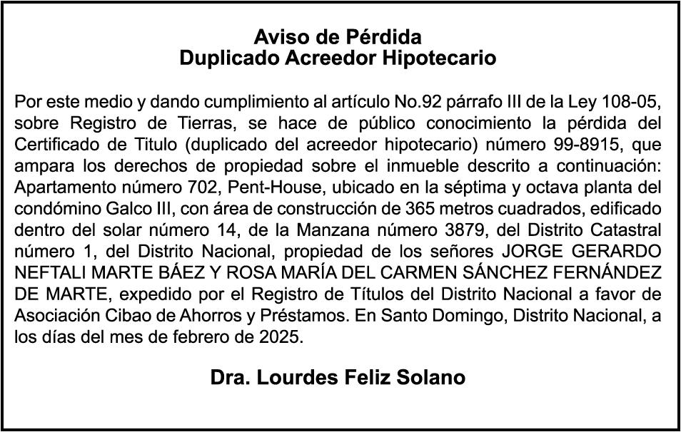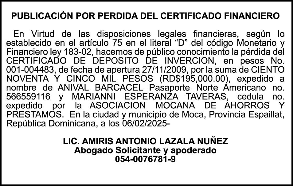 SE hace de público conocimiento la pérdida del Certificado Financiero número 729273276 emitido por Banco Popular Dominicano, S. A., a nombre de JACQUELINE FAJARDO BAUTISTA, portadora de la Cédula de Identidad y Electoral número 001-1528026-5 y ALEXANDRA MONEGRO BAUTISTA portadora de la Cédula de Identidad y Electoral 001-1441261-2. certificado número 729273276 expedido en fecha 6 de enero del 2006 por el monto de (RD$23,110.29), más intereses generados a la fecha.