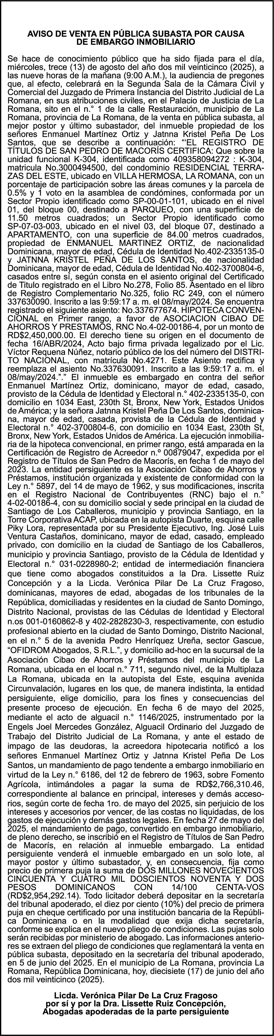 ADAMES, portadora de la Cédula de Identidad y Electoral número 224-0036858-9, certificado número 834465718 expedido en fecha 19 de junio de 2023 por el monto de (RD$299,760.49) más intereses generados a la fecha.