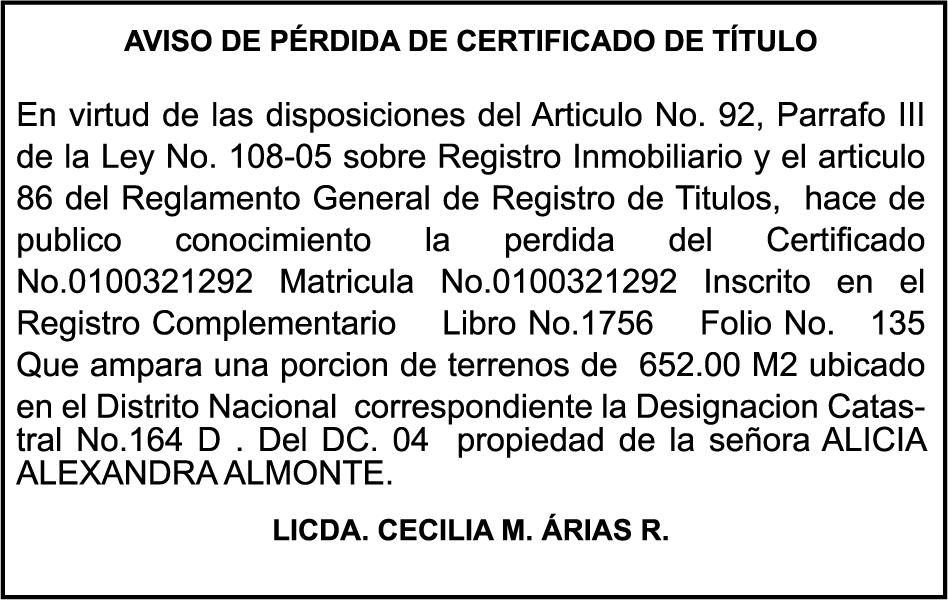 SE HACE de público conocimiento la pérdida del Certificado Financiero número 839781978 emitido por Banco Popular Dominicano, S. A. Banco Múltiple, a nombre de LUISA MARIA TEJEDA ORTEGA, portadora de la Cédula de Identidad y Electoral número 023-0150390-6, certificado número 839781978 expedido en fecha 6 de marzo de 2024 por el monto de (RD$163,799.29) más intereses generados a la fecha.