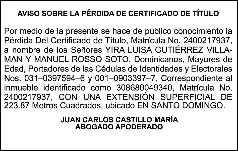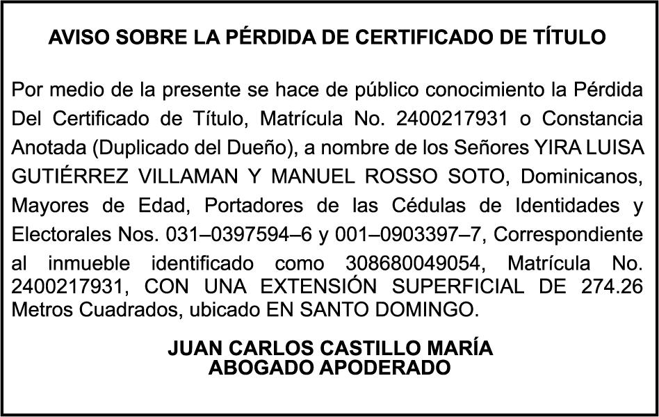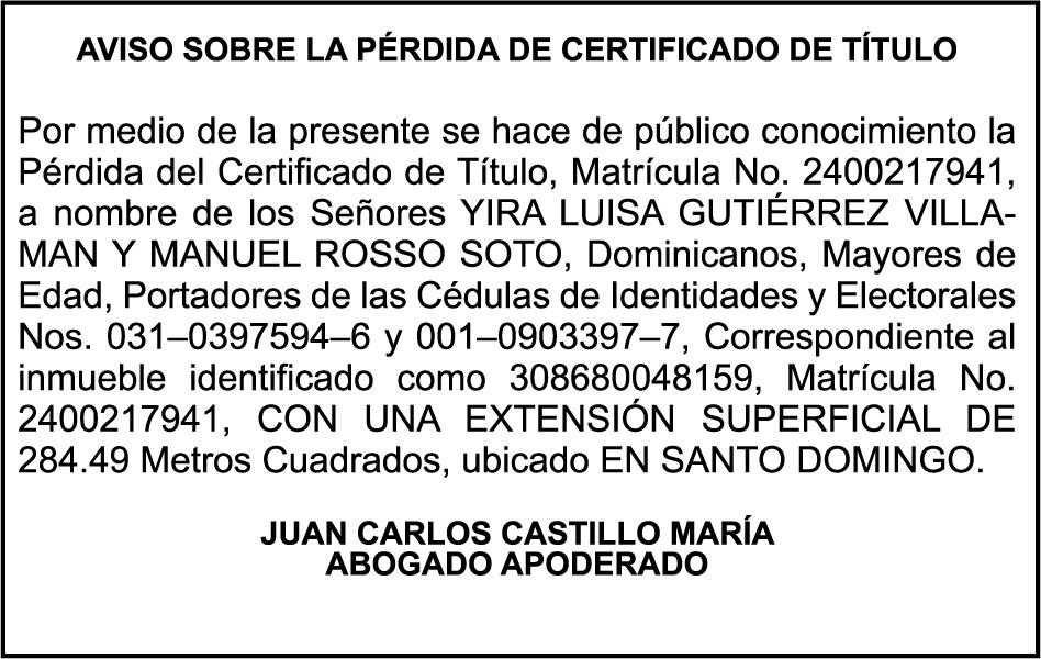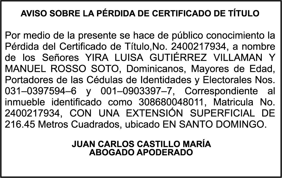 PERDIDA DE MATRICULA del vehiculo tipo JEEP marca HYUNDAI, Modelo JEEPETA TUCSON año 2010, color BLANCO, Placa No. G217217, Chasis No. KMHJM81BBAU126238, a nombre de ESTHER CASTILLO BERROA
