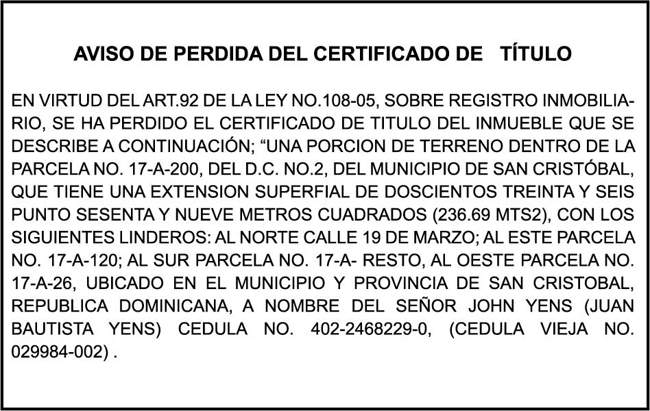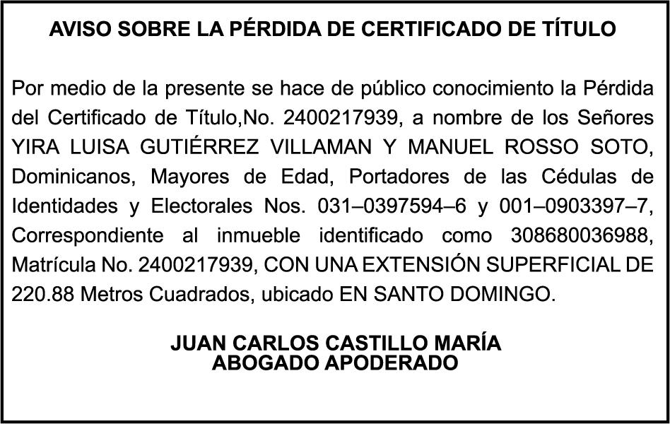 PERDIDA DE PLACA PLACA NO. DD03216 A NOMBRE DE INVERSIONES HERMANOS GUZMAN ESPINAL SRL RNC 132828003