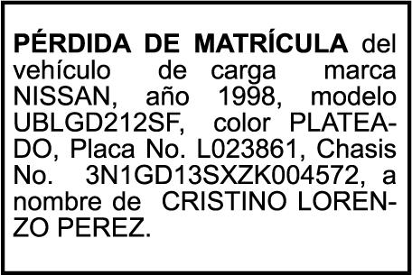 PERDIDA DE CHAPA No. L369021, Veh. Carga NISSAN, color blanco, año 2008, chasis JN1CJUD22Z0086468, a nombre de ENRIQUE MAÑON GARCIA.