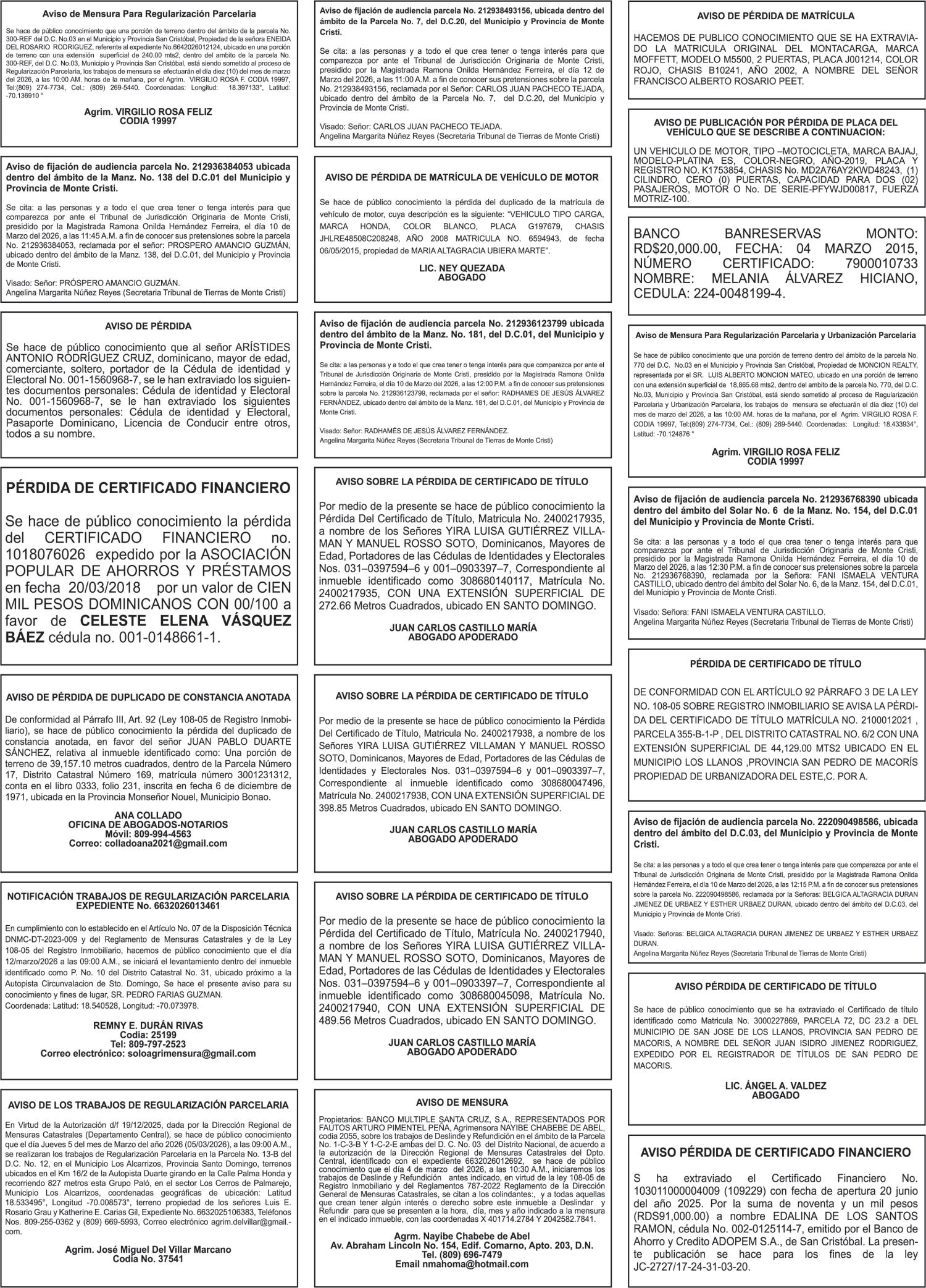 PERDIDA DE MATRICULA: Placa G109417,Chasis JSAFTD82V00109165,Marca SUZUKI,modelo GRAND VITARA,Color VERDE,Año 2002,a nombre de MAXIMO MARCELINO GARCIA, ced.031-0070283-0