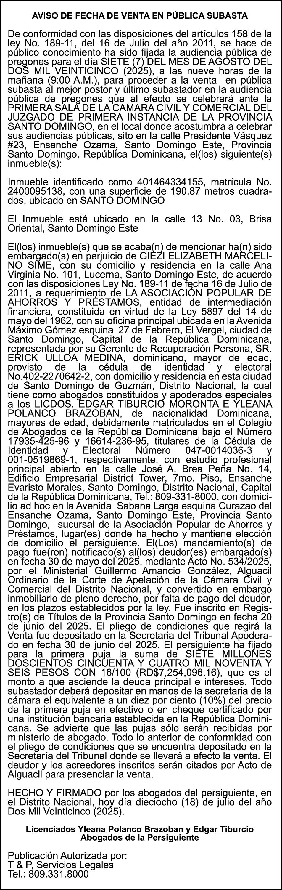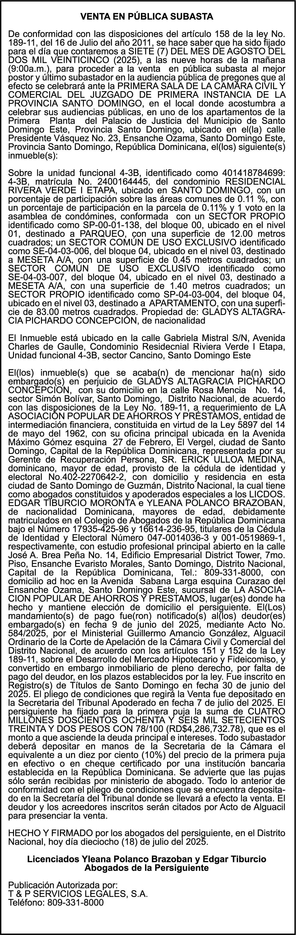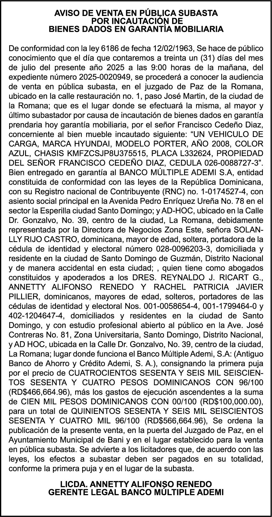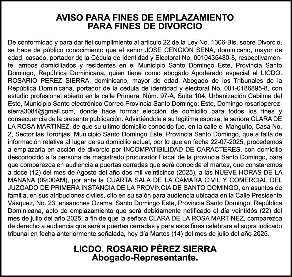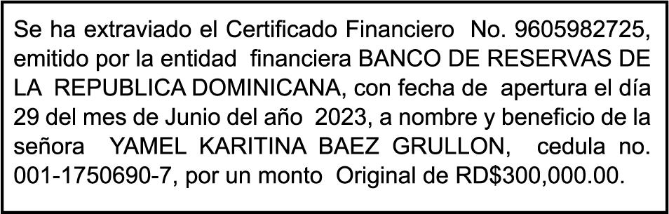 SE hace de público conocimiento la pérdida del Certificado Financiero número 839423290 emitido por Banco Popular Dominicano, S. A. Banco Múltiple, a nombre de ALIANZA DE MISERICORDIA RNC número 4-30-31625-3, debidamente representada Por KARINA MERCEDES ESPINO UREÑA, portadora de la Cédula de Identidad y Electoral número 001-1831550-6 y HELOISA DE SOUSA LEITE, portadora de la Cédula Pasaporte No. FX707095, certificado número 839423290 expedido en fecha 20 de febrero de 2024 por el monto de (RD$813,787.00) más intereses generados a la fecha.