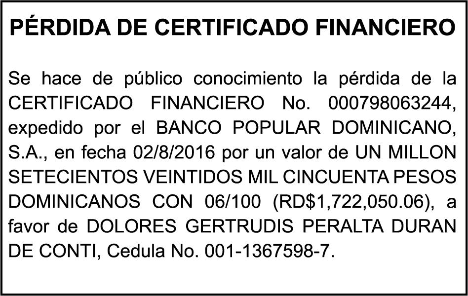 SE HACE de público conocimiento la pérdida del Certificado Financiero número 714429131 emitido por Banco Popular Dominicano, S. A. Banco Múltiple, a nombre de FRANCISCO ISAAC PIMENTEL LIRIANO, portador de la Cédula de Identidad y Electoral número 023-0092328-7, certificado número 714429131 expedido en fecha en fecha 31 de diciembre de 2003 por el monto de (RD$54,000.33) más intereses generados a la fecha.