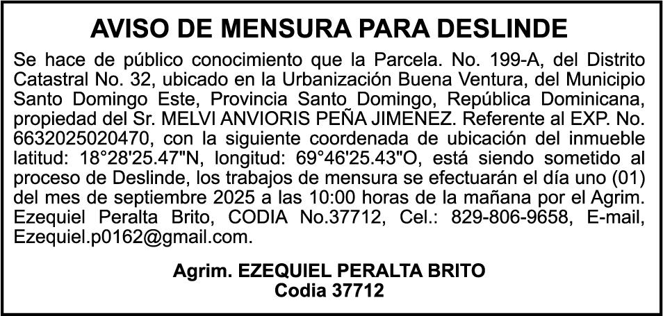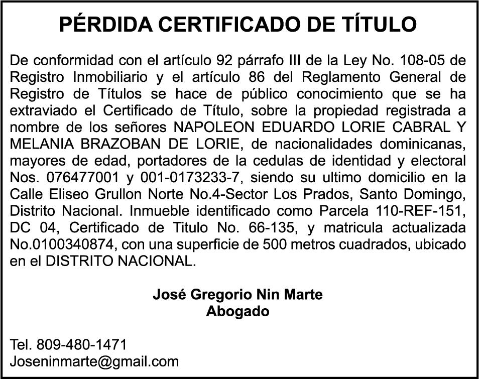 SE hace de público conocimiento la pérdida del Certificado Financiero número 848952354 emitido por Banco Popular Dominicano, S. A. Banco Múltiple, a nombre de WLT WORLD LOGISTICS TRANSPORTS, SRL RNC número 1-32-07083-6, debidamente representada por SANDY MANUEL DELGADO, portador de la Cédula de Identidad y Electoral número 001-1121614-9 y ANA CAROLINE VASQUEZ ROJAS, portadora de la Cédula de Identidad y Electoral número 402-3565898-2, certificado número 848952354 expedido en fecha 2 de julio de 2025 por el monto de (US$30,000.00) más intereses generados a la fecha.