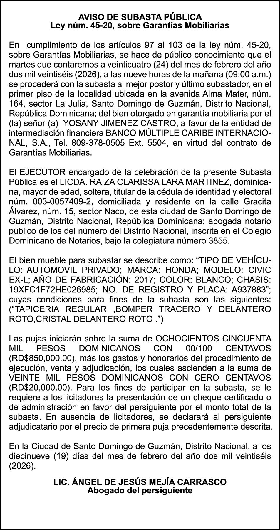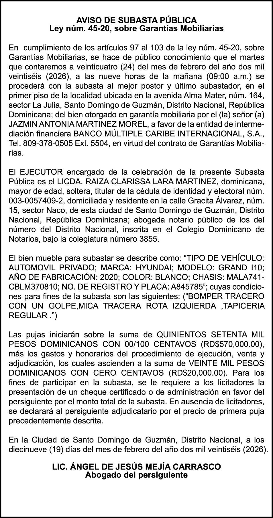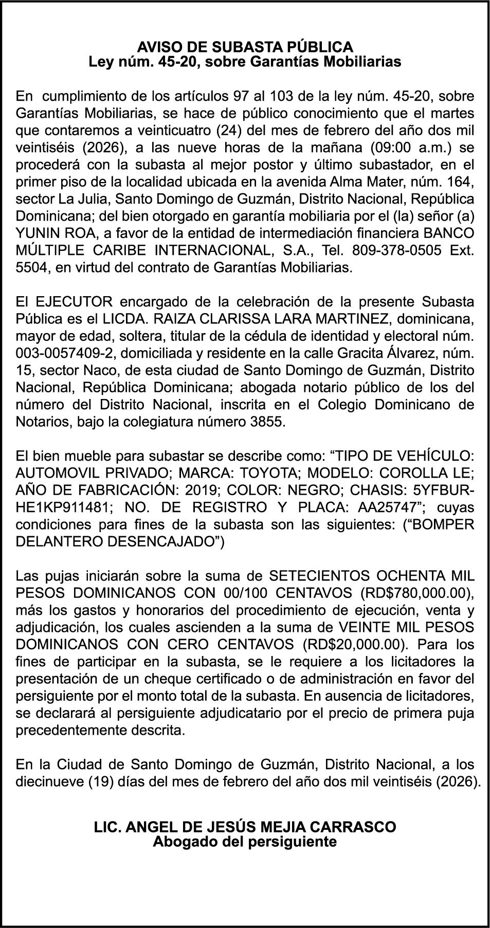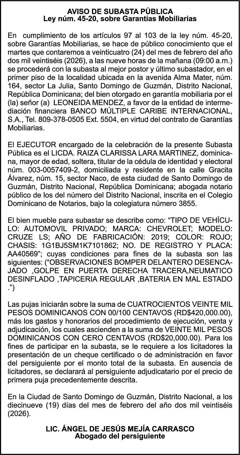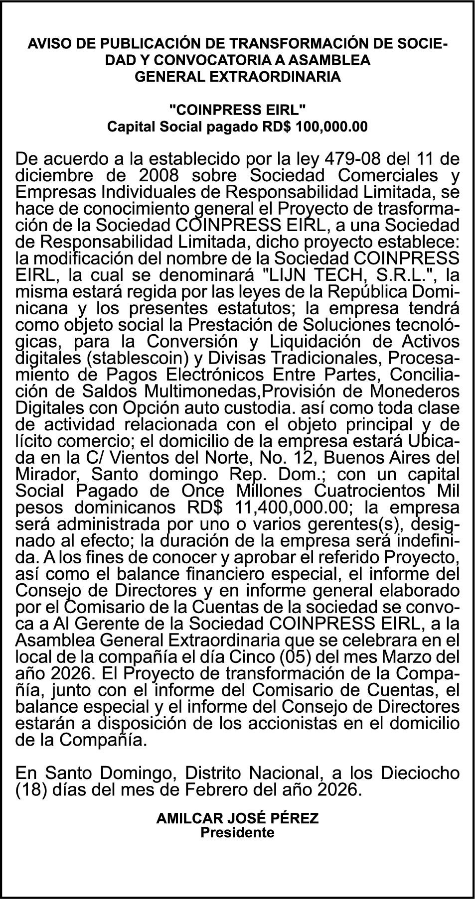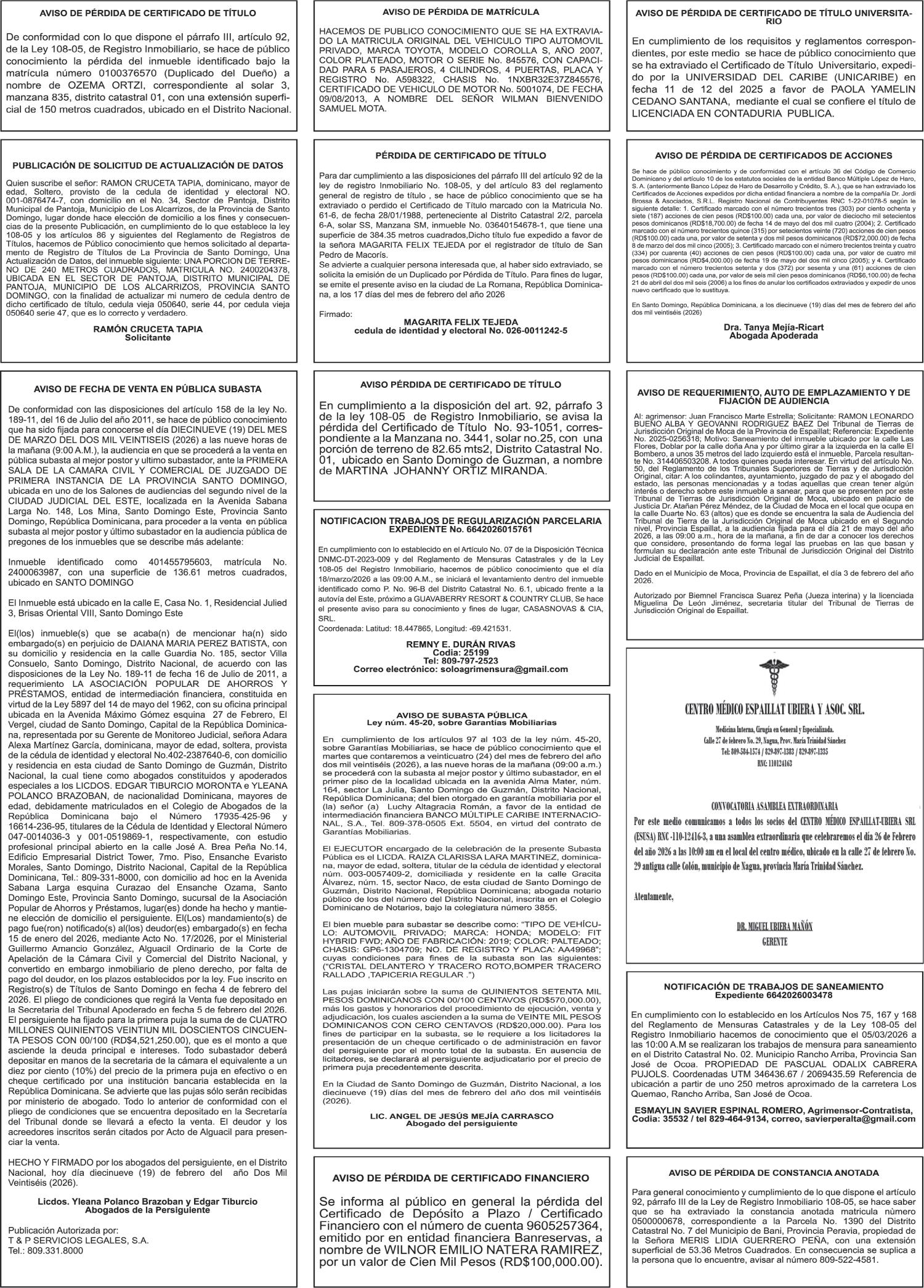 SE hace de público conocimiento la pérdida del Certificado Financiero número 853139483 emitido por Banco Popular Dominicano, S. A. Banco Múltiple, a nombre de JUNIOR ALCIDES VASQUEZ ALONZO, portador de la Cédula de Identidad y Electoral número 402-4477318-6, certificado número 853139483 expedido en fecha 3 de diciembre de 2025, por el monto de (RD$50,945.81) más intereses generados a la fecha.