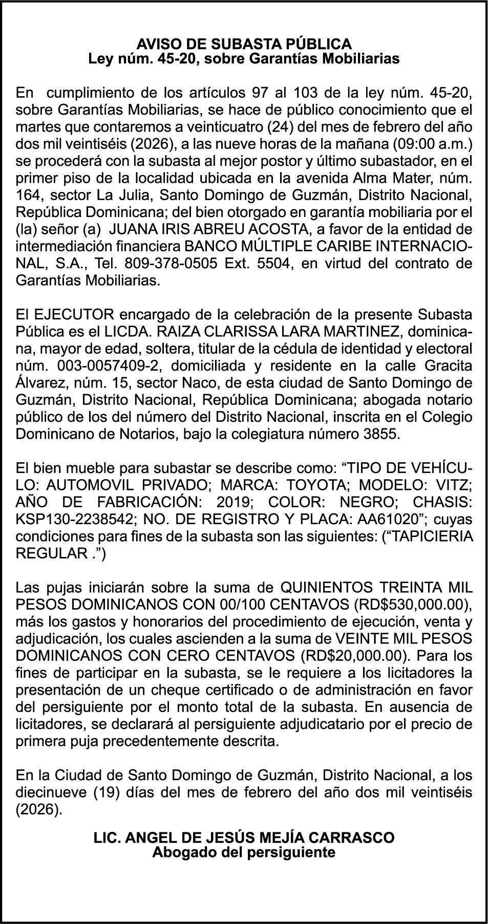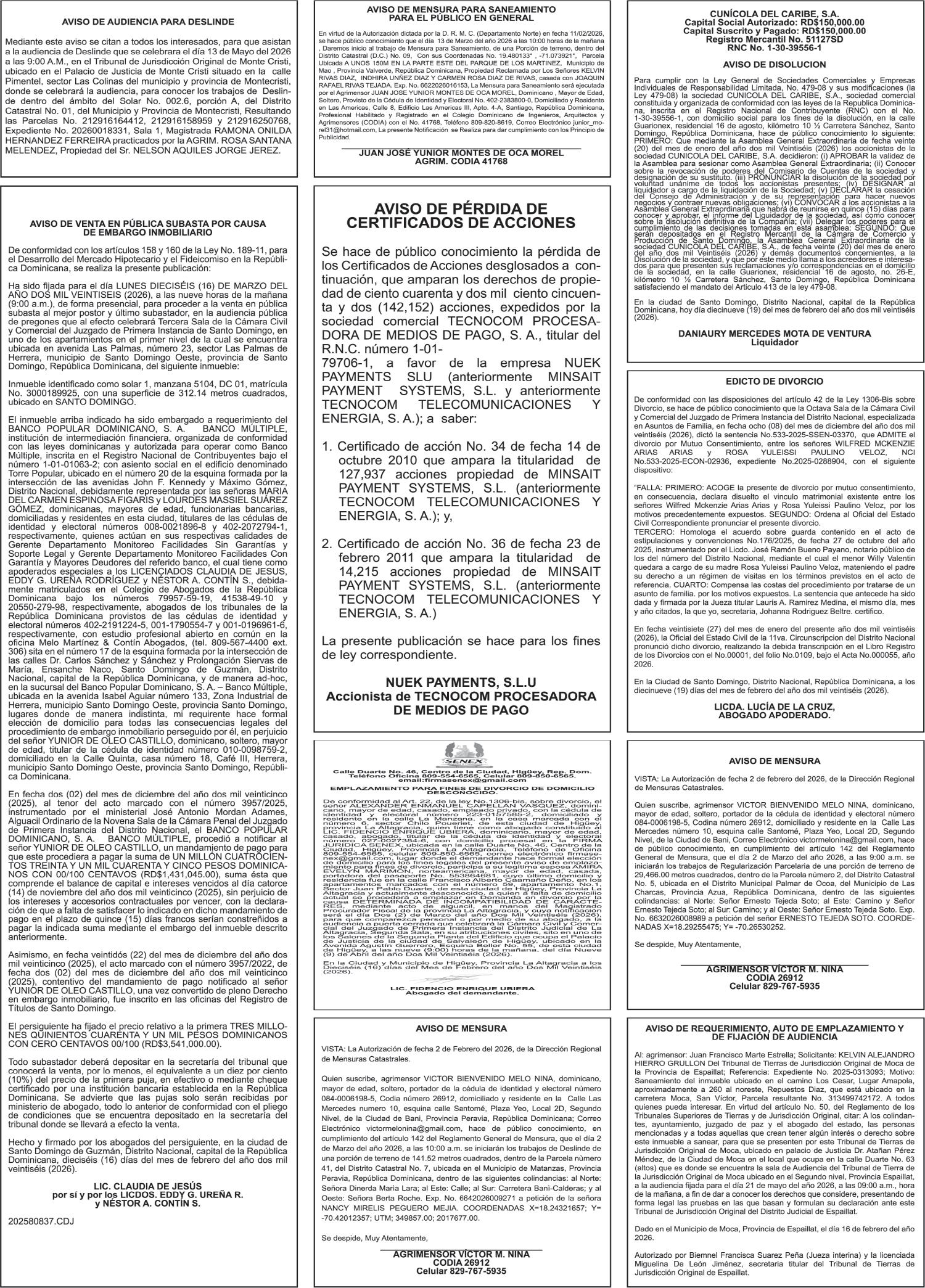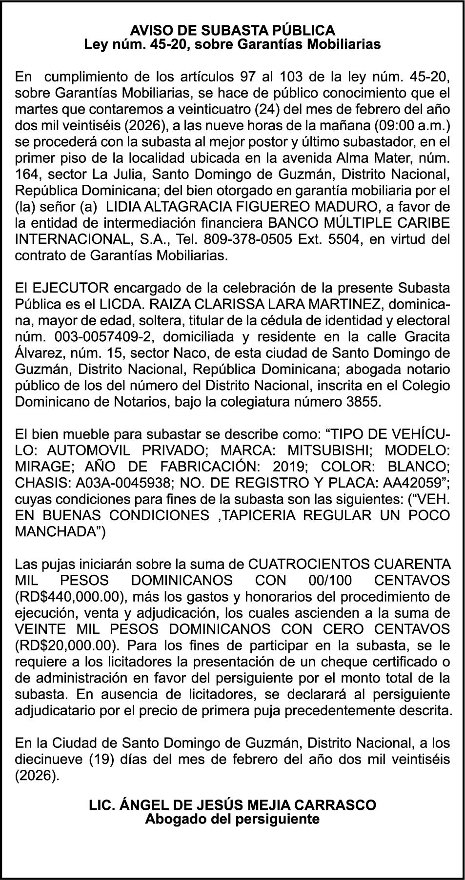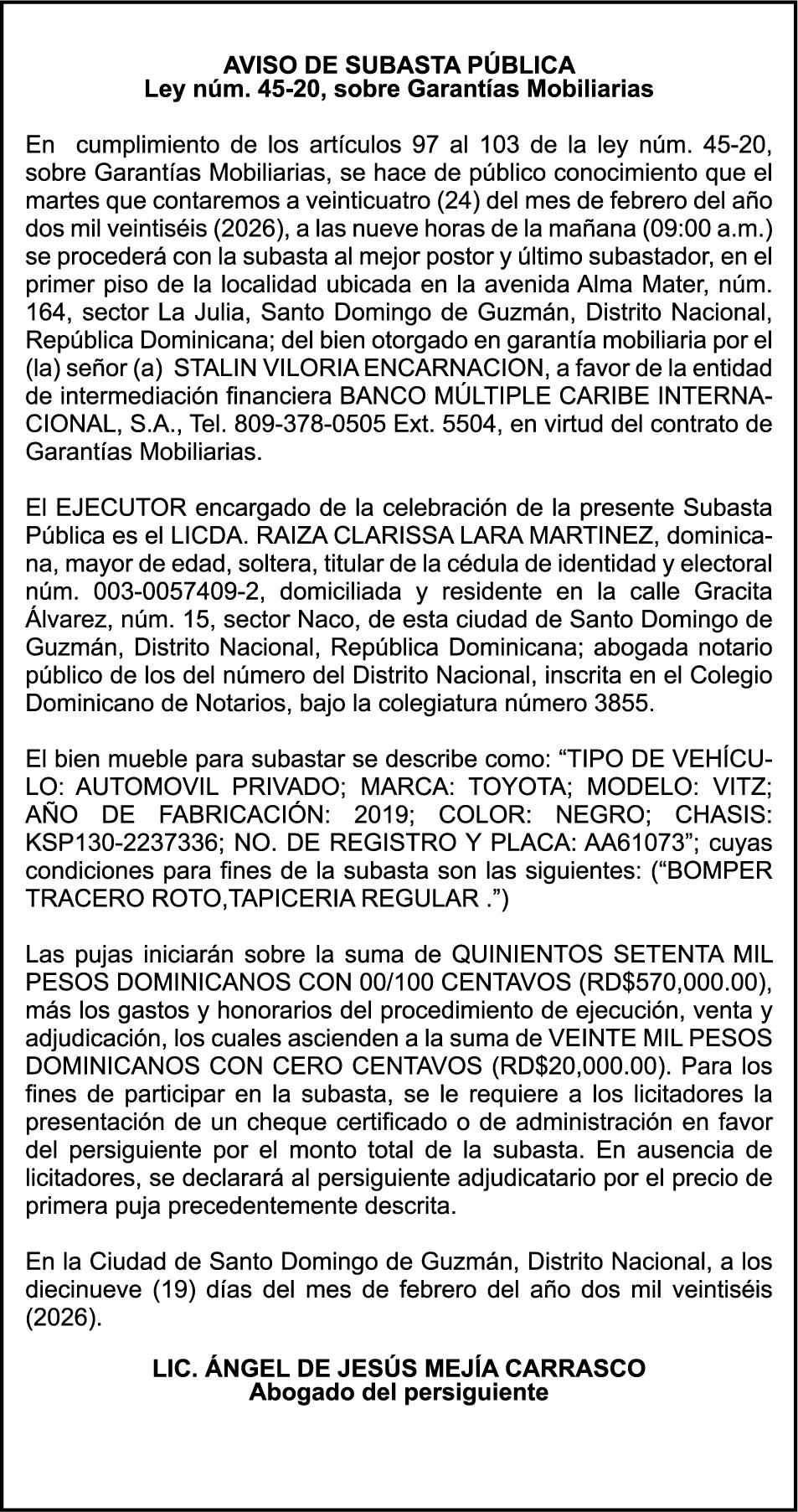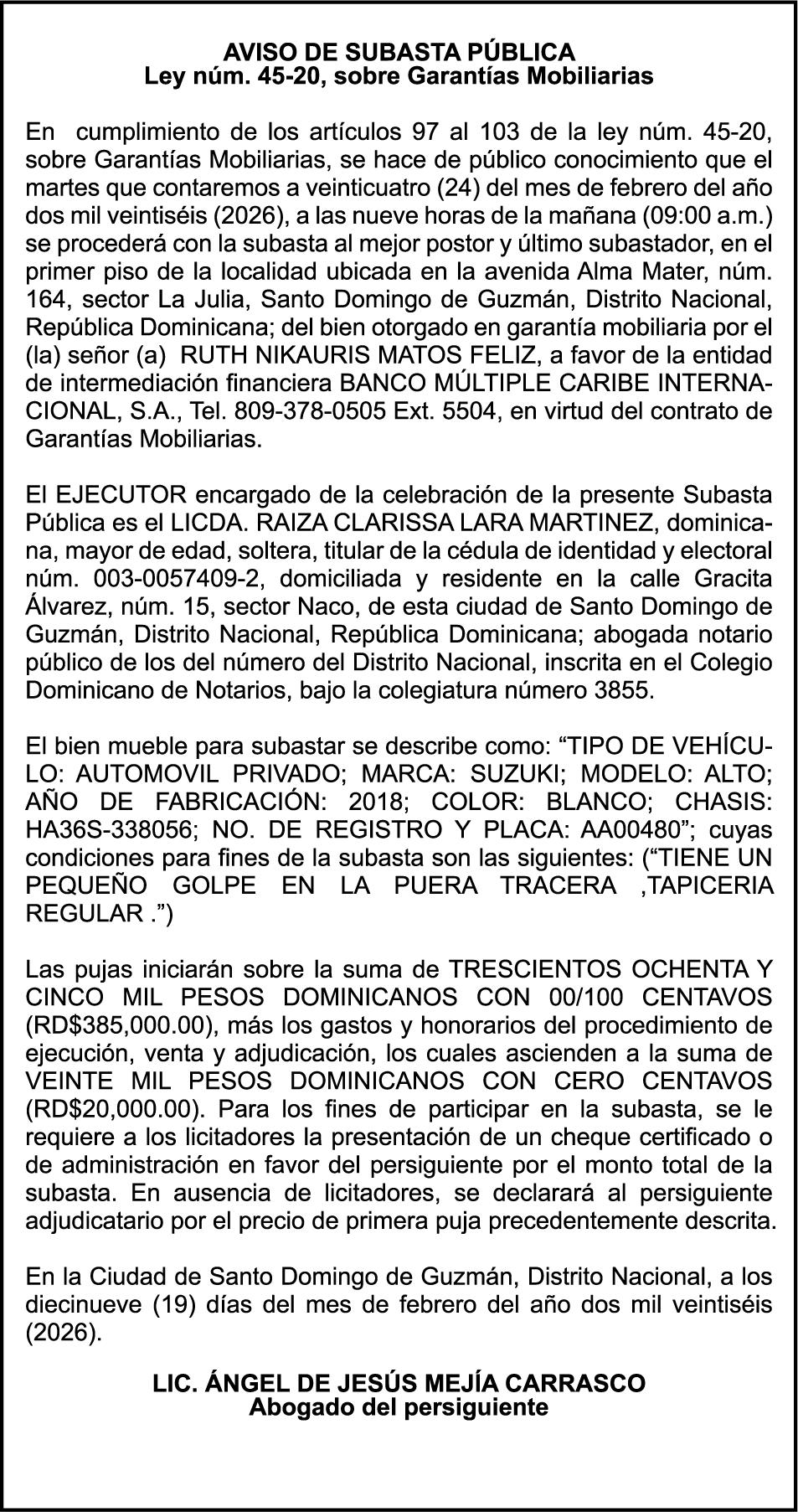 SE hace de público conocimiento la pérdida del Certificado Financiero número 853139483 emitido por Banco Popular Dominicano, S. A. Banco Múltiple, a nombre de JUNIOR ALCIDES VASQUEZ ALONZO, portador de la Cédula de Identidad y Electoral número 402-4477318-6, certificado número 853139483 expedido en fecha 3 de diciembre de 2025, por el monto de (RD$50,945.81) más intereses generados a la fecha.
