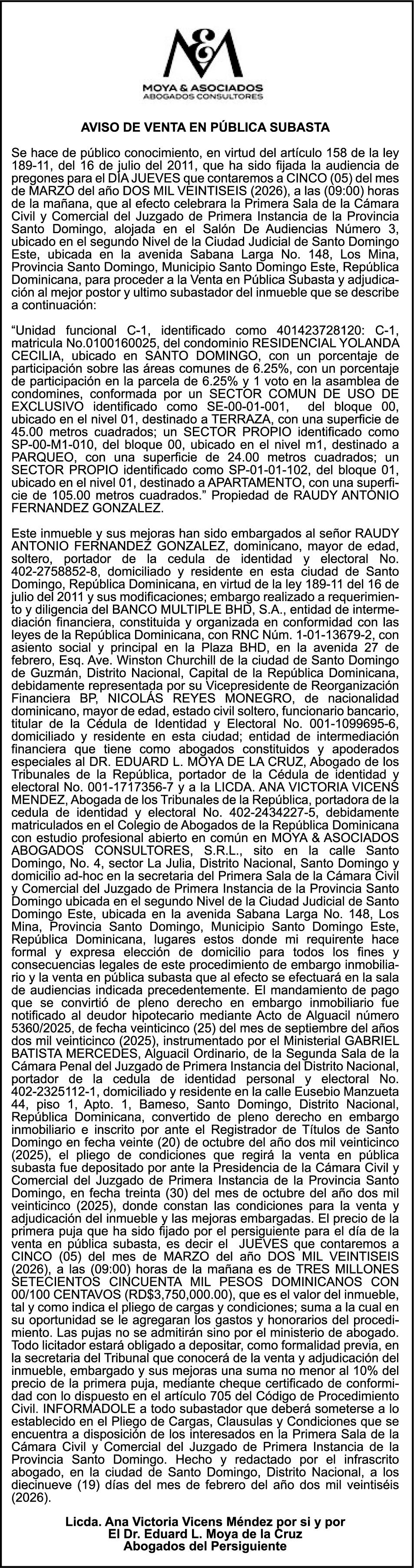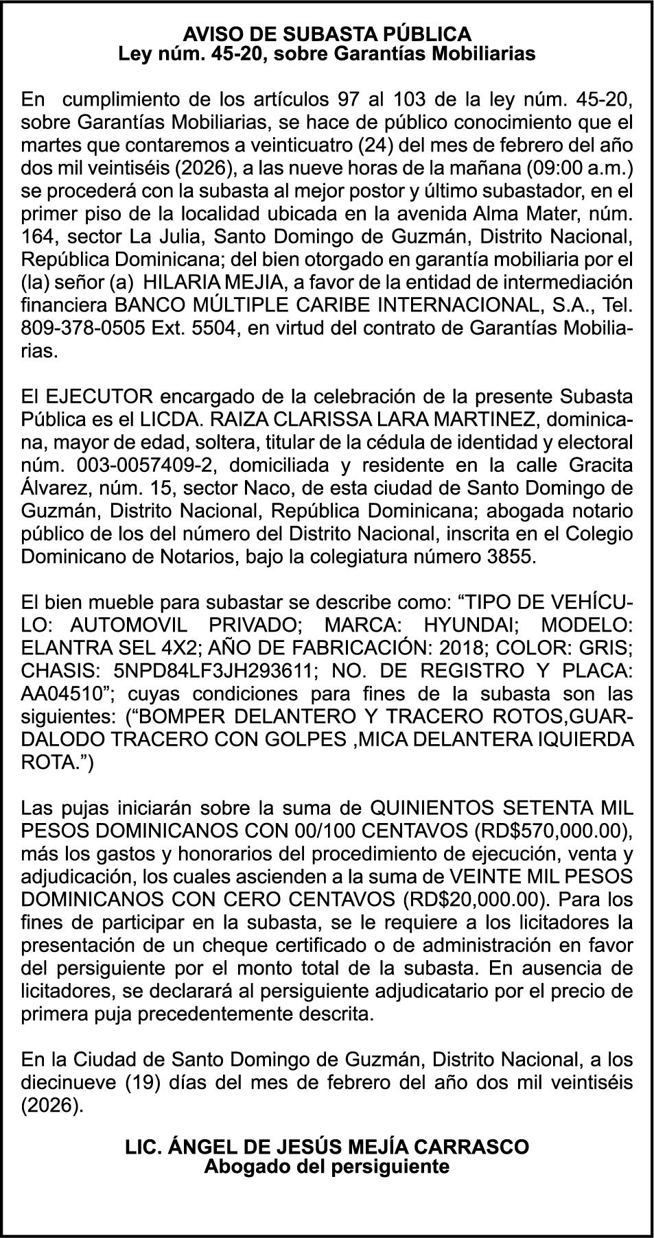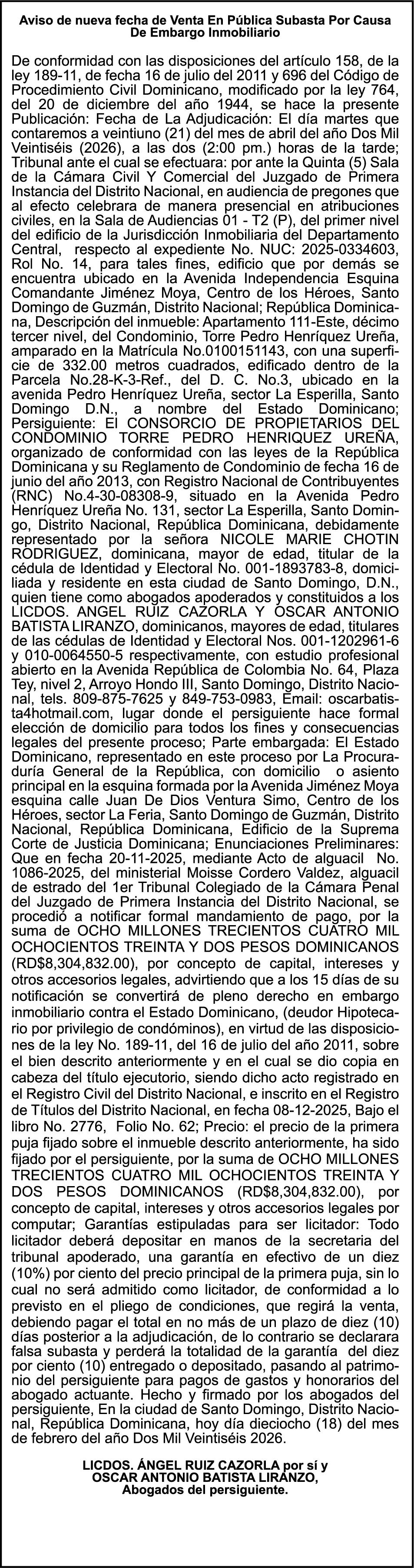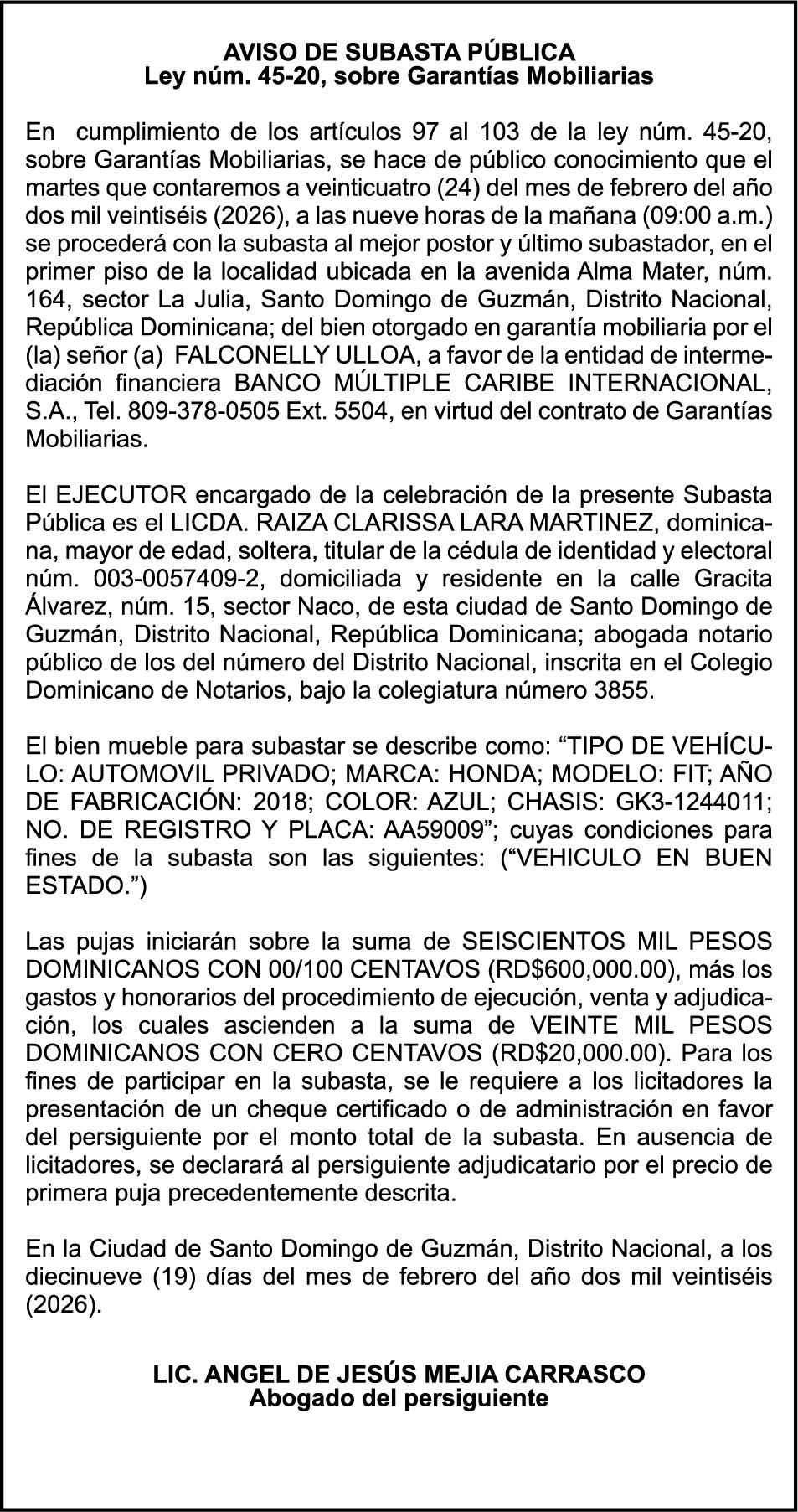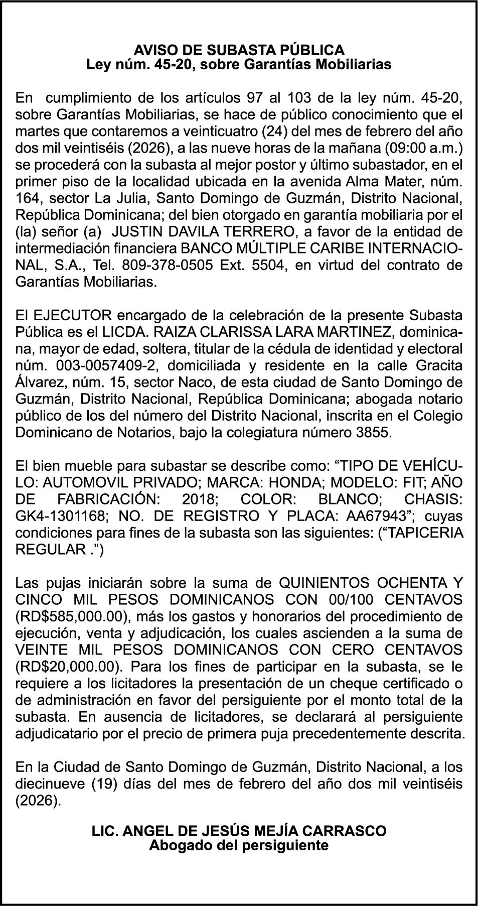 SE hace de público conocimiento la pérdida del Certificado Financiero número 853139483 emitido por Banco Popular Dominicano, S. A. Banco Múltiple, a nombre de JUNIOR ALCIDES VASQUEZ ALONZO, portador de la Cédula de Identidad y Electoral número 402-4477318-6, certificado número 853139483 expedido en fecha 3 de diciembre de 2025, por el monto de (RD$50,945.81) más intereses generados a la fecha.