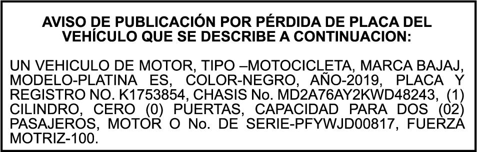 PERDIDA DE PLACA No. K1998278, Motocicleta BAJAJ, modelo PLATINA 100 ES, colro negro, año 2020, chasis MD2A76AY7LWK49432, a nombre de INVERSIONES BIDO MONTERO SRL, RNC 130940045.
