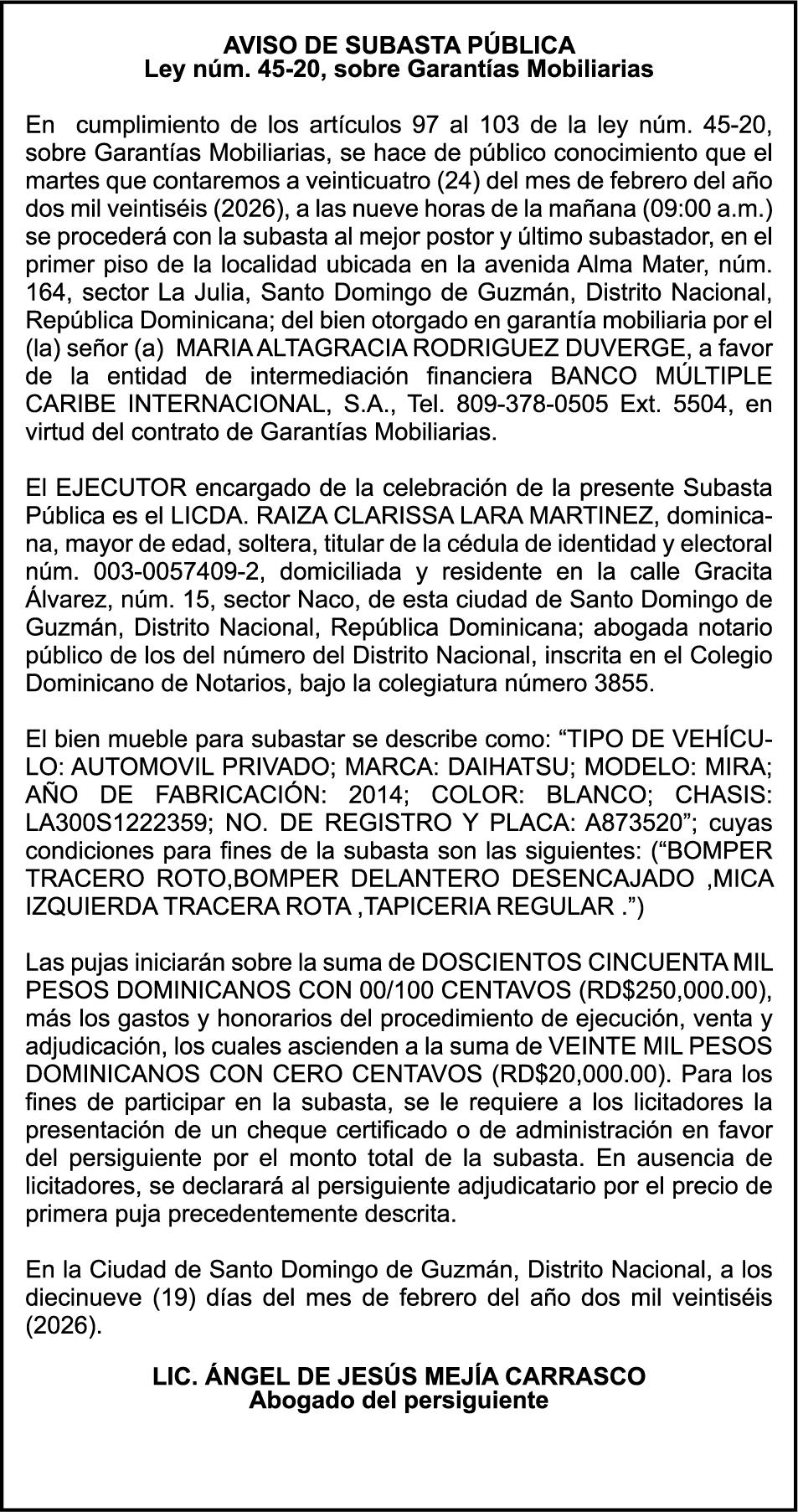 PERDIDA DE MATRICULA Veh. Carga DAIHATSU, modelo HIJET, año 2000, placa L206843, chasis S82P041602, a nombre de ALMACENES DE GRANOS DOMINICANOS, SRL.
