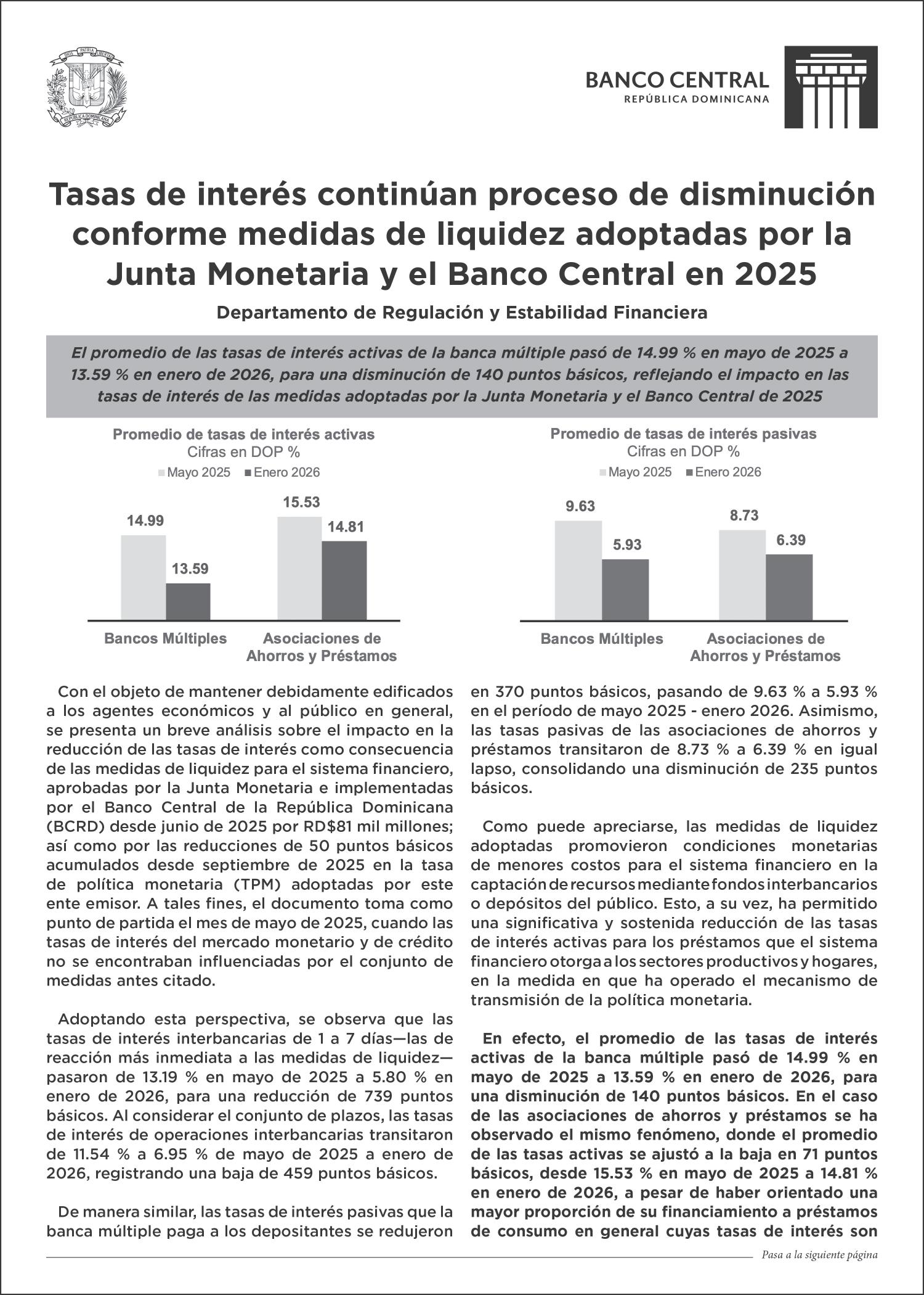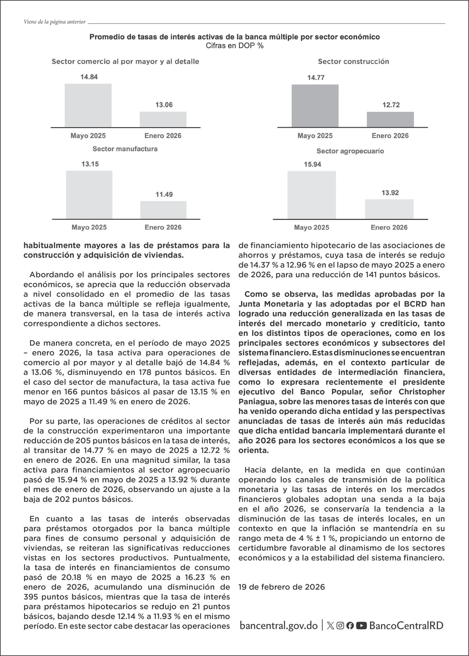 COMPORTAMIENTO. Entre mayo de 2025 y enero de 2026 el promedio de las tasas activas de la banca múltiple se redujo en 140 puntos básicos. P.26