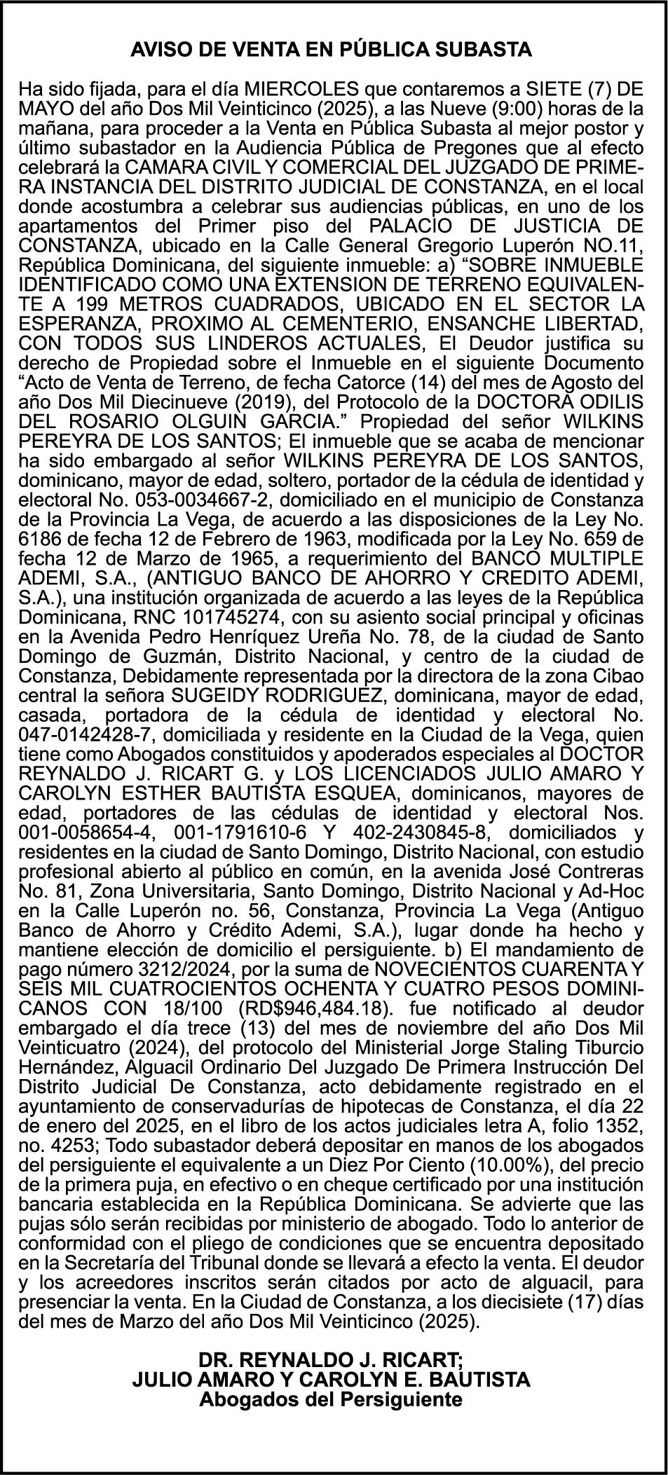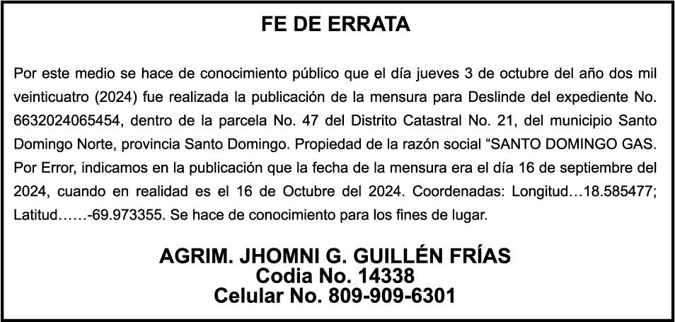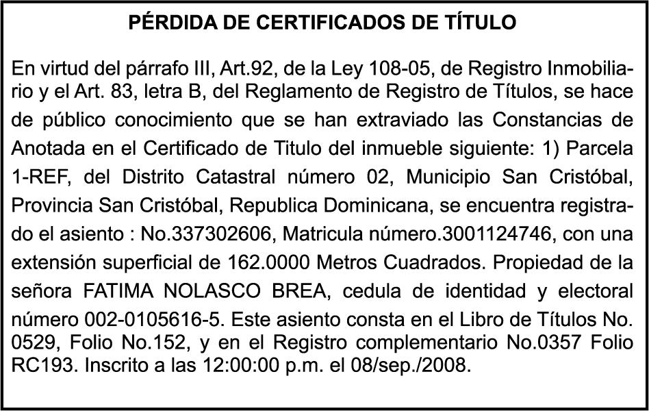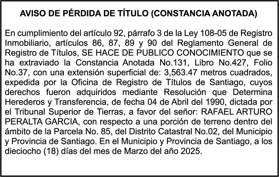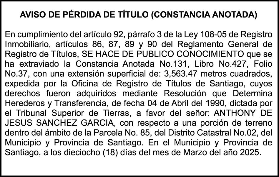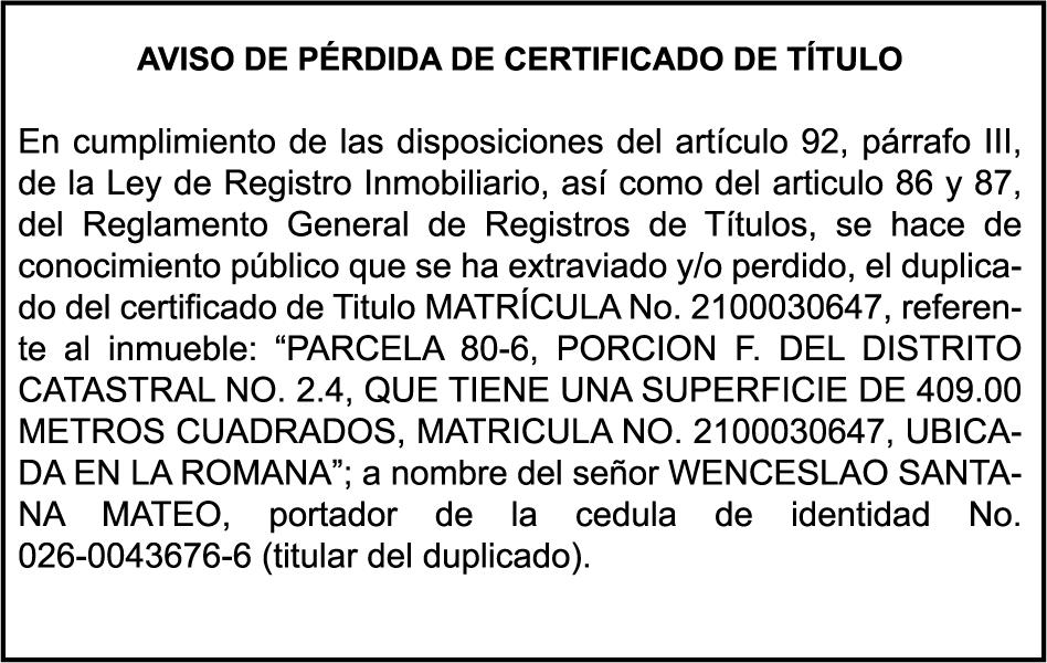 SE hace de público conocimiento la pérdida del Certificado Financiero número 842707606 emitido por Banco Popular Dominicano, S. A. Banco Múltiple, a nombre de AMANCIA CASTILLO, portadora de la Cédula de Identidad y Electoral número 023-0041971-6, certificado número 842707606 expedido en fecha 12 de julio de 2024 por el monto de (RD$2,613,807.37) más intereses generados a la fecha.