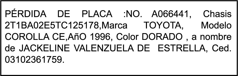 PERDIDA DE PLACA Del vehículo marca: TOYOTA , modelo: YN 80L-TRKRS , año: 1993 , color: ROJO , placa: L101924 , chasis: YN800006883 , propiedad de la Sra. TEODORA GONZALES SEVERINO.