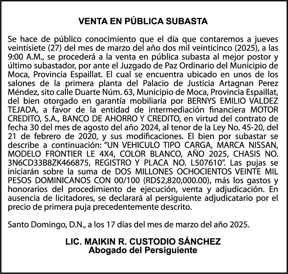 PERDIDA DE MATRICULA Veh. Carga MITSUBISHI, Color blanco, Año 2001, Placa L133794, Chasis JMYJNK3401P001173, a nombre de MARIA ALTAGRACIA ROSARIO SANCHEZ.