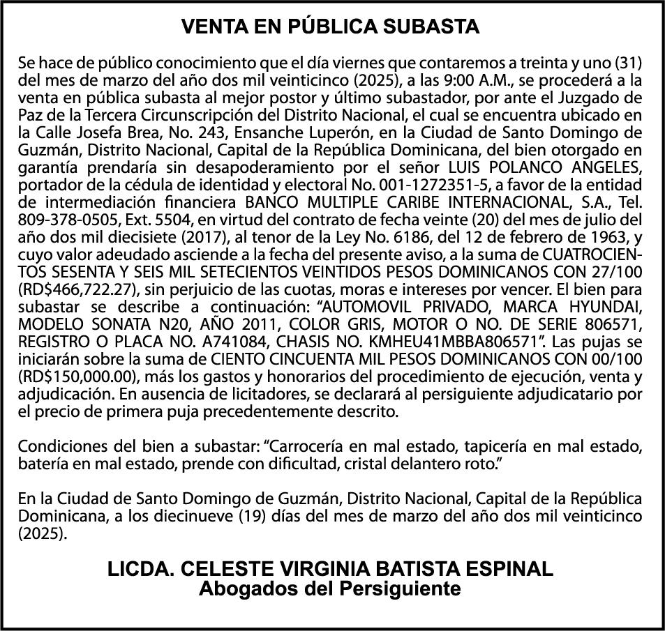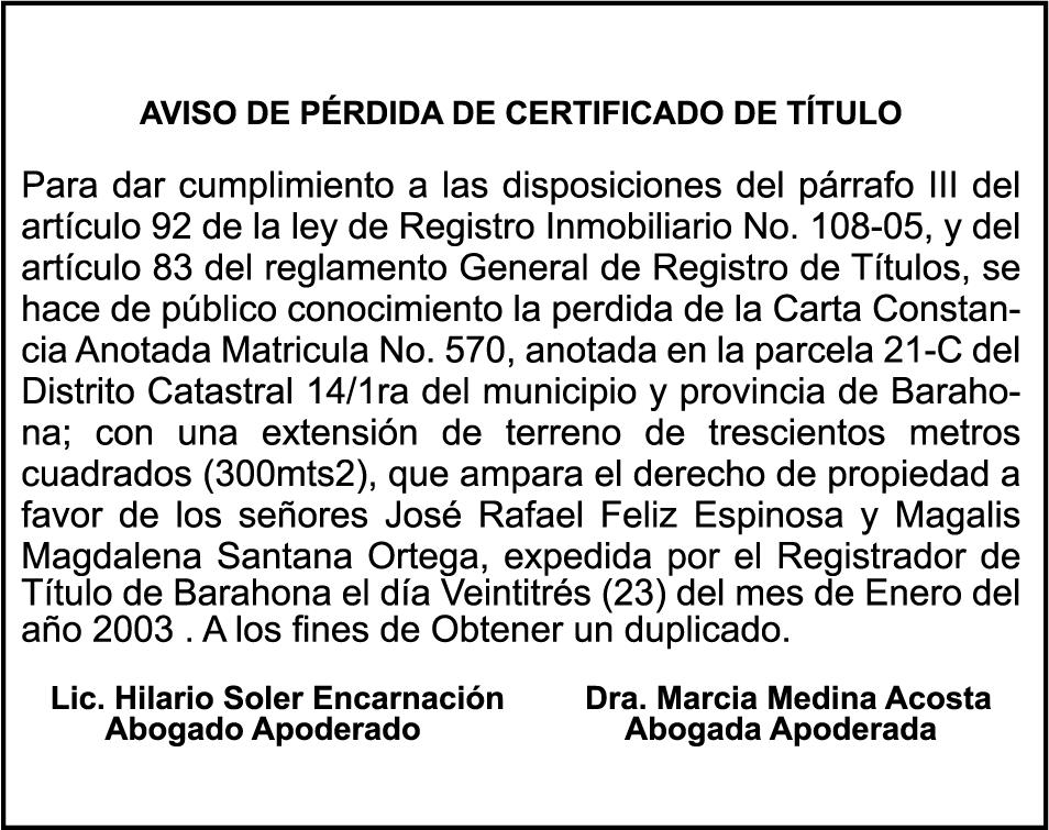 SE hace de público conocimiento la pérdida del Certificado Financiero número 790033559 emitido por Banco Popular Dominicano, S. A. Banco Múltiple, a nombre de EUSTACIA PEÑA JAVIER, portadora de la Cédula de Identidad y Electoral número 028-0040153-7, certificado número 790033559 expedido en fecha 9 de marzo de 2015 por el monto de (RD$1,000,000.00) más intereses generados a la fecha.